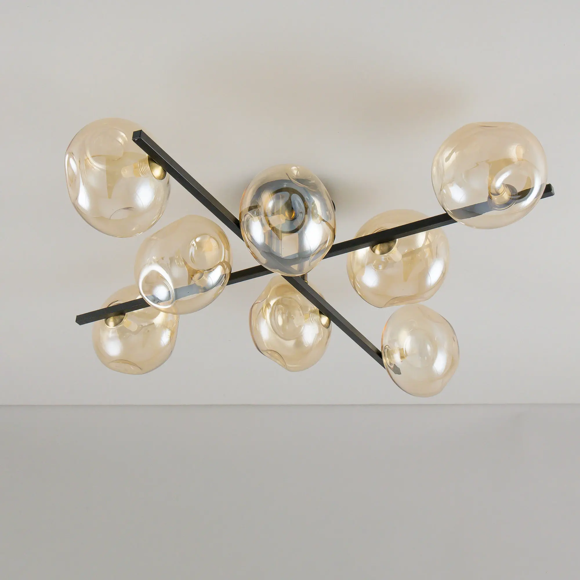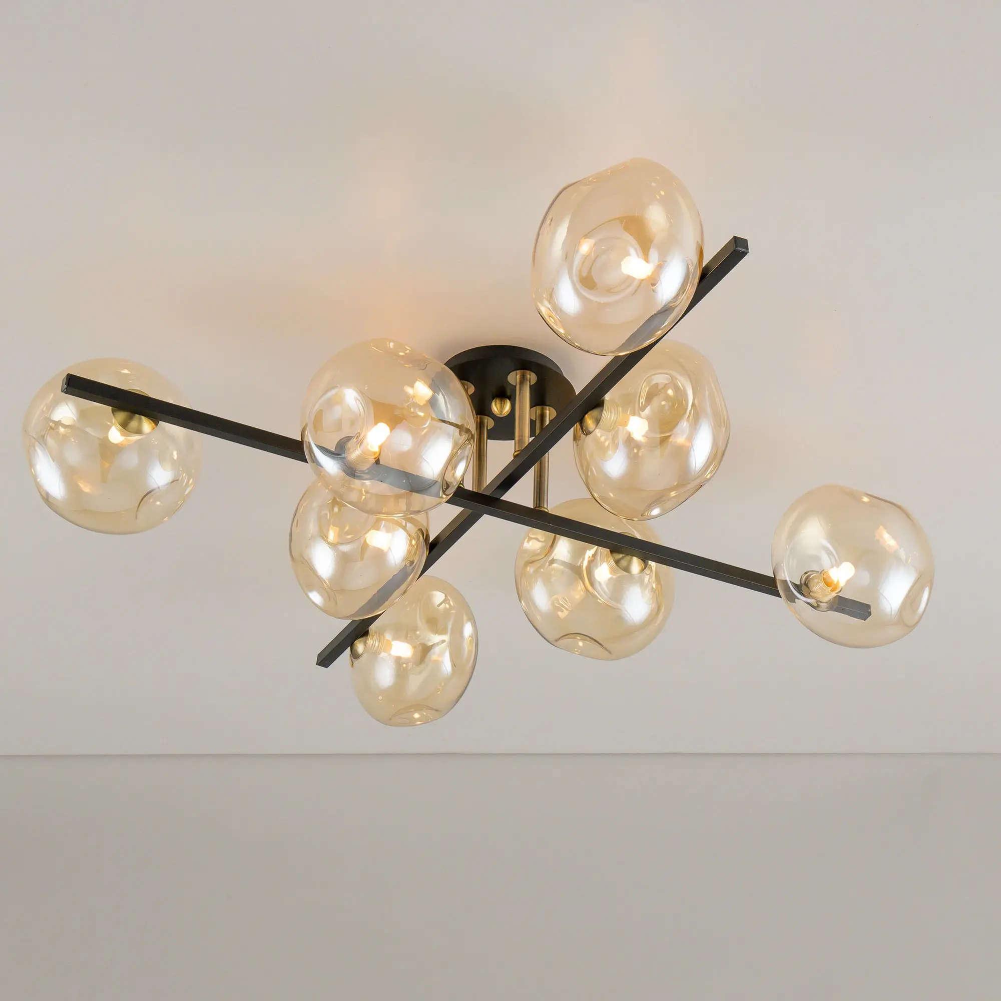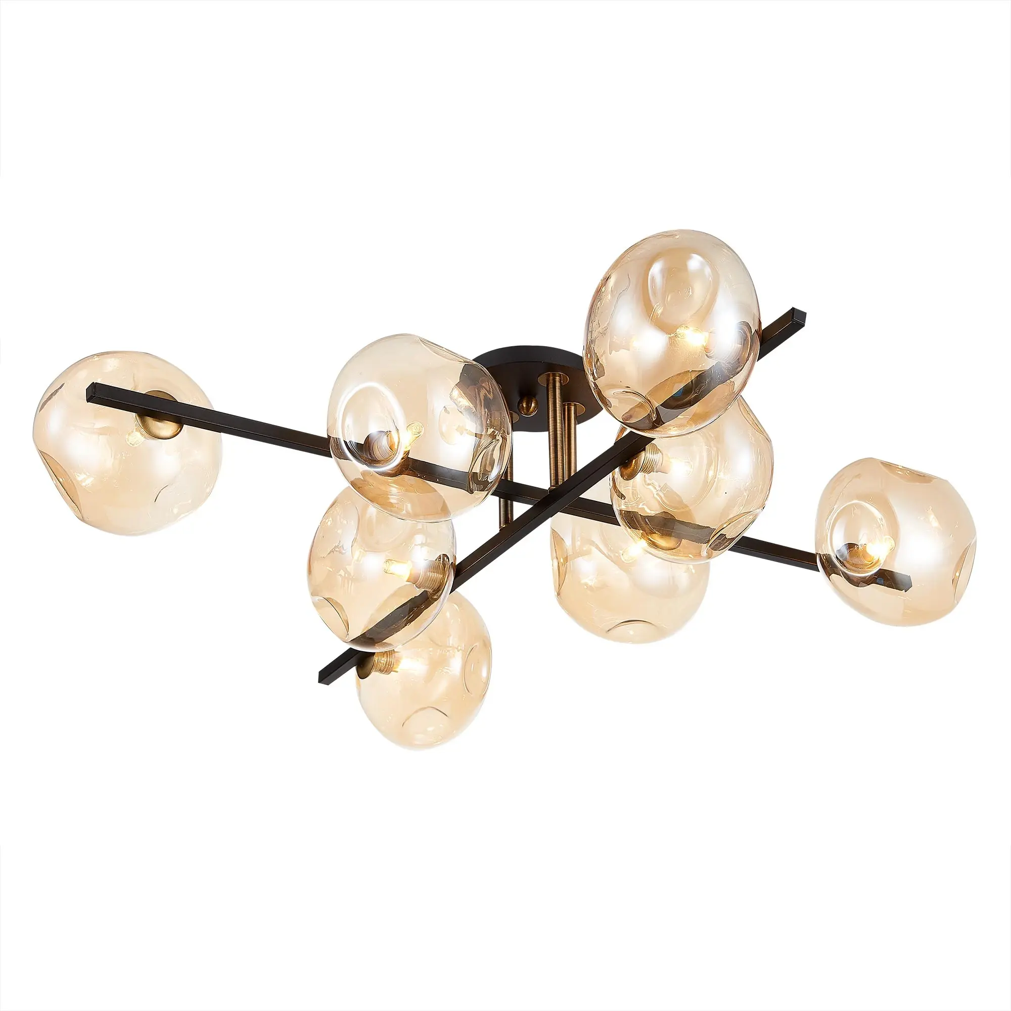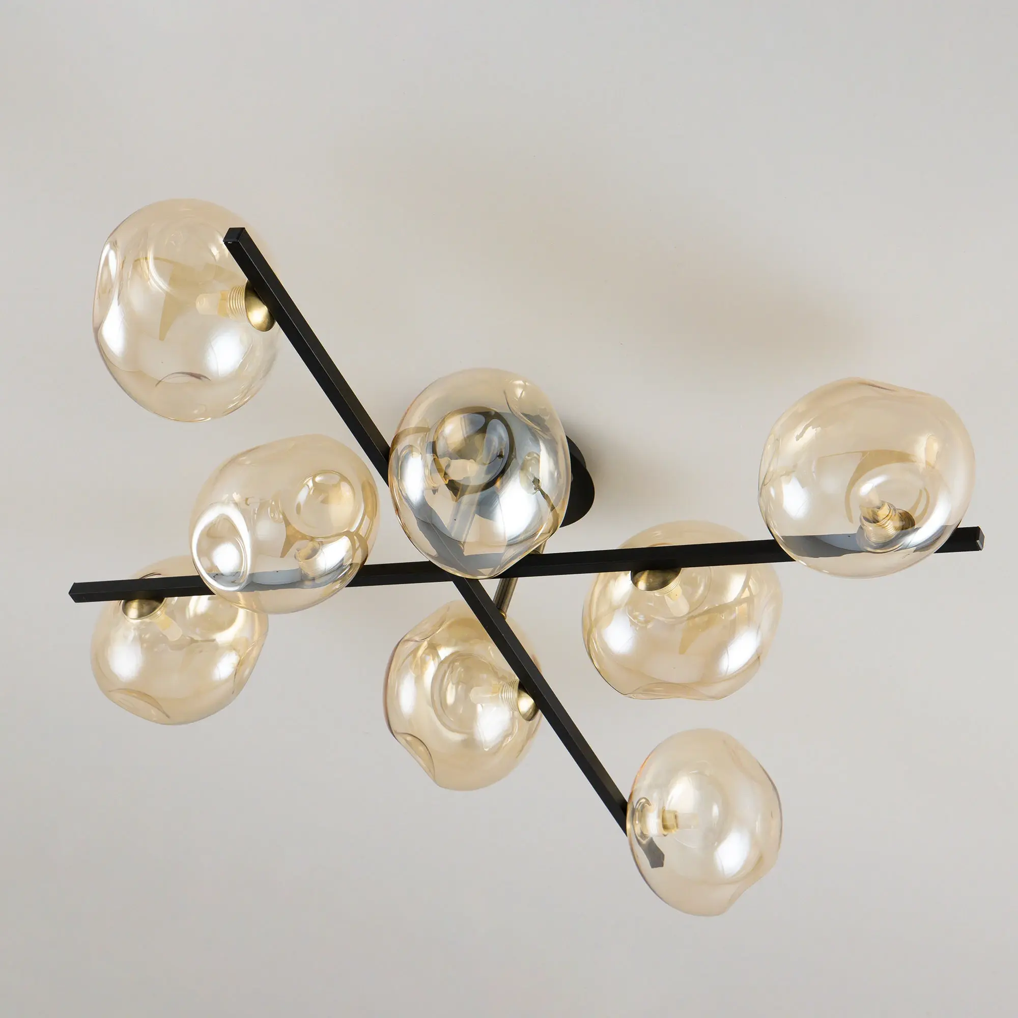 Люстра потолочная Citilux Девис CL201181. Корпус светильника металлический, коричневого цвета, с декоративными бронзовыми элементами. Основание круглой формы, рожки-штанги расположены друг к другу под прямым углом. Стеклянные прозрачные плафоны необычной формы модного оттенка шампань. В люстре восемь ламп с цоколем G9 и максимальной мощностью для галогеновых ламп 40Вт. Светодиодные лампы можно использовать более яркие. Модель подходит для всех типов потолков, в том числе натяжных. Тип крепления – планка. Площадь освещения около 19 кв. метров