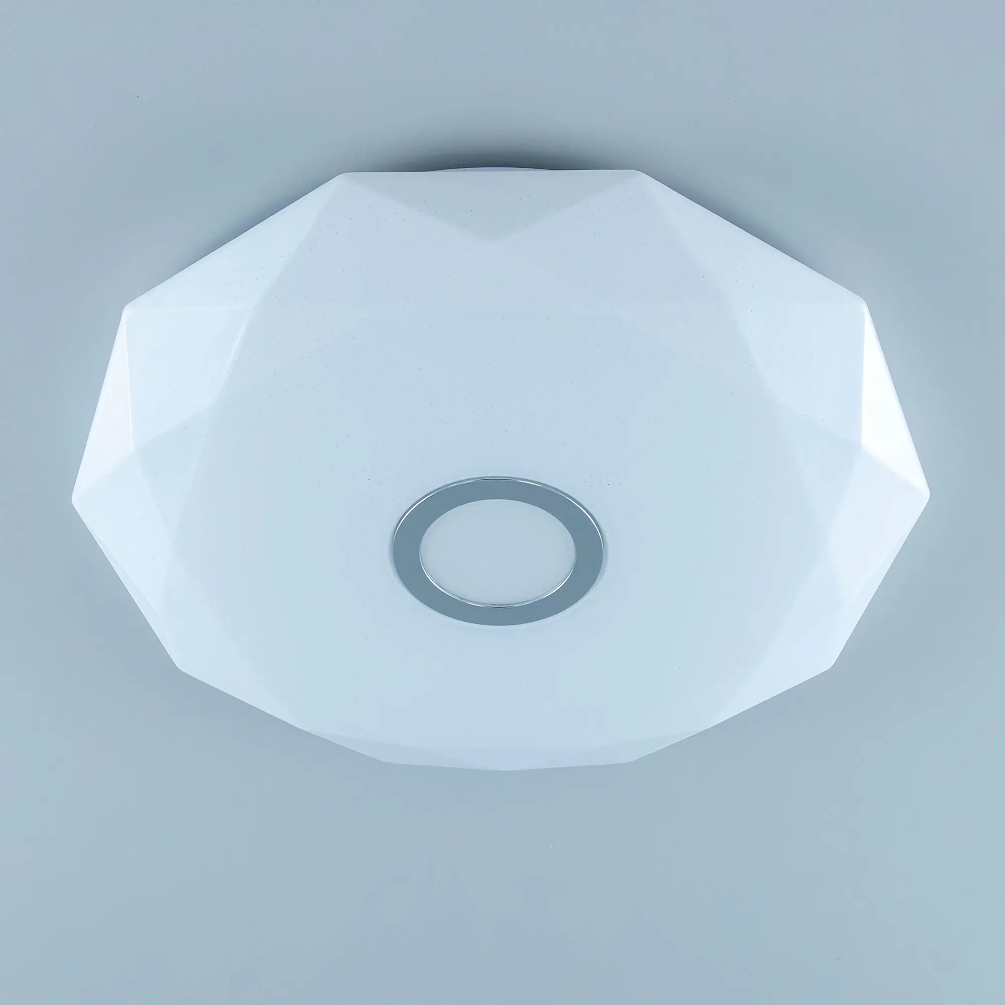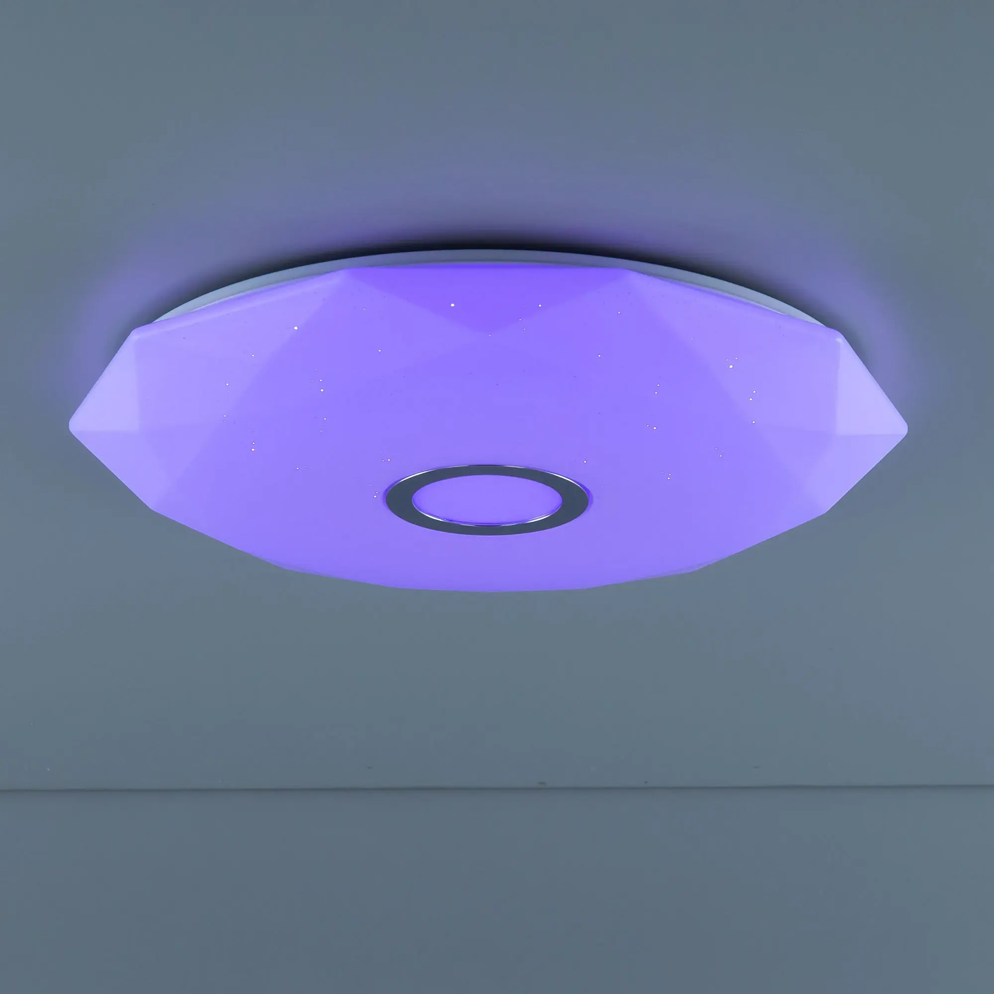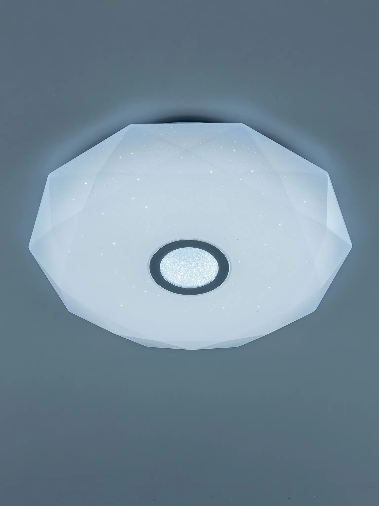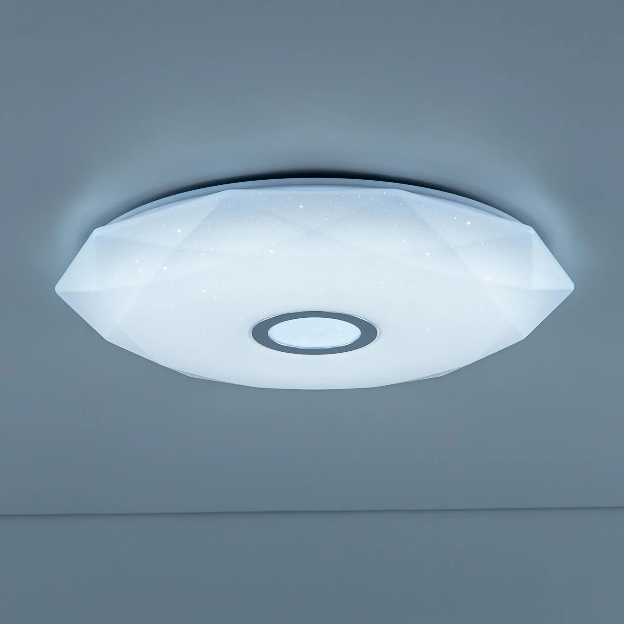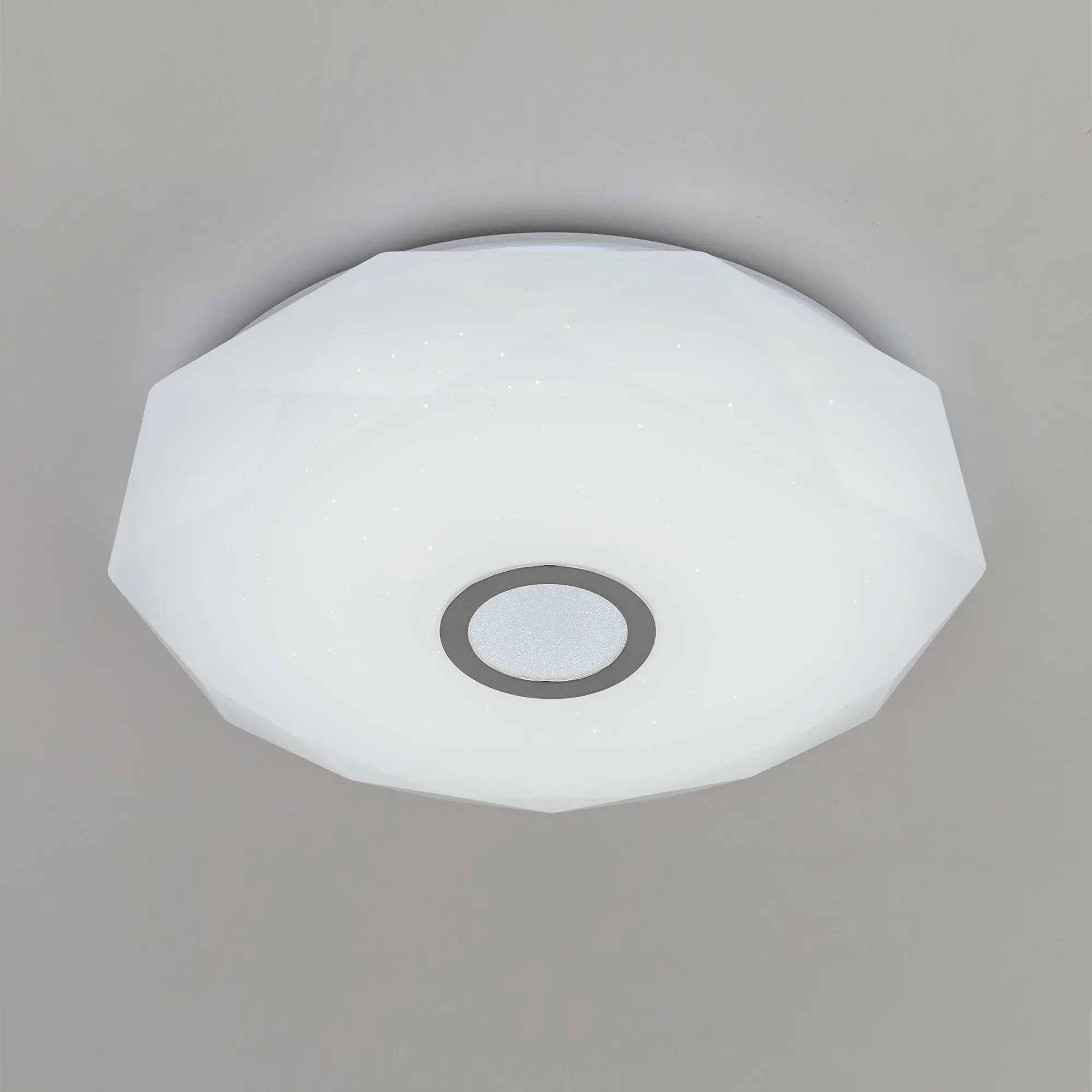 Выпускается с белым глянцевым плафоном с эффектом звездного небо и декоративным элементом в цвете хром. Светильник накладной, крепление подходит для всех типов потолков, в том числе натяжных.