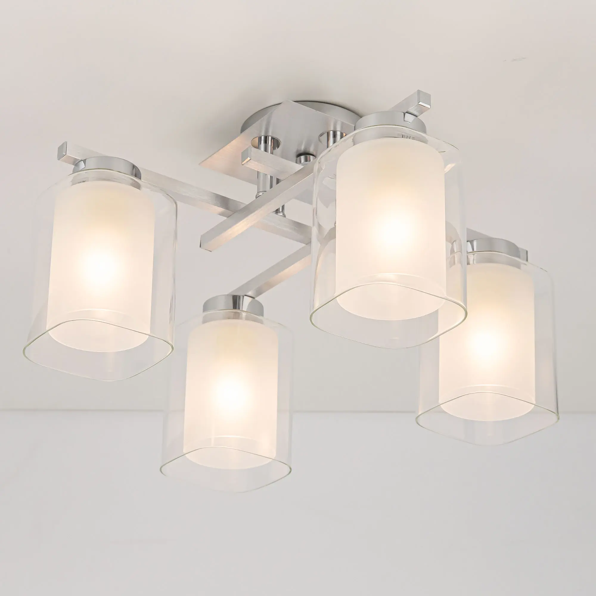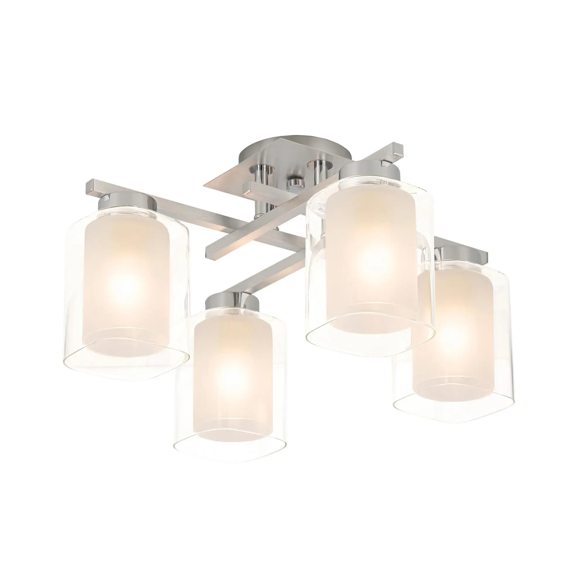 Люстра потолочная Citilux Диез CL111140 с четырьмя плафонами. Корпус металлический цвет алюминий, с декоративными хромированными элементами. Плафоны стеклянные, двойные. Внешний плафон прозрачный, в сечении имеет форму квадрата. Внутренний плафон полуматовый цилиндрической формы. Модель можно использовать как с одноклавишным, так и с двухклавишным выключателем. В светильнике используются лампы с цоколем Е27 и максимальной мощностью для ламп накаливания 75 Вт. Суммарная мощность 300Вт. Светодиодные лампы можно использовать более яркие. Площадь освещения около 13 кв. метров. Тип крепления люстры к потолку – планка, крепеж в комплекте. Модель отлично подойдет для освещения пространств, оформленных в современном стиле.,