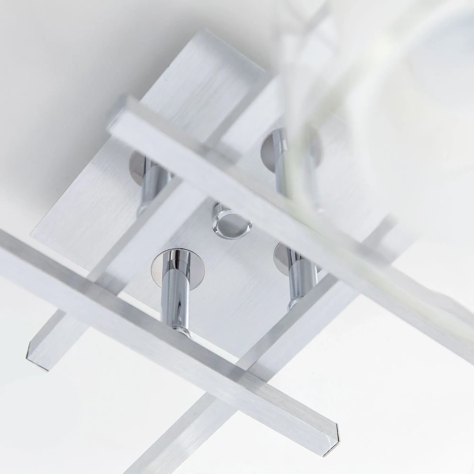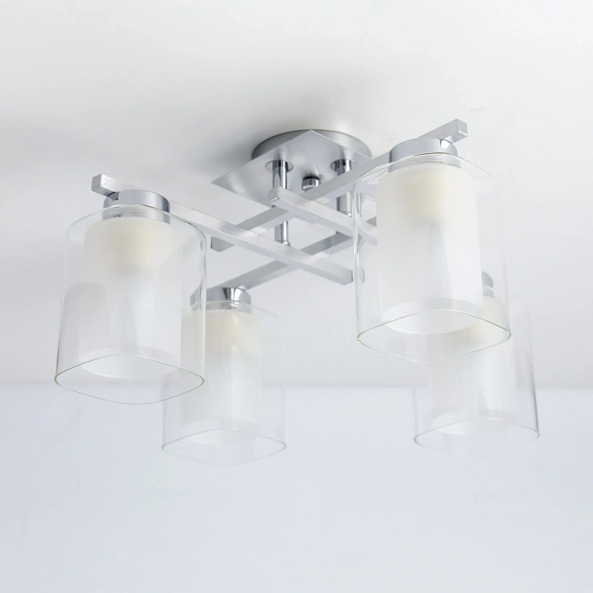 Люстра потолочная Citilux Диез CL111140 с четырьмя плафонами. Корпус металлический цвет алюминий, с декоративными хромированными элементами. Плафоны стеклянные, двойные. Внешний плафон прозрачный, в сечении имеет форму квадрата. Внутренний плафон полуматовый цилиндрической формы. Модель можно использовать как с одноклавишным, так и с двухклавишным выключателем. В светильнике используются лампы с цоколем Е27 и максимальной мощностью для ламп накаливания 75 Вт. Суммарная мощность 300Вт. Светодиодные лампы можно использовать более яркие. Площадь освещения около 13 кв. метров. Тип крепления люстры к потолку – планка, крепеж в комплекте. Модель отлично подойдет для освещения пространств, оформленных в современном стиле,