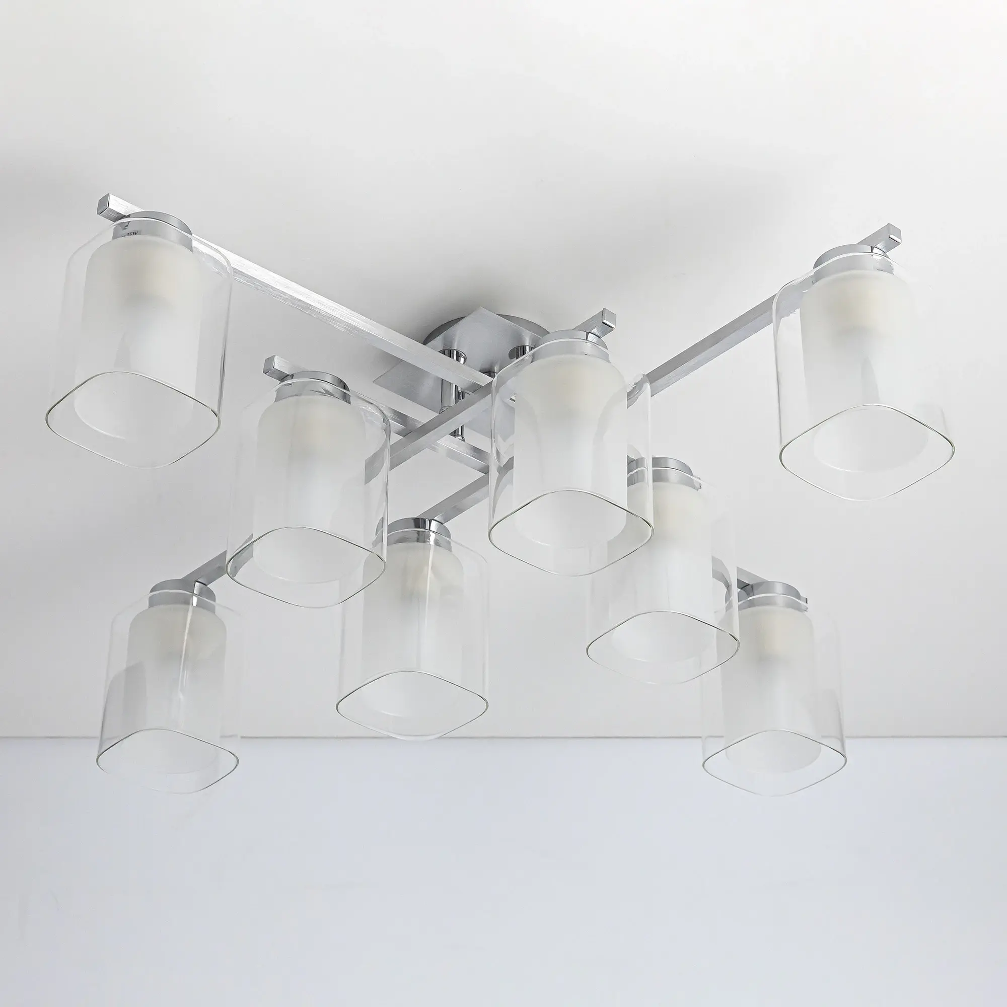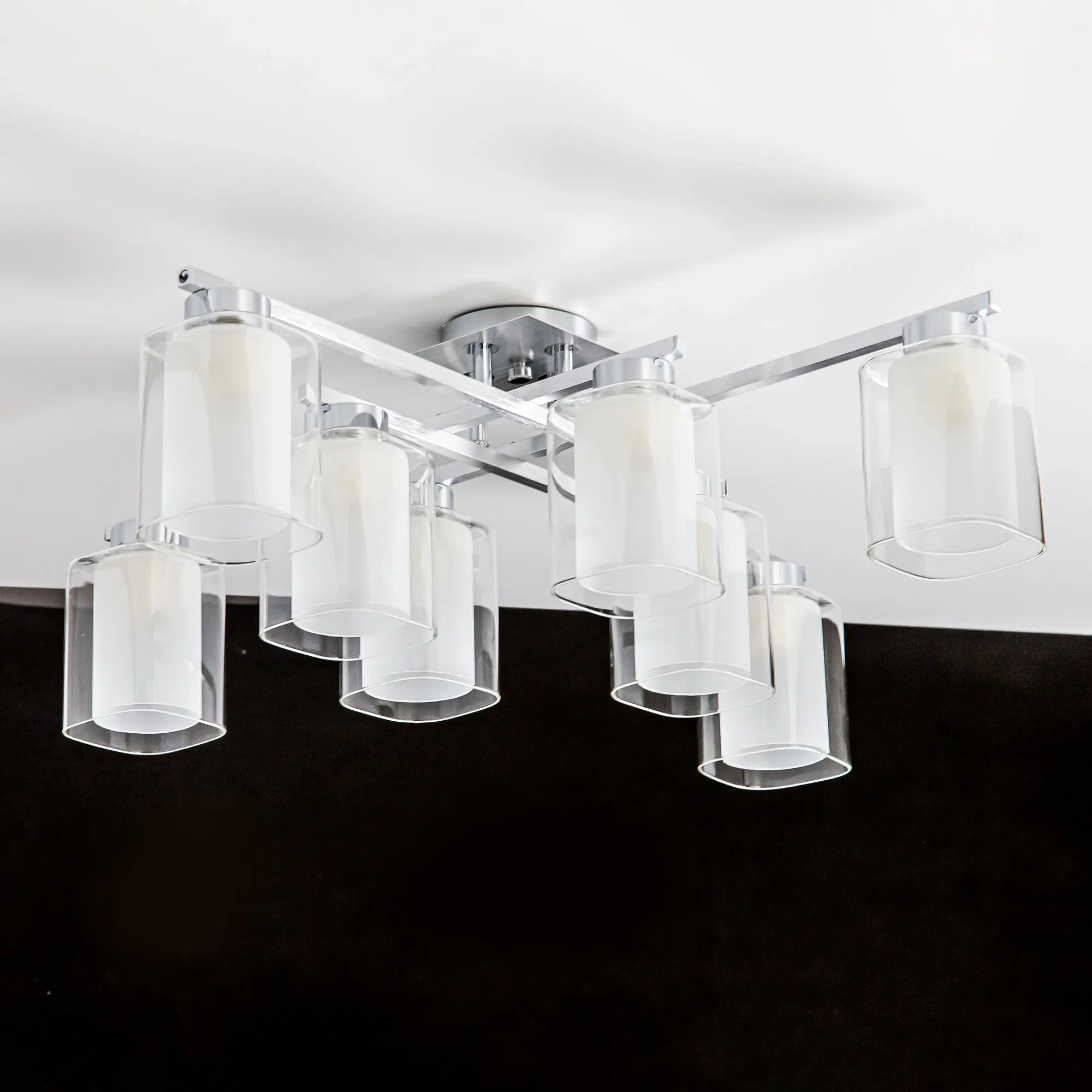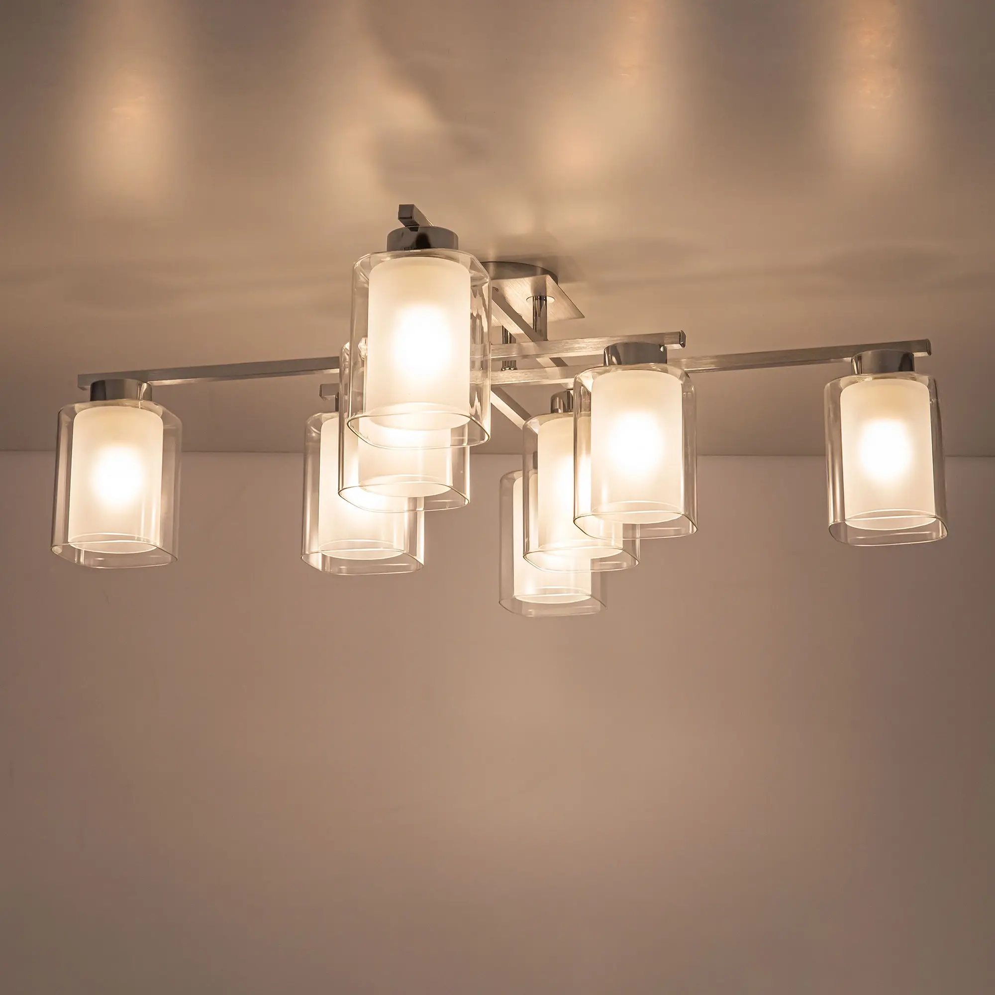 Люстра потолочная Citilux Диез CL111180 на восемь плафонов. Корпус металлический, цвет алюминий, с декоративными хромированными элементами. Плафоны стеклянные, двойные. Внешний плафон прозрачный, в сечении имеет форму квадрата. Внутренний плафон полуматовый цилиндрической формы. Модель можно использовать как с одноклавишным, так и с двухклавишным выключателем. В светильнике используются 8 ламп с цоколем Е27 и максимальной мощностью для ламп накаливания 75 Вт. Суммарная мощность 600Вт. Светодиодные лампы можно использовать более яркие. Площадь освещения около 24 кв. метров. Тип крепления люстры к потолку – планка, крепеж в комплекте. Модель отлично подойдет для освещения гостиной, зала или спальни, оформленных в современном стиле.,