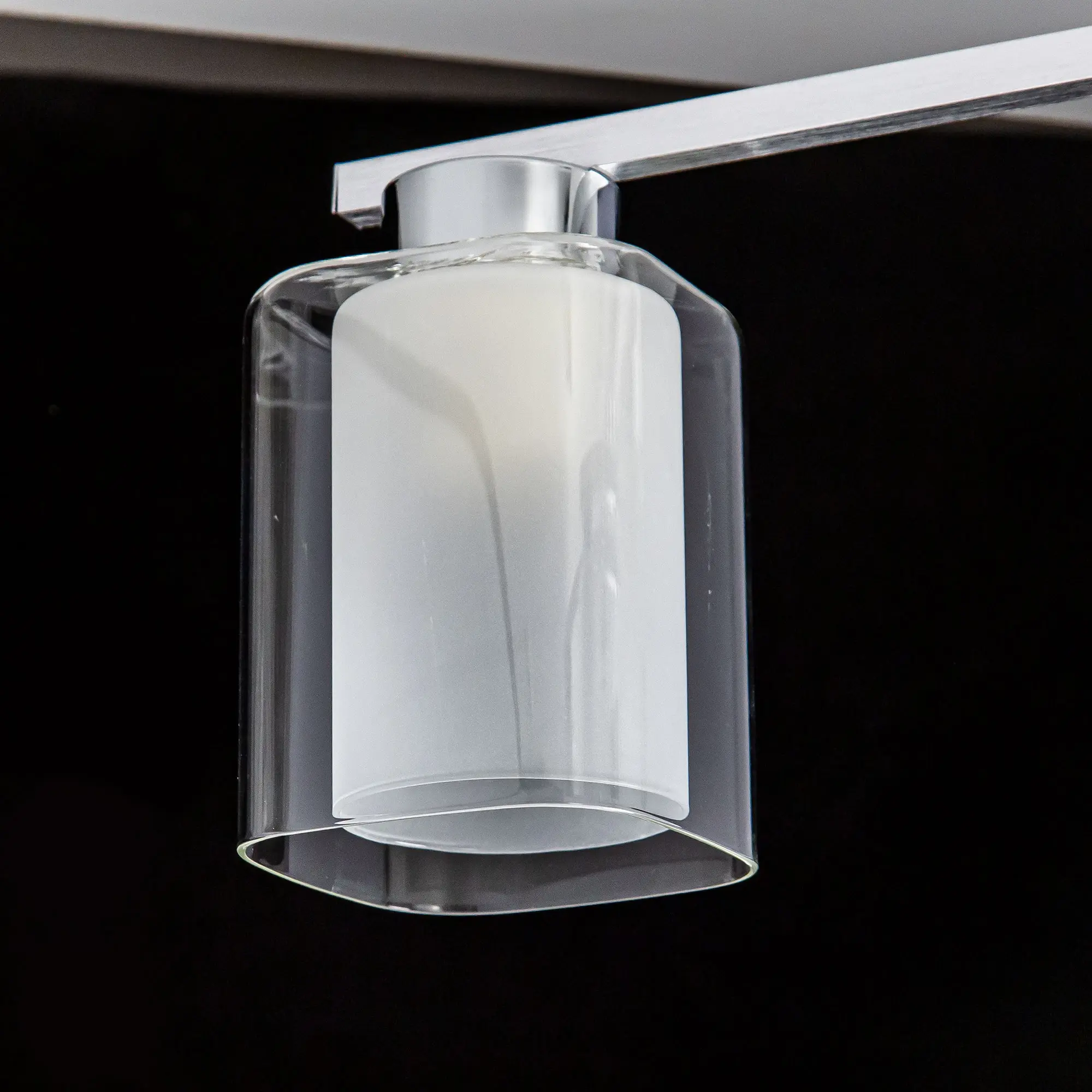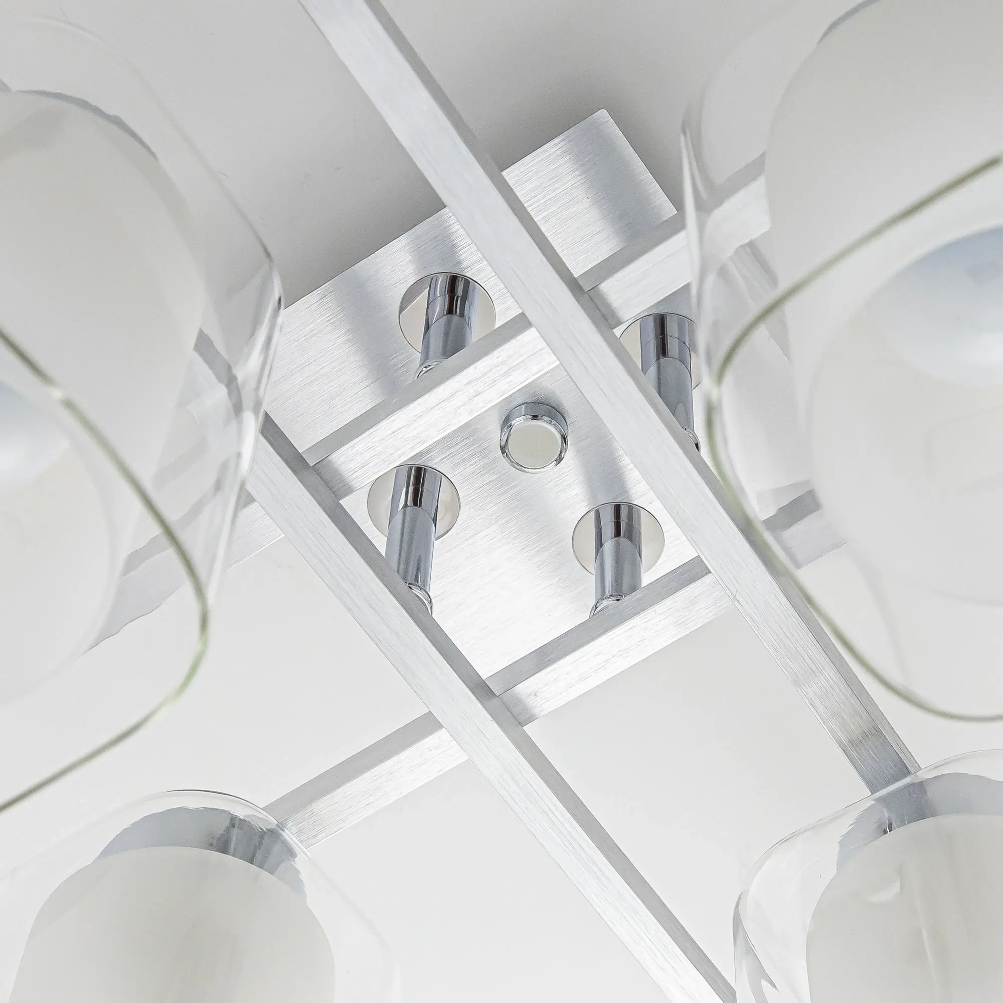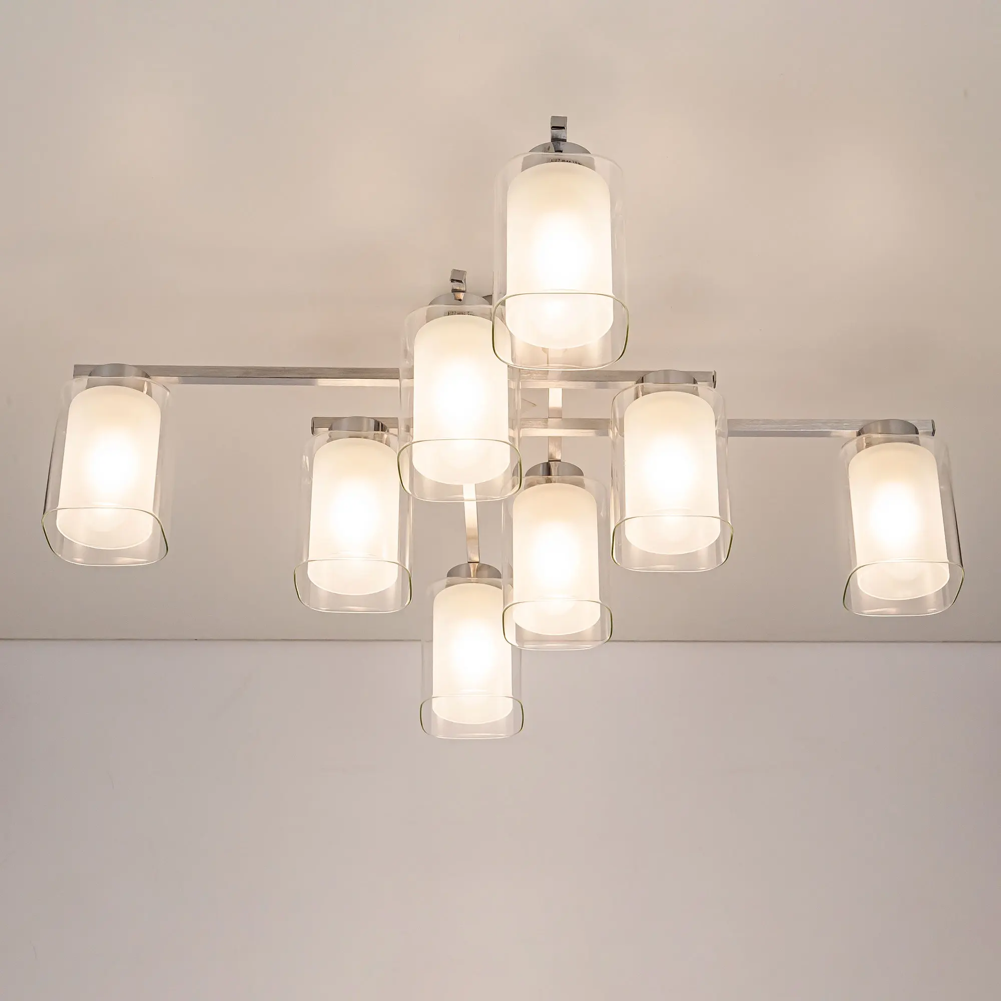 Люстра потолочная Citilux Диез CL111180 на восемь плафонов. Корпус металлический, цвет алюминий, с декоративными хромированными элементами. Плафоны стеклянные, двойные. Внешний плафон прозрачный, в сечении имеет форму квадрата. Внутренний плафон полуматовый цилиндрической формы. Модель можно использовать как с одноклавишным, так и с двухклавишным выключателем. В светильнике используются 8 ламп с цоколем Е27 и максимальной мощностью для ламп накаливания 75 Вт. Суммарная мощность 600Вт. Светодиодные лампы можно использовать более яркие. Площадь освещения около 24 кв. метров. Тип крепления люстры к потолку – планка, крепеж в комплекте. Модель отлично подойдет для освещения гостиной, зала или спальни, оформленных в современном стиле.,