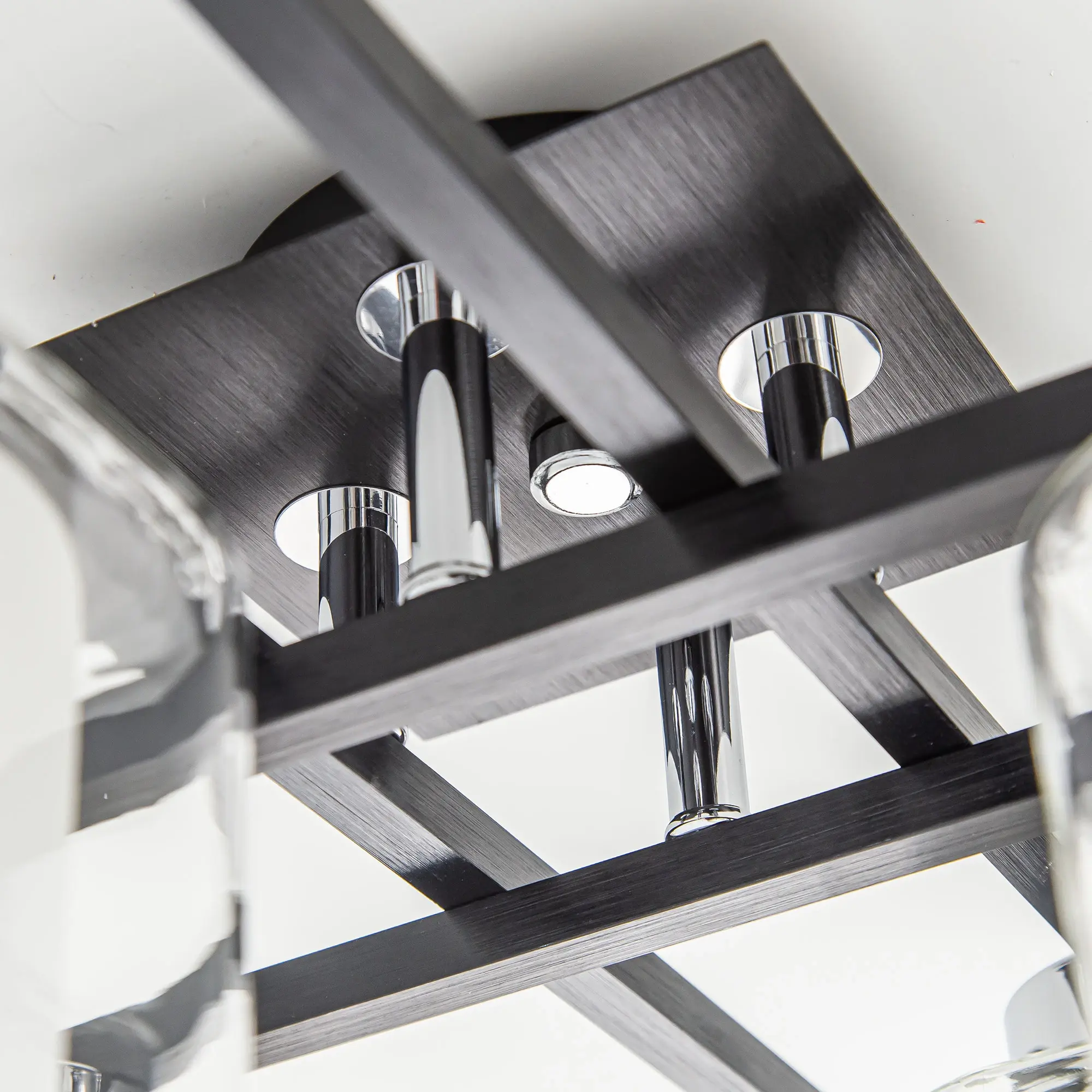 Люстра потолочная Citilux Диез CL111181 на восемь плафонов. Корпус металлический, черного цвета, с декоративными хромированными элементами. Плафоны стеклянные, двойные. Внешний плафон прозрачный, в сечении имеет форму квадрата. Внутренний плафон полуматовый цилиндрической формы. Модель можно использовать как с одноклавишным, так и с двухклавишным выключателем. В светильнике используются 8 ламп с цоколем Е27 и максимальной мощностью для ламп накаливания 75 Вт. Суммарная мощность 600Вт. Светодиодные лампы можно использовать более яркие. Площадь освещения около 24 кв. метров. Тип крепления люстры к потолку – планка, крепеж в комплекте. Модель отлично подойдет для освещения гостиной, зала или спальни, оформленных в современном стиле.,