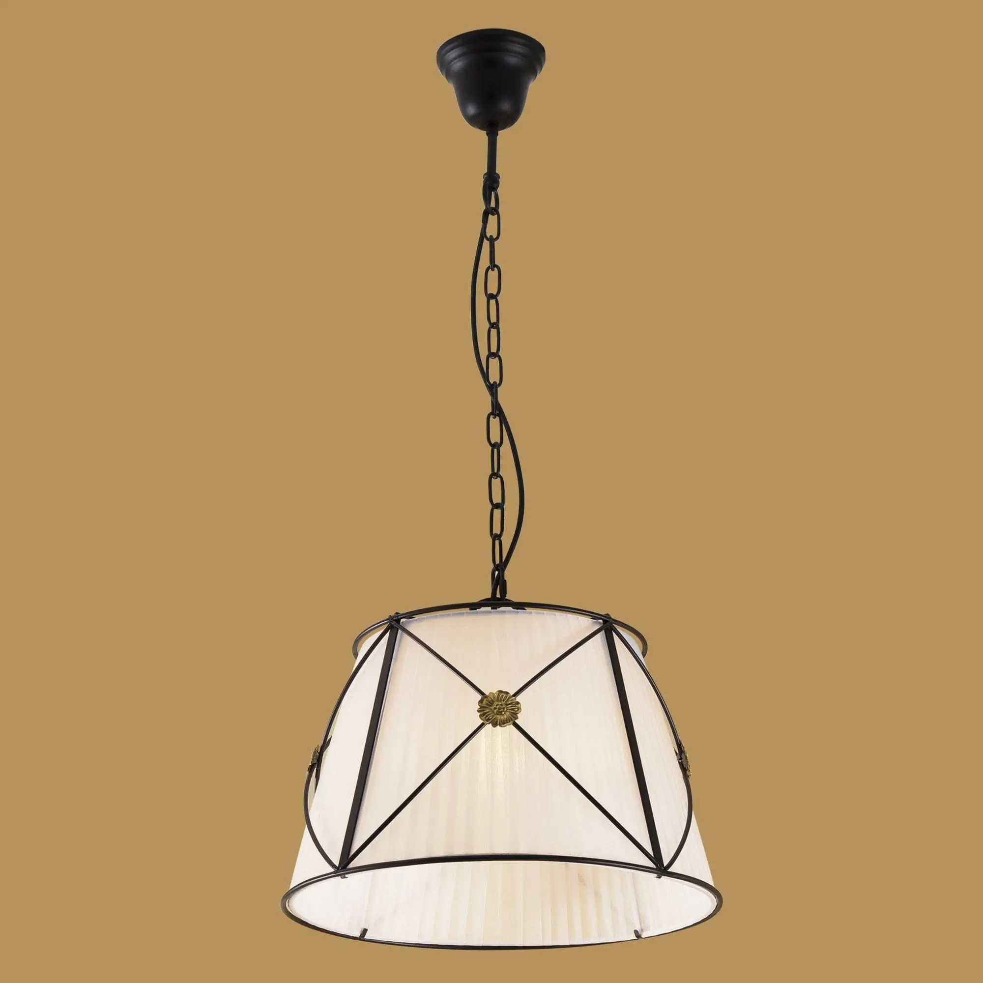 Каркас изделия — металлический, модного кофейного оттенка. Абажур традиционной формы диаметром 40см изготовлен из плиссированной ткани стильного белого цвета, украшен винтажным металлическим декором.