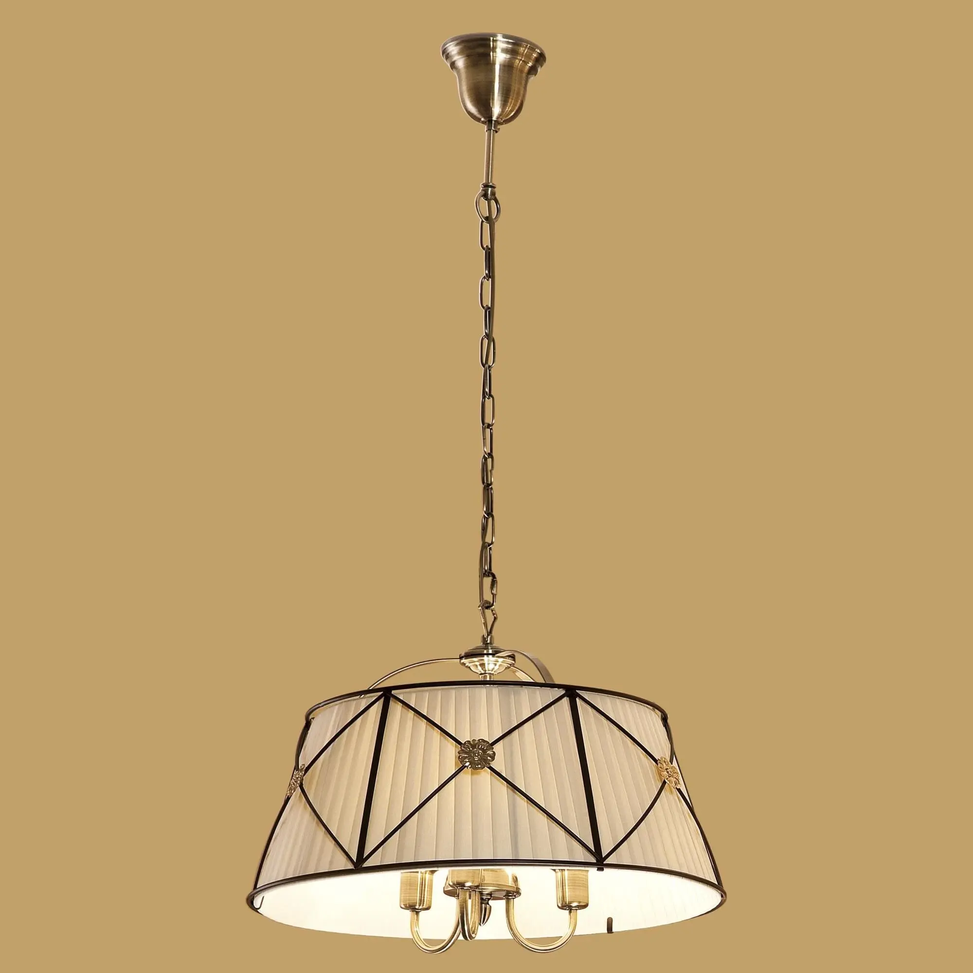 Каркас изделия — металлический, благородного бронзового оттенка. Общий абажур традиционной формы диаметром 52см изготовлен из плиссированной ткани стильного бежевого цвета, украшен винтажным металлическим декором.