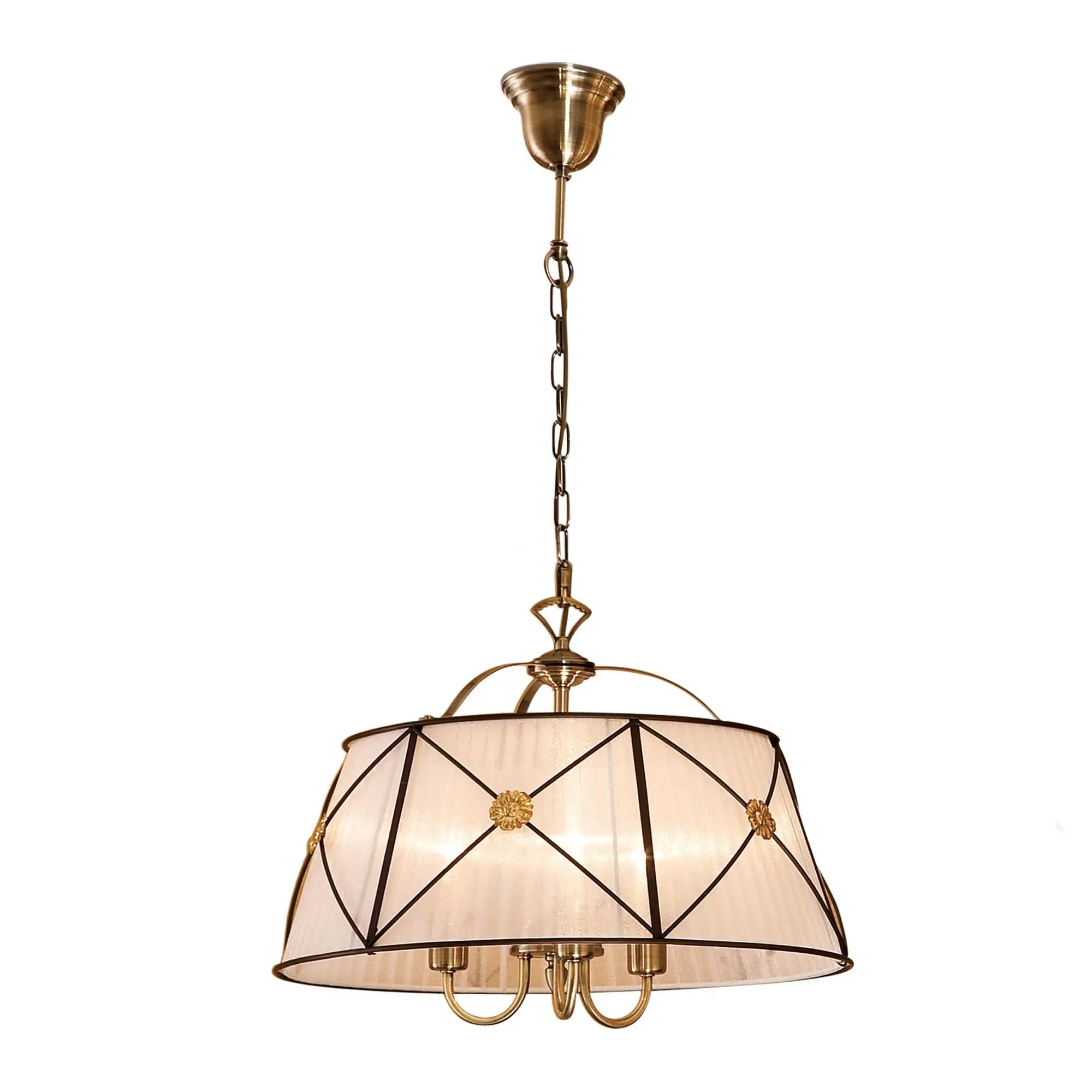 Каркас изделия — металлический, благородного бронзового оттенка. Общий абажур традиционной формы диаметром 52см изготовлен из плиссированной ткани стильного белого цвета, украшен винтажным металлическим декором.