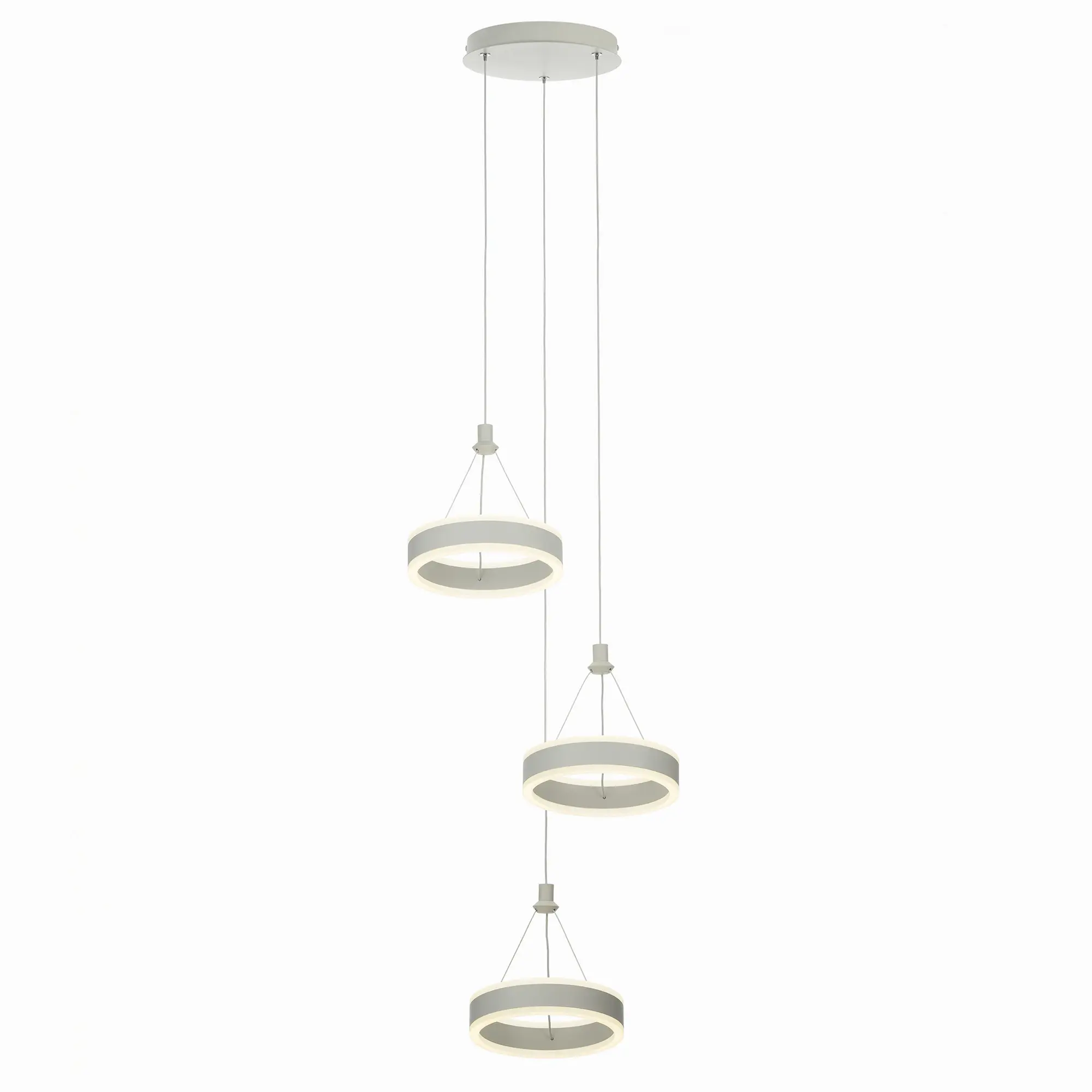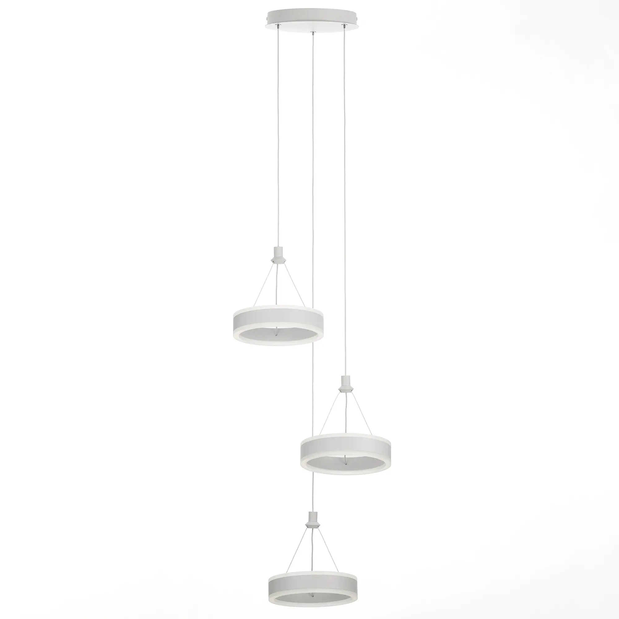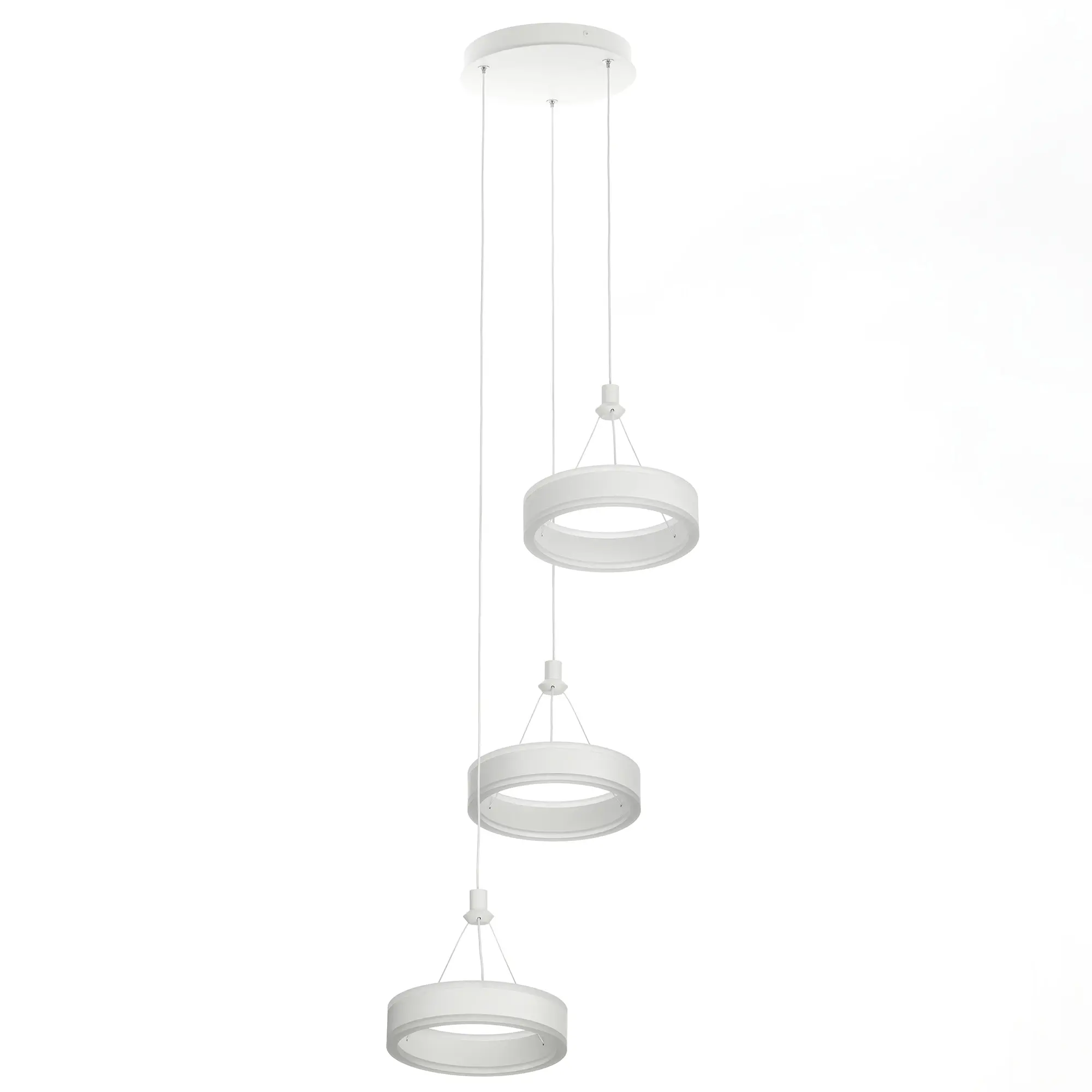 Светодиодный каскадный светильник Citilux Дуэт CL719030 выполнен в современном стиле. Корпус металлический, цвет белый матовый. Светильник состоит из круглого основания и трёх подвесных колец. Кольцо - светодиодный модуль, изготовленный из алюминиевого профиля, рассеиватель из оптического полимера. Наличие источников света с двух сторон профиля позволяет равномерно осветить всё помещение.