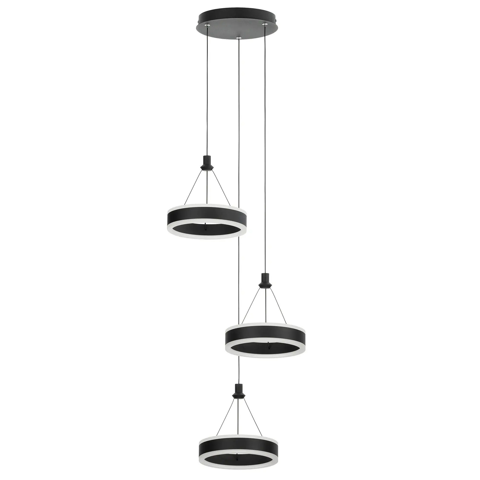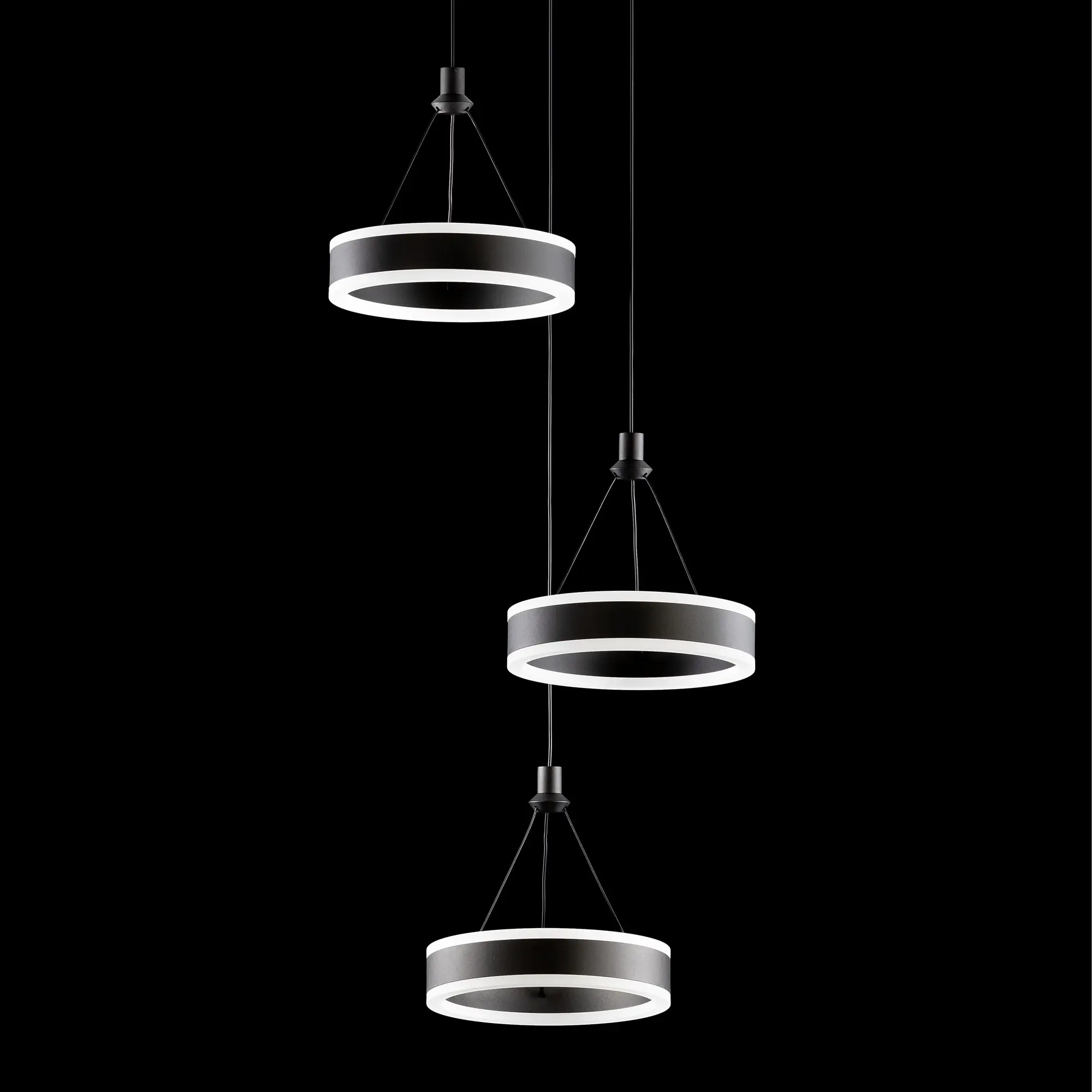 Светодиодный каскадный светильник Citilux Дуэт CL719031 выполнен в современном стиле. Корпус металлический, цвет чёрный матовый. Светильник состоит из круглого основания и трёх подвесных колец. Кольцо - светодиодный модуль, изготовленный из алюминиевого профиля, рассеиватель из оптического полимера. Наличие источников света с двух сторон профиля позволяет равномерно осветить всё помещение.
