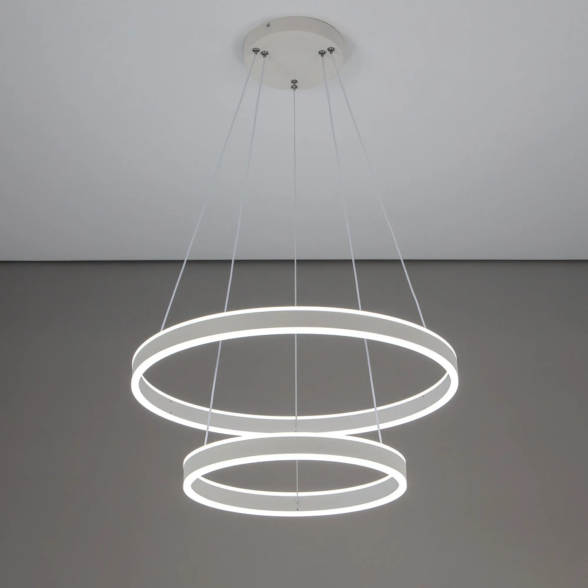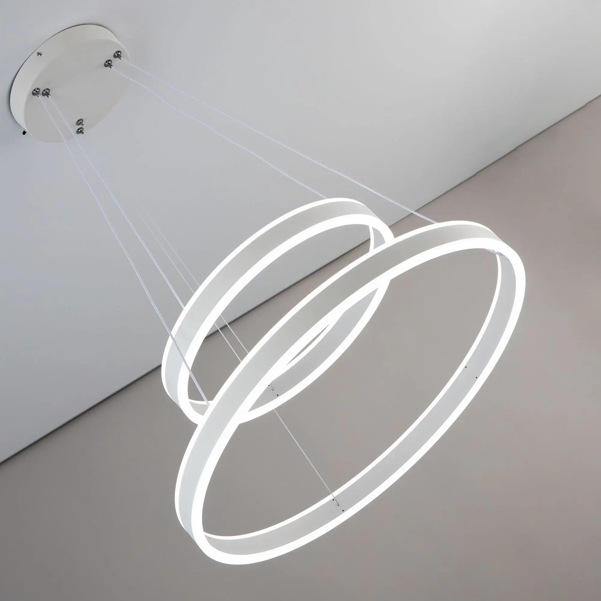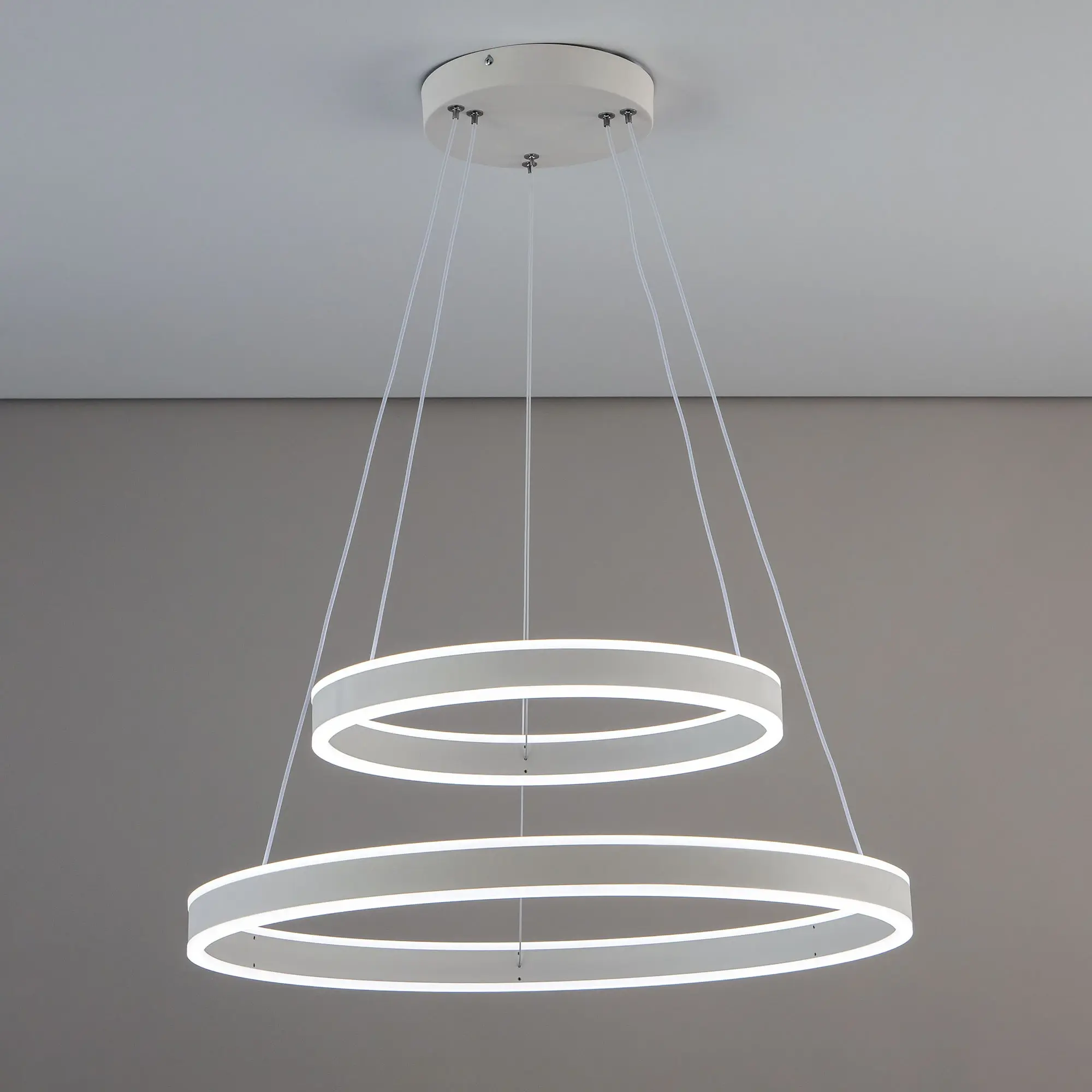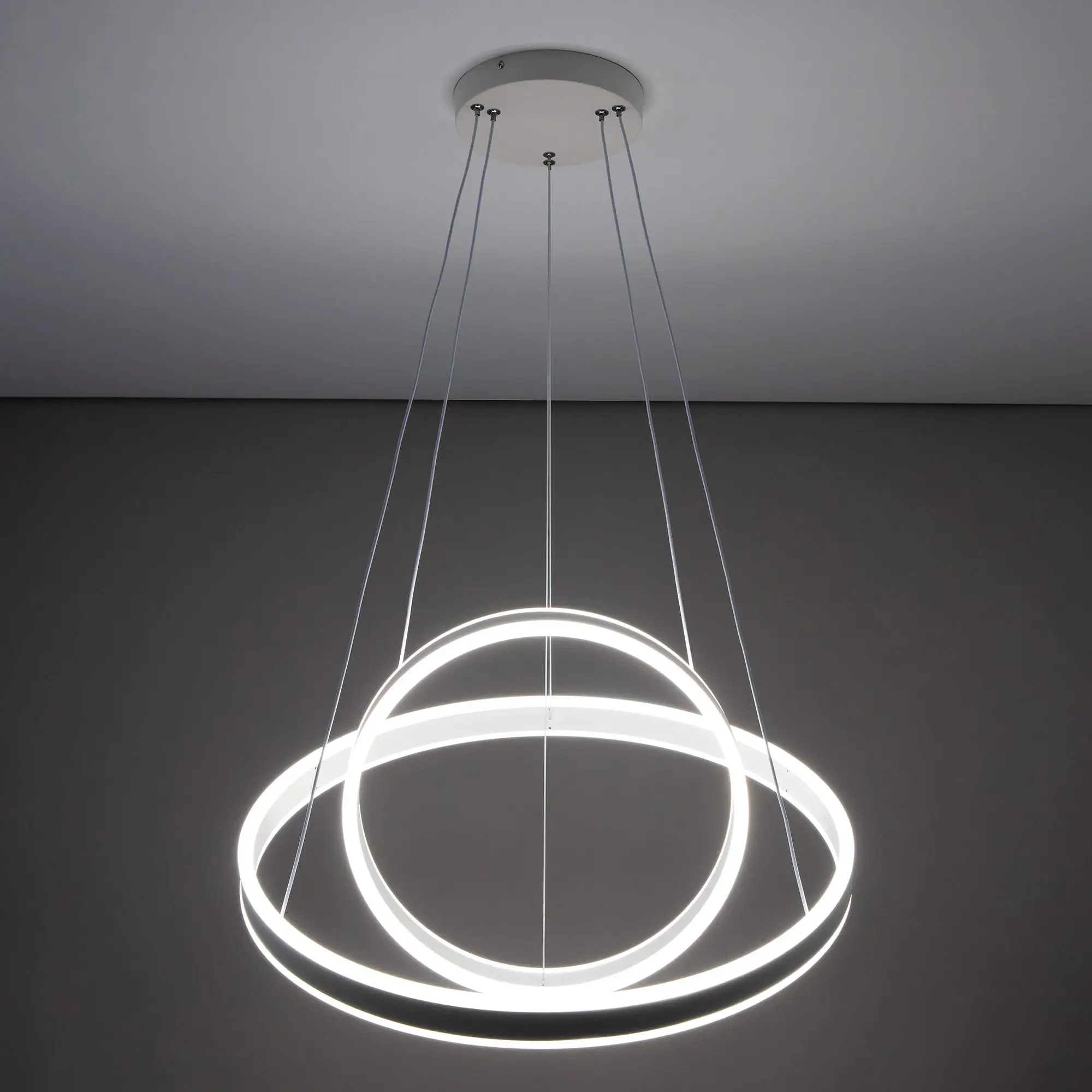 Светодиодная люстра Citilux Дуэт CL719640 выполнена в современном стиле. Белая люстра на тросах с двумя подвесными кольцами, высоту и угол наклона каждого из которых можно легко изменить. Кольца - светодиодные модули изготовлены из алюминиевого профиля, рассеиватель из оптического полимера. Наличие источников света с двух сторон профиля позволяет равномерно осветить всё помещение.