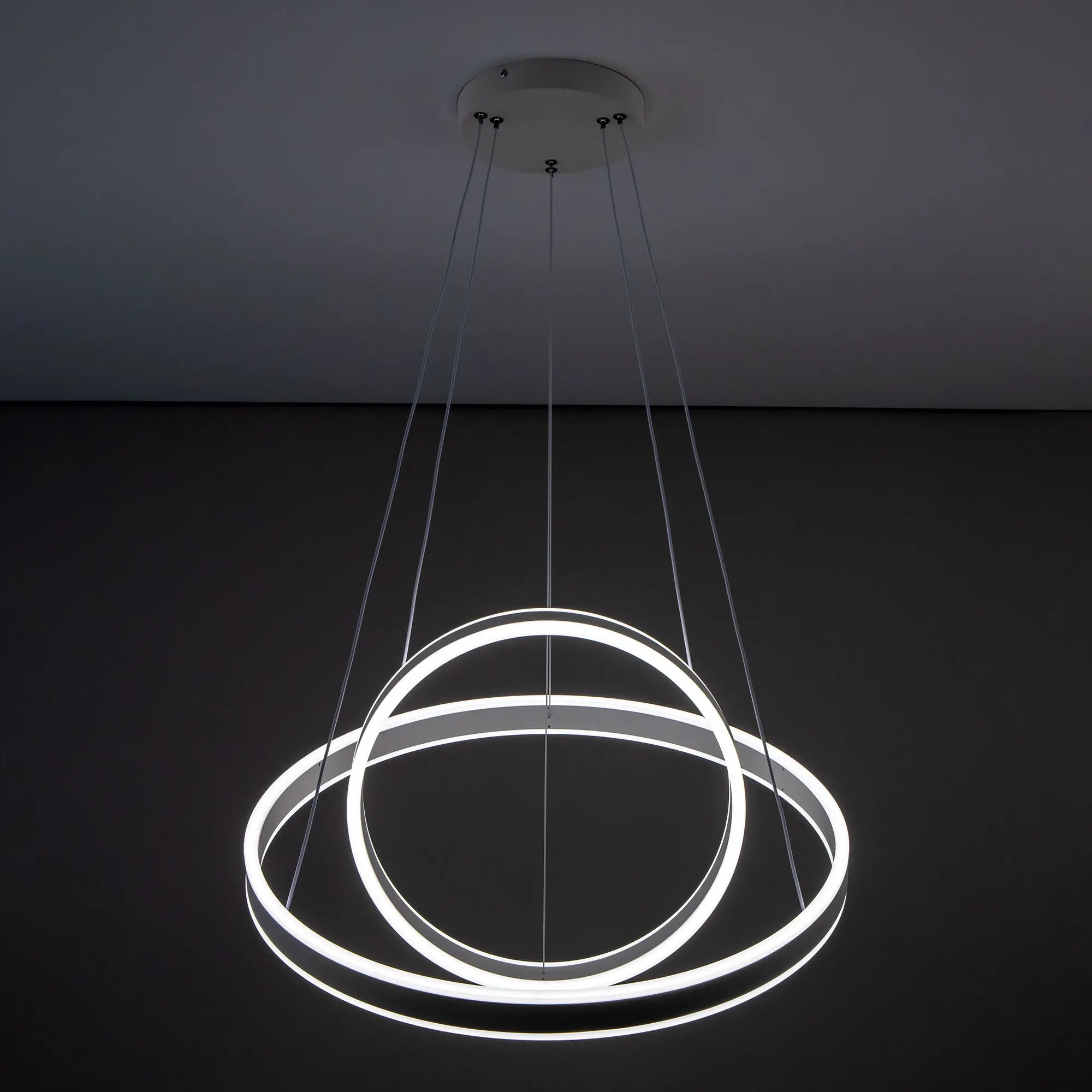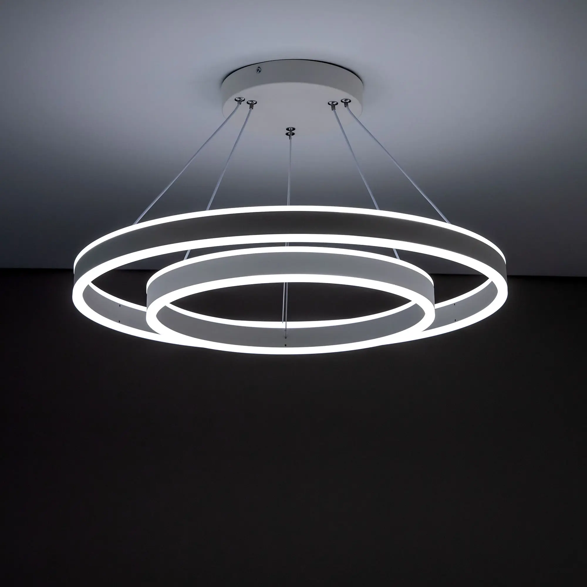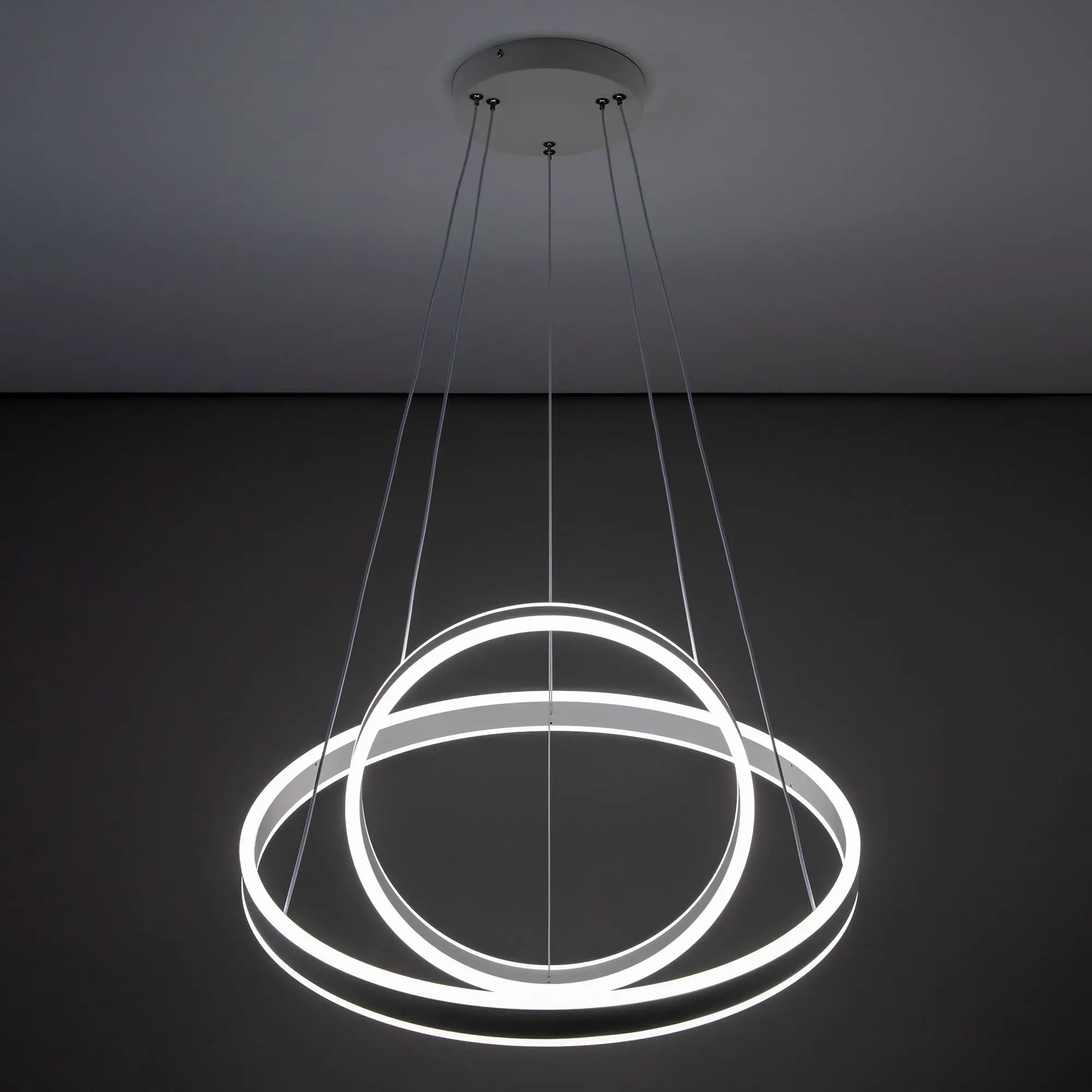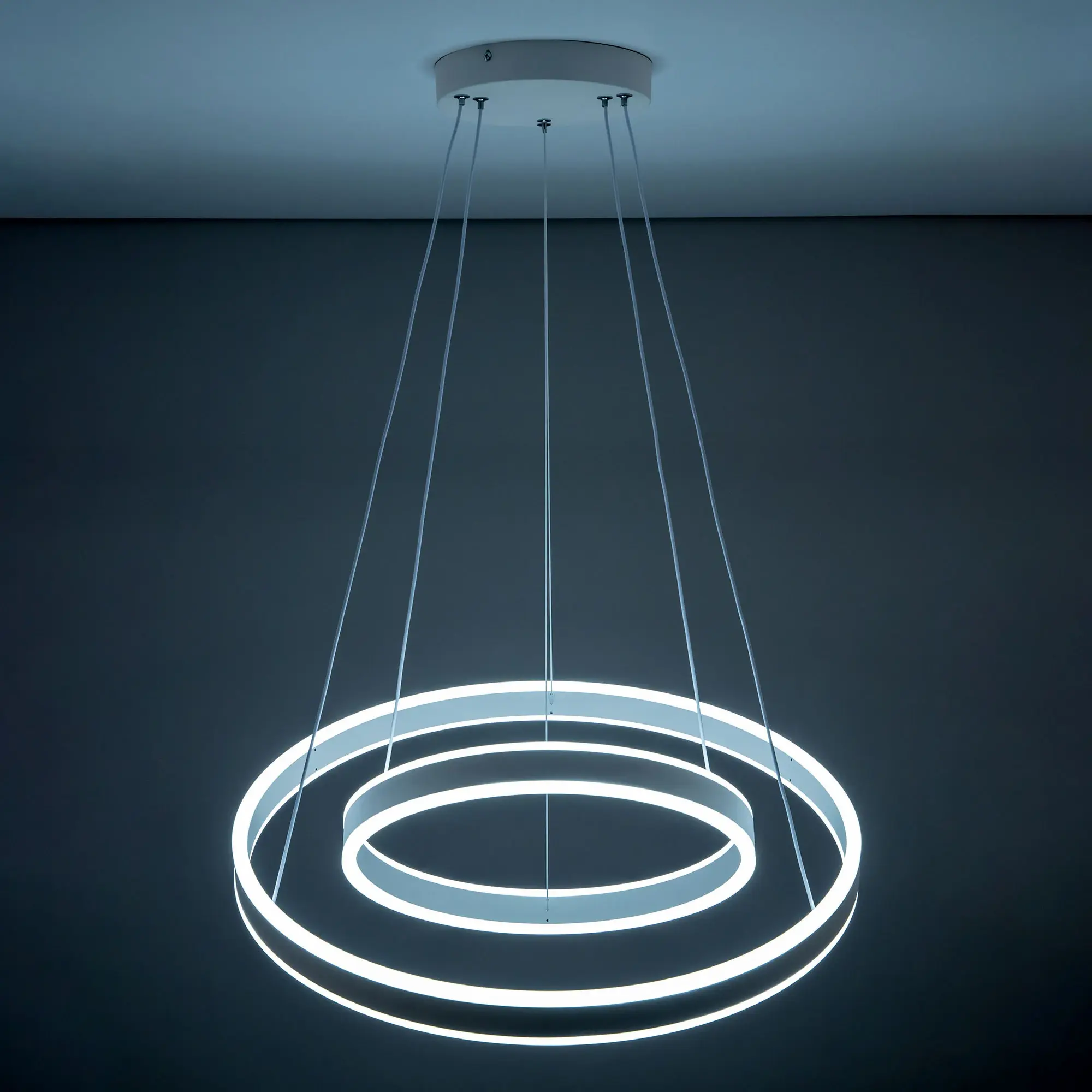Светодиодная люстра Citilux Дуэт CL719640 выполнена в современном стиле. Белая люстра на тросах с двумя подвесными кольцами, высоту и угол наклона каждого из которых можно легко изменить. Кольца - светодиодные модули изготовлены из алюминиевого профиля, рассеиватель из оптического полимера. Наличие источников света с двух сторон профиля позволяет равномерно осветить всё помещение.