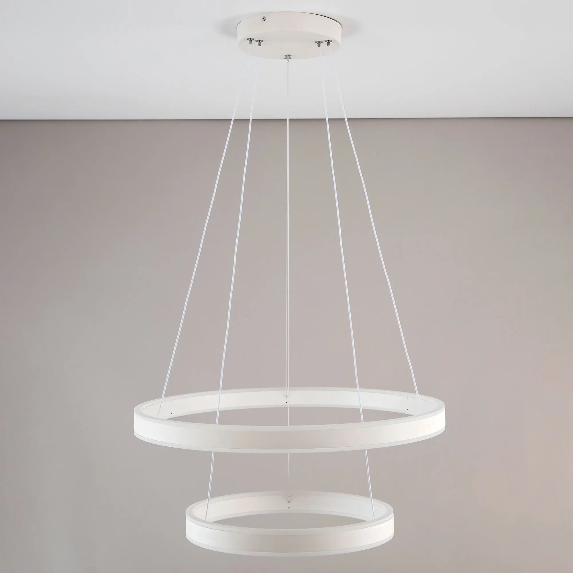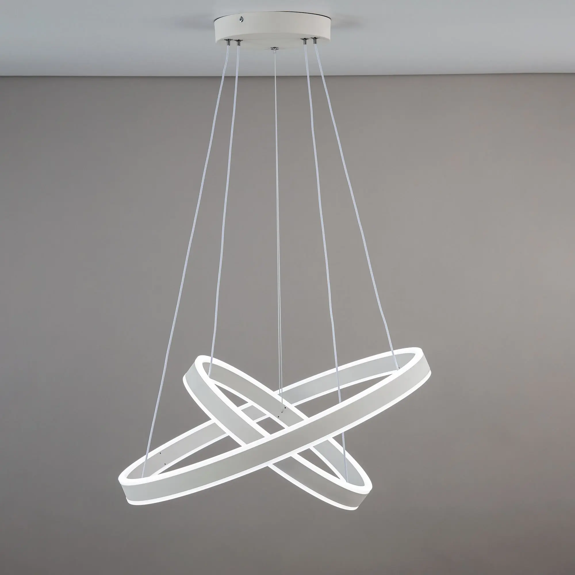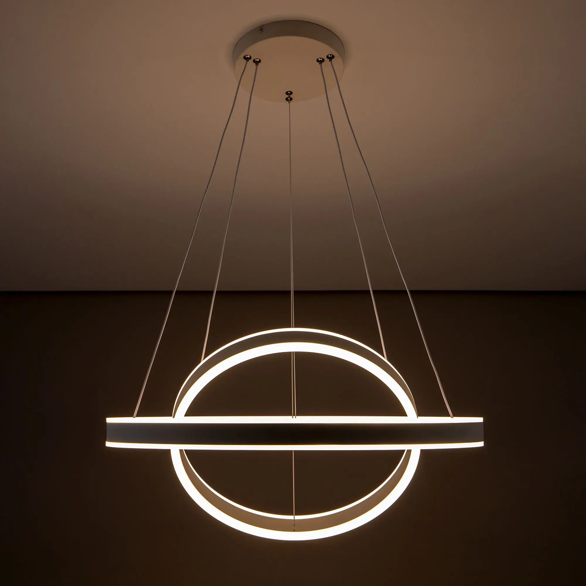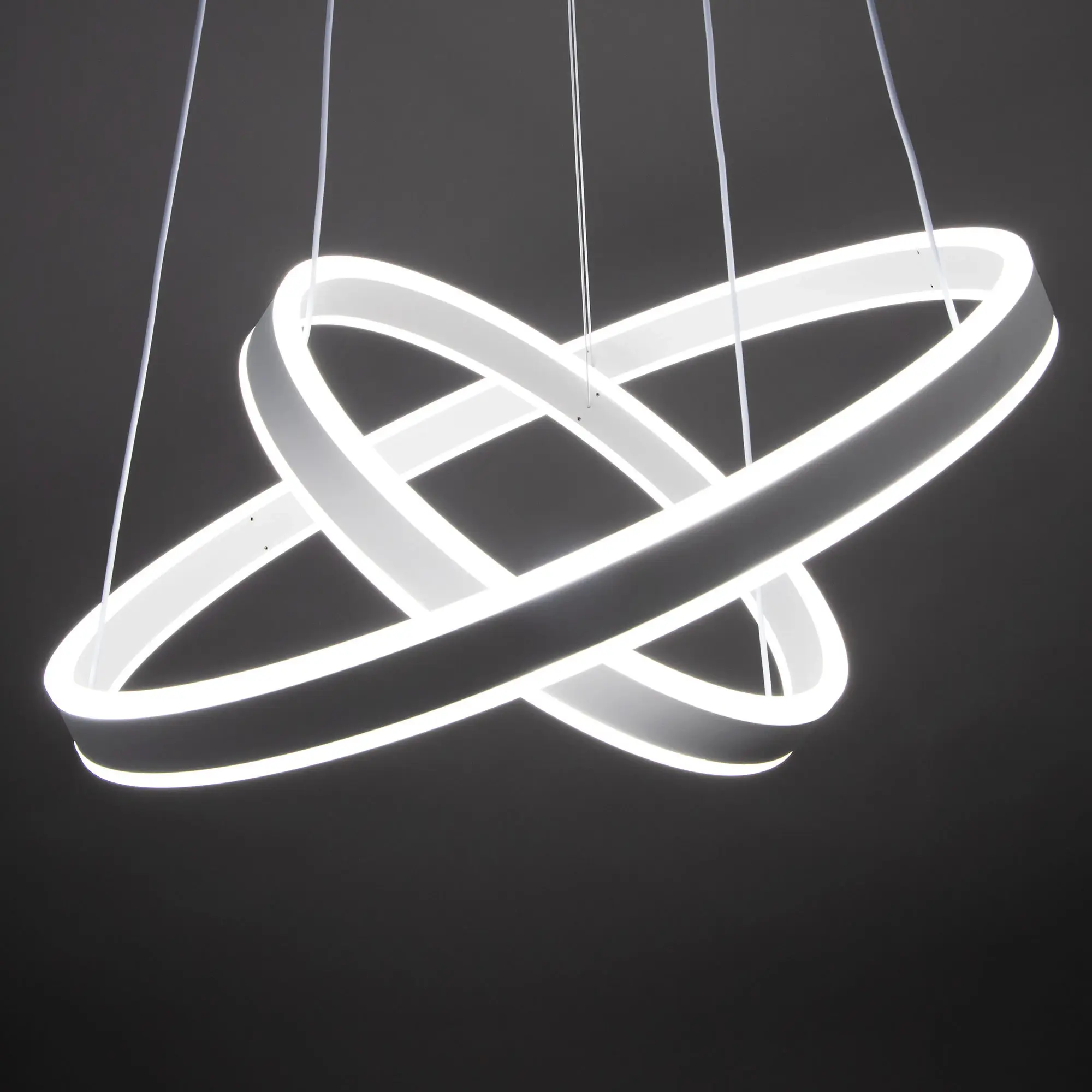 Светодиодная люстра Citilux Дуэт CL719640 выполнена в современном стиле. Белая люстра на тросах с двумя подвесными кольцами, высоту и угол наклона каждого из которых можно легко изменить. Кольца - светодиодные модули изготовлены из алюминиевого профиля, рассеиватель из оптического полимера. Наличие источников света с двух сторон профиля позволяет равномерно осветить всё помещение.