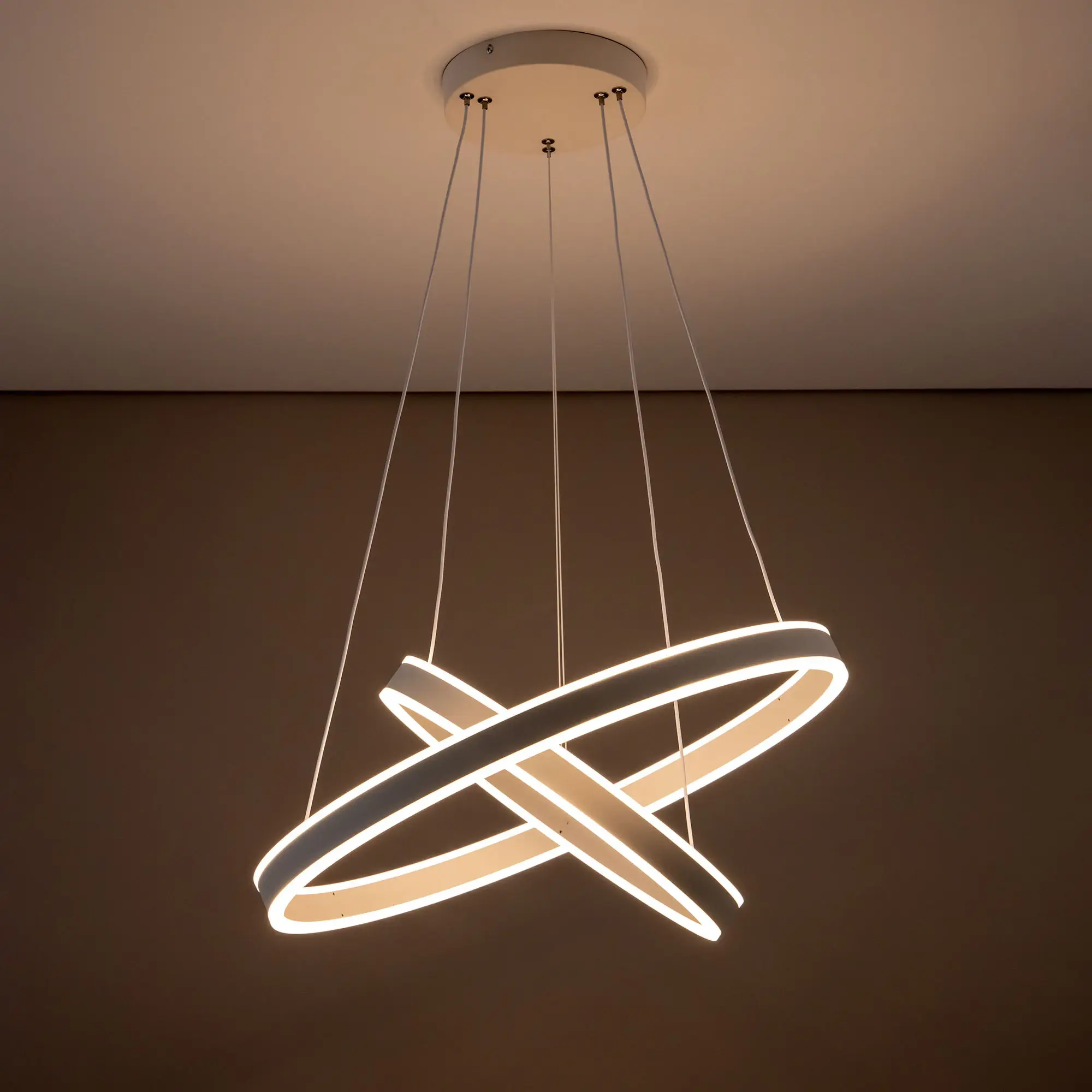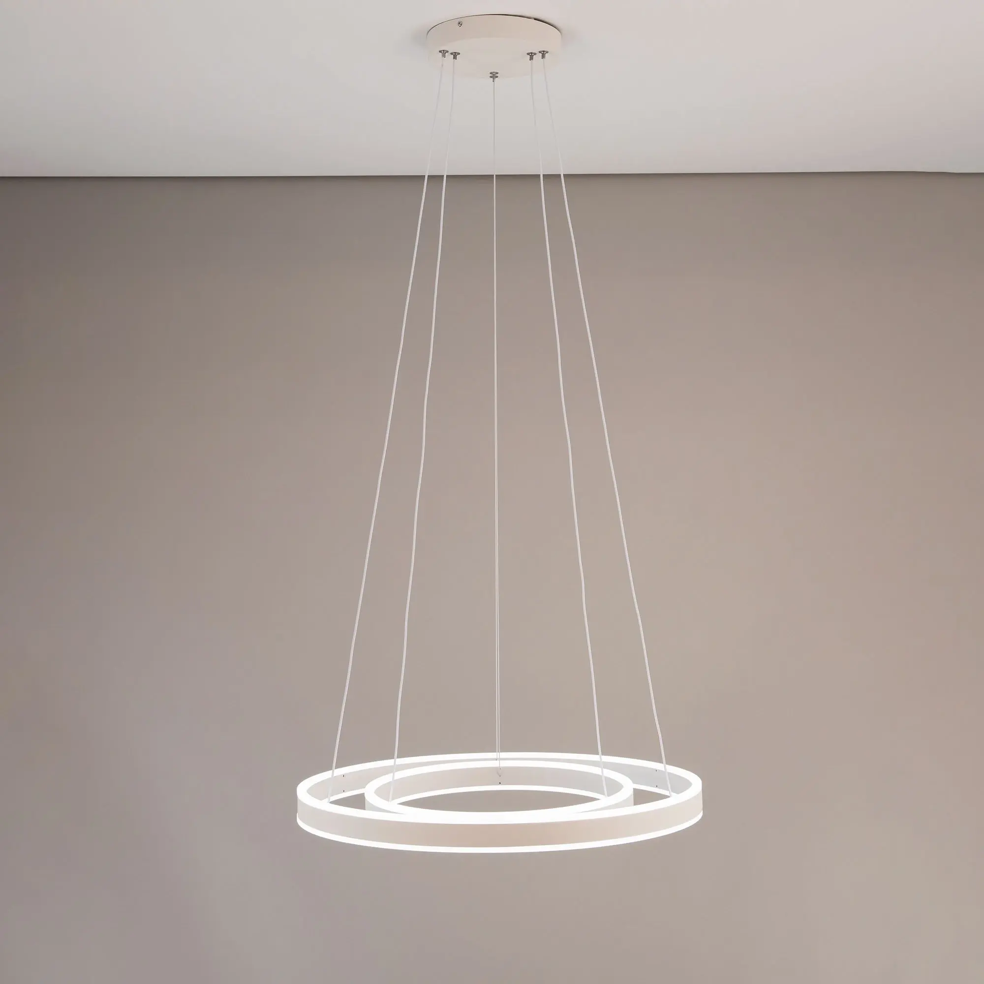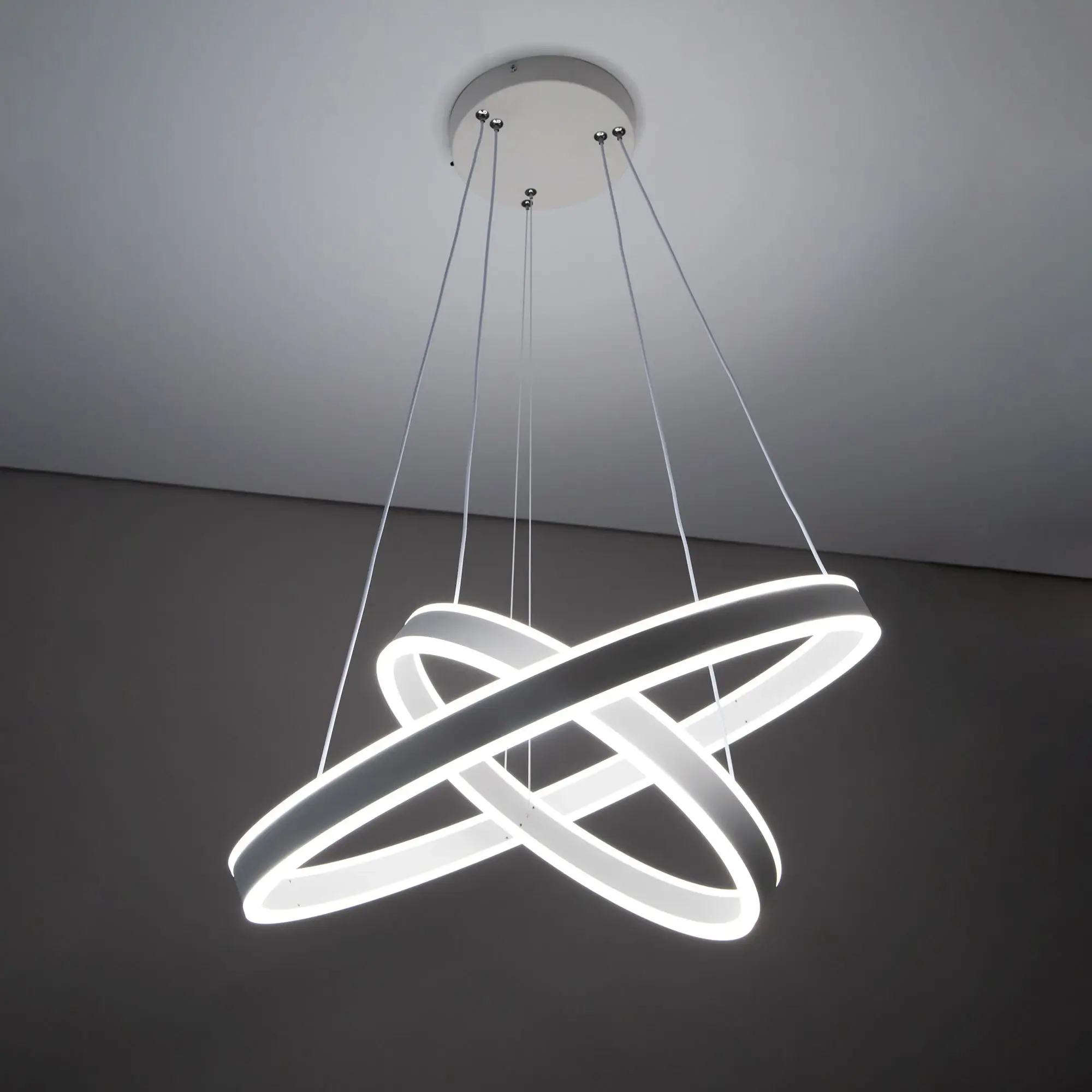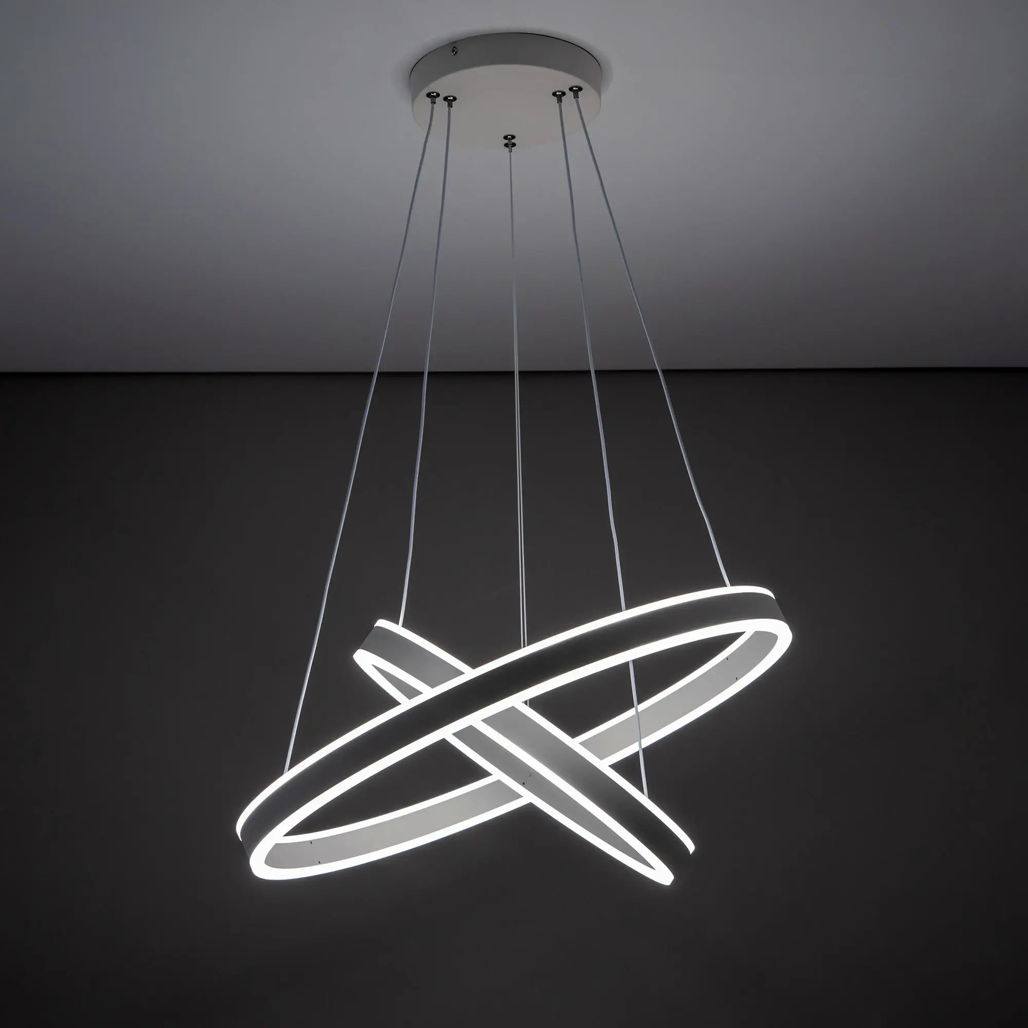 Светодиодная люстра Citilux Дуэт CL719640 выполнена в современном стиле. Белая люстра на тросах с двумя подвесными кольцами, высоту и угол наклона каждого из которых можно легко изменить. Кольца - светодиодные модули изготовлены из алюминиевого профиля, рассеиватель из оптического полимера. Наличие источников света с двух сторон профиля позволяет равномерно осветить всё помещение.