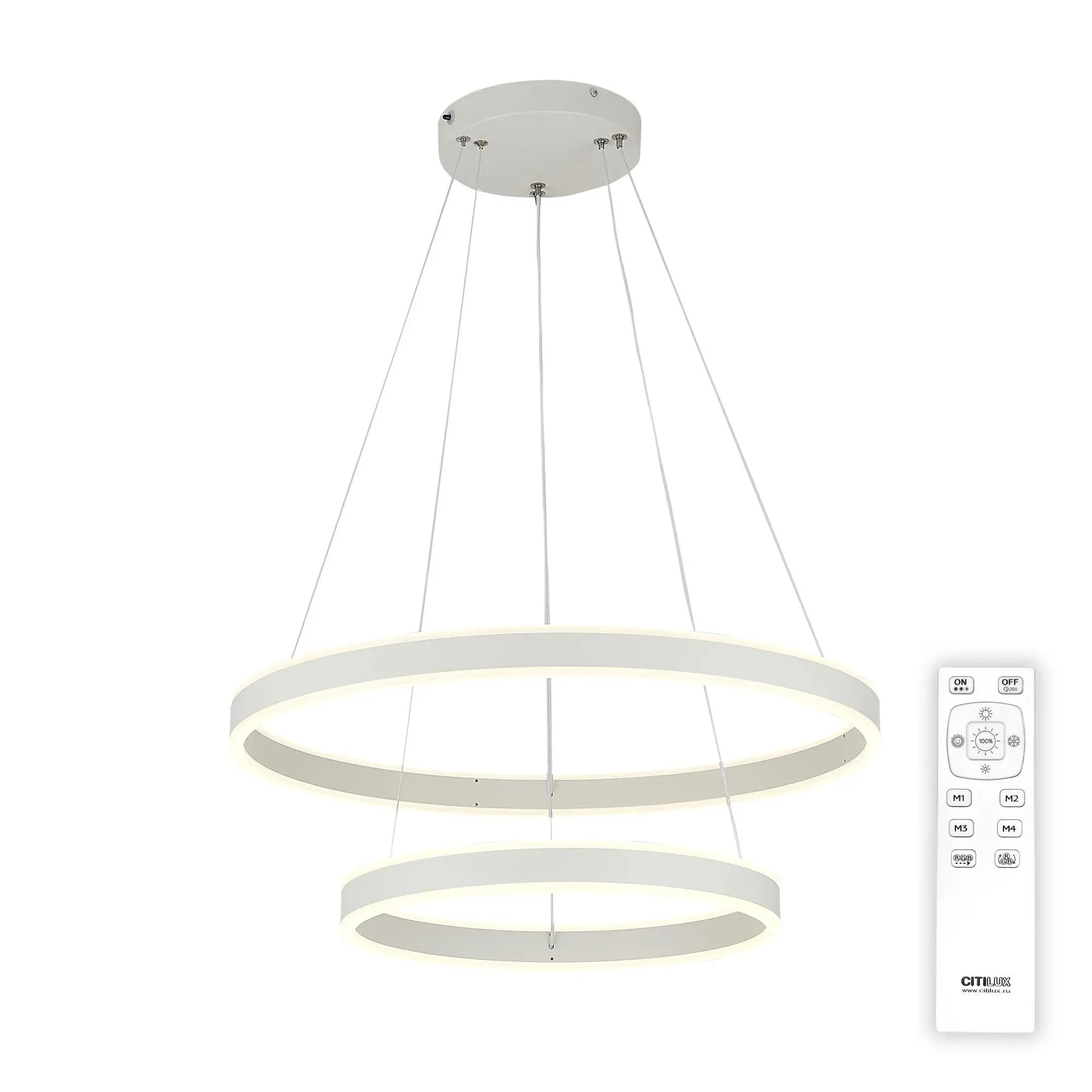 С помощью пульта доступно: плавная регулировка яркости от 10 до 100%; управление цветовой температурой от 3000К до 5500К, позволяет настроить любые оттенки теплого, нейтрального и холодного света. Есть функция отсроченного выключения, 4 настраиваемых режима памяти, которыми также можно управлять настенным выключателем. Пульт ДУ в комплекте, тип батареек ААА (батарейки в комплект не входят, приобретаются отдельно). Мощность 108Вт, диаметр 60см, высота легко регулируется от 17см до 1,2м. Крепление подходит для всех типов потолков, в том числе натяжных, тип крепления – планка.