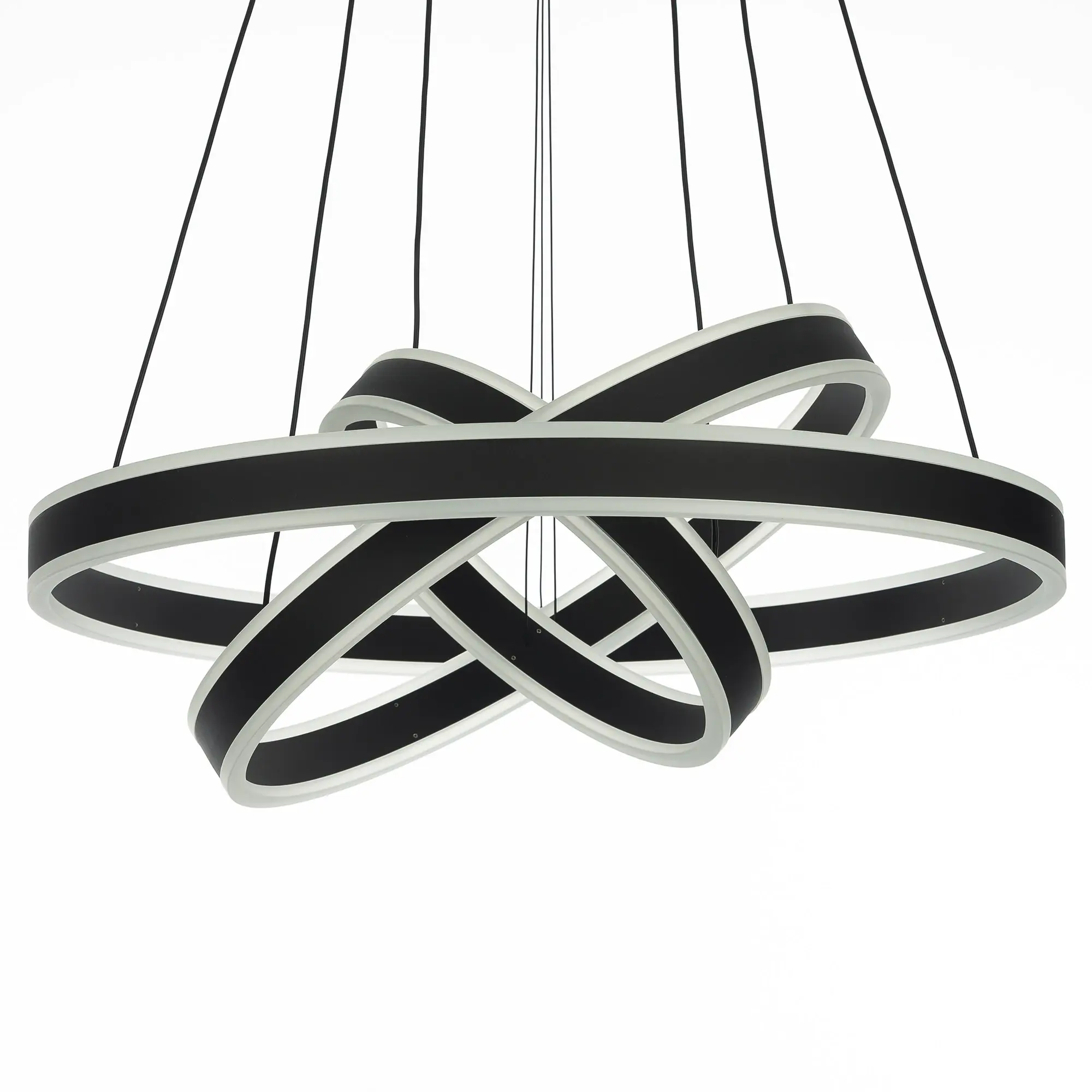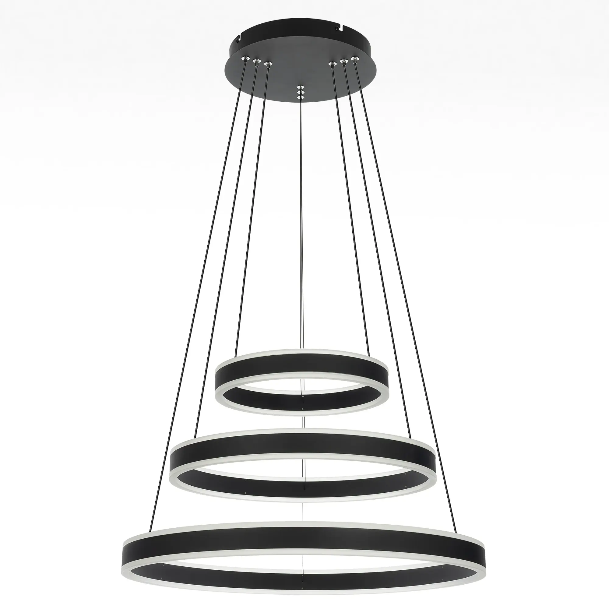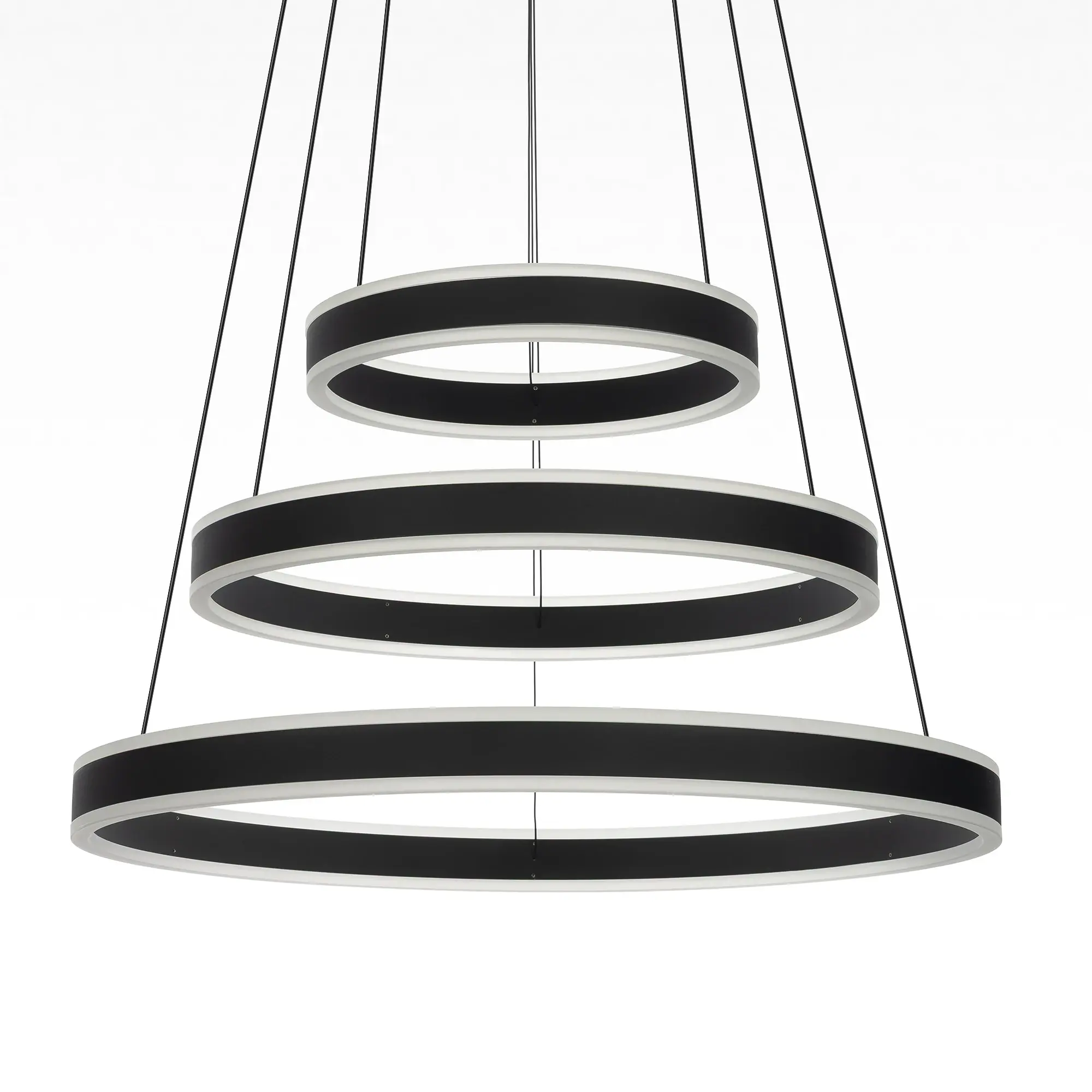Светодиодная люстра Citilux Дуэт CL719651 выполнена в современном стиле, цвет чёрный. Люстра на тросах в форме каскада из трёх колец, высоту и угол наклона каждого из которых можно легко изменить. Кольца - светодиодные модули изготовлены из алюминиевого профиля, рассеиватель из оптического полимера. Наличие источников света с двух сторон профиля позволяет равномерно осветить всё помещение.