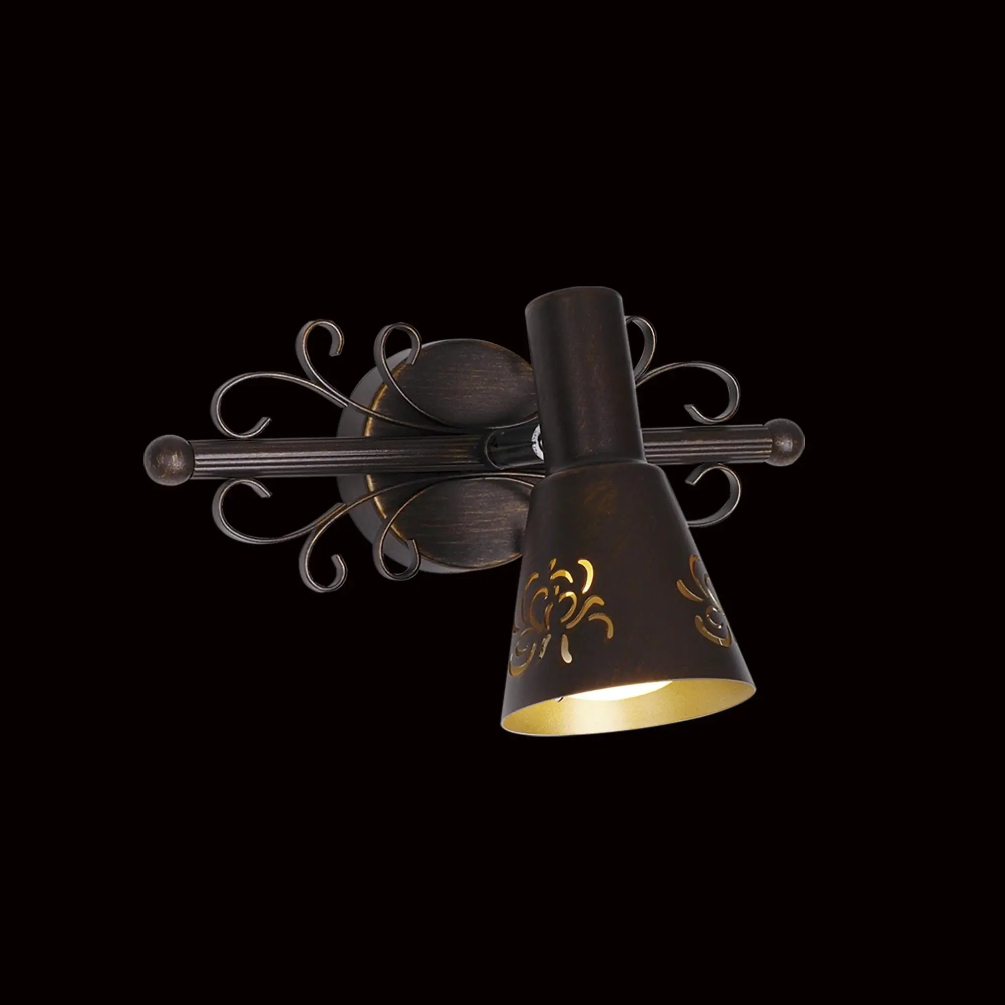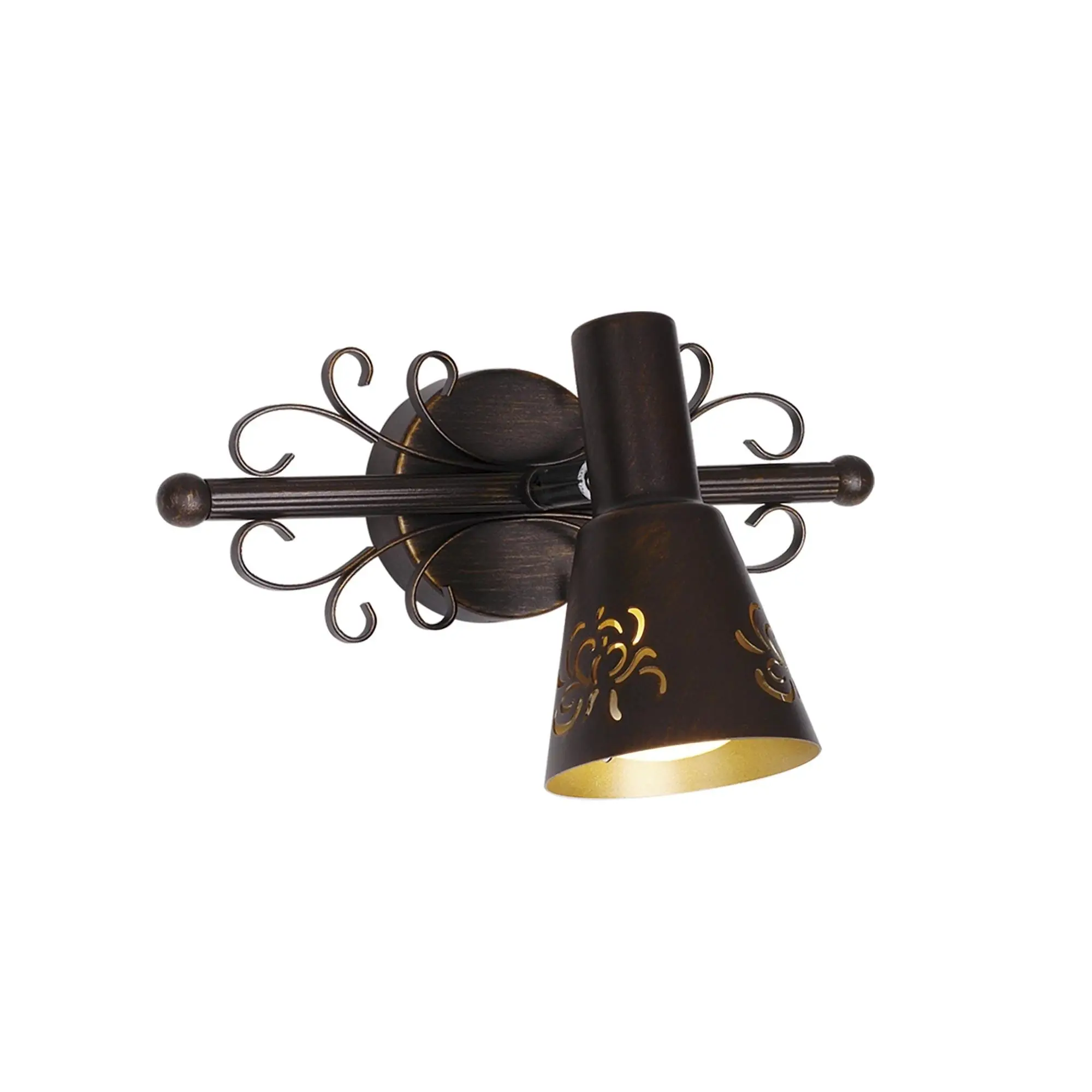 Светильник-спот Citilux Dunkan CL529511 с поворотным плафоном. Корпус изделия металлический, модного кофейного оттенка, с витым декором. Плафон также металлический, снаружи окрашен в кофейный цвет, внутри — в золотистый, украшен ажурным орнаментом.