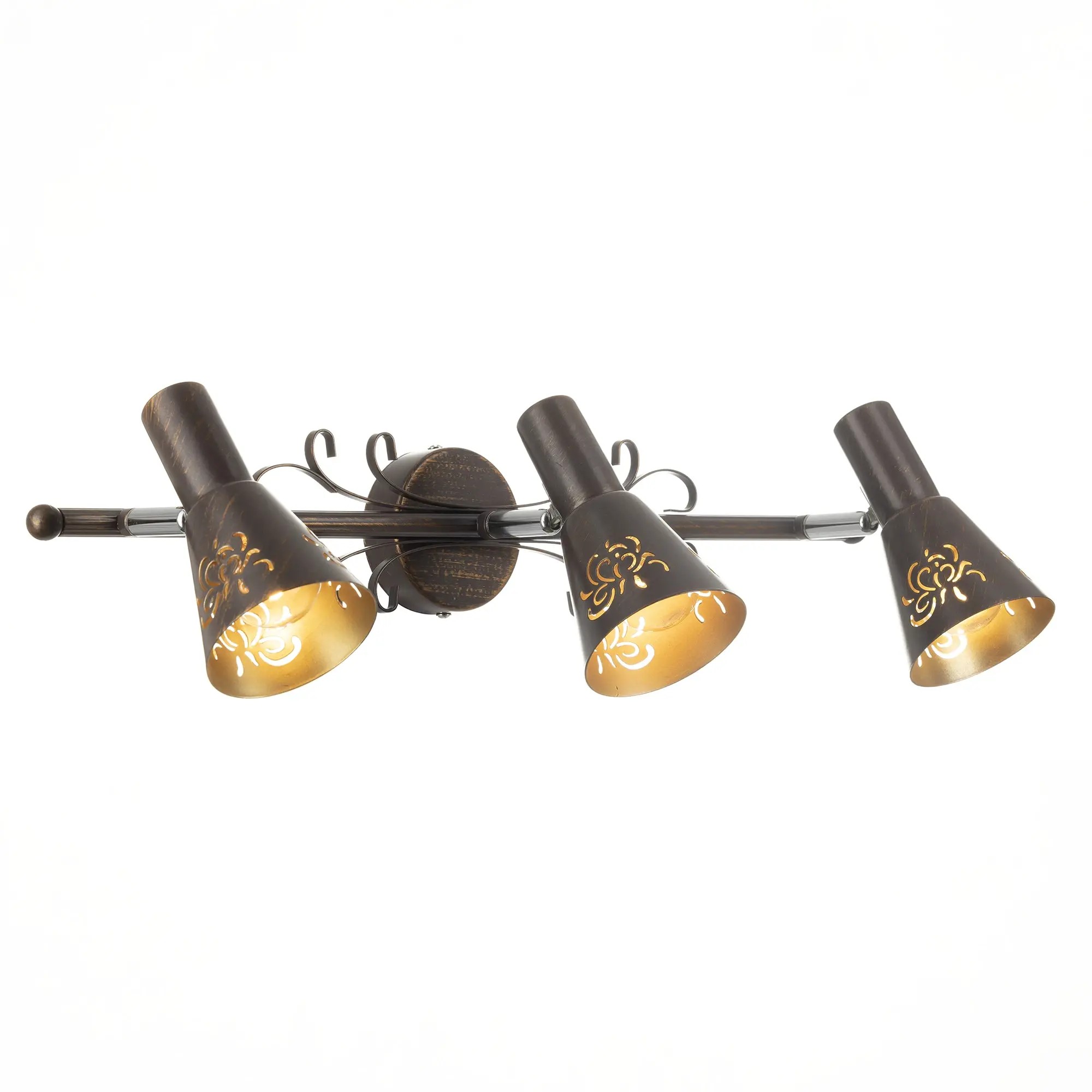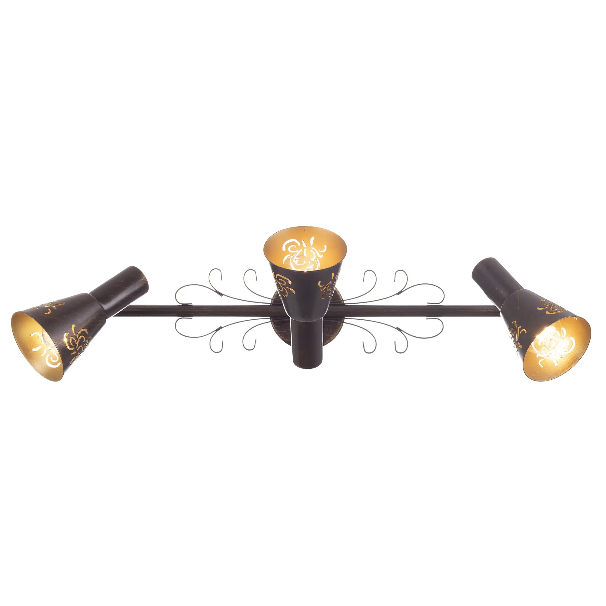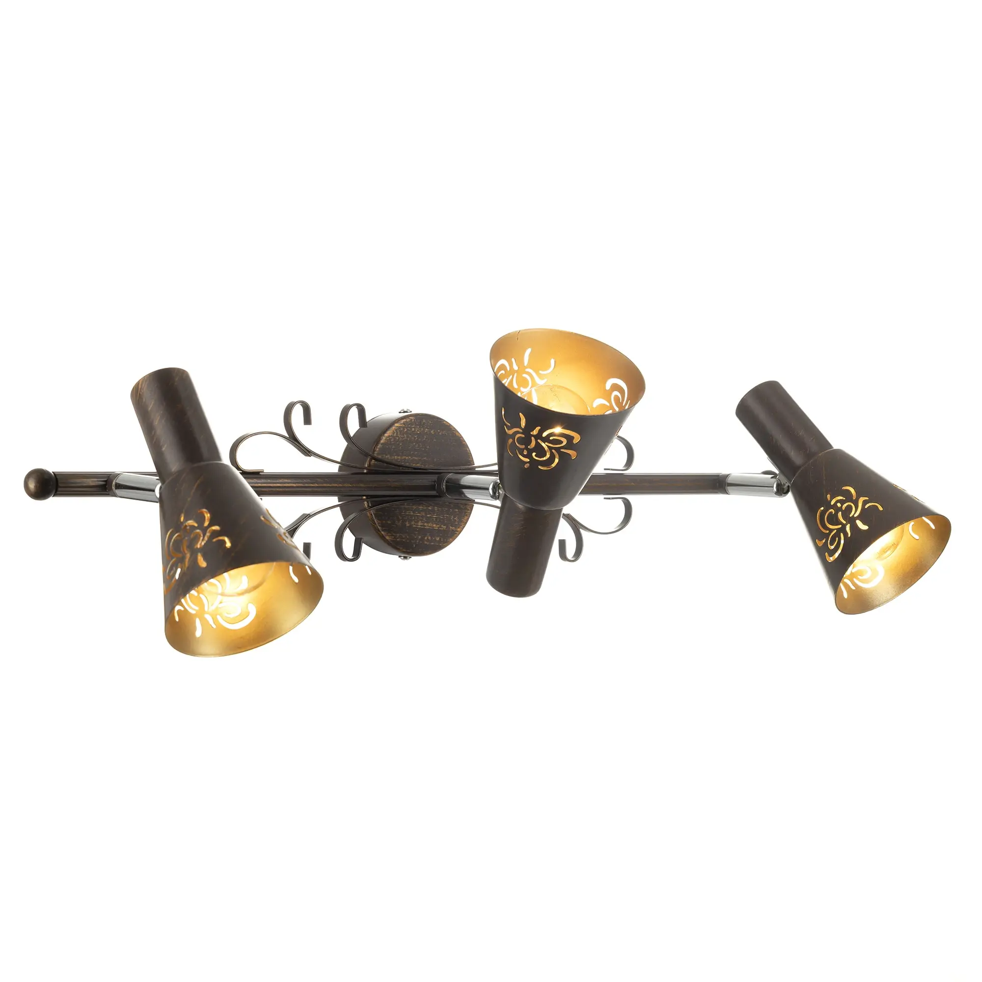 Светильник-спот Citilux Dunkan CL529531 с поворотными плафонами. Корпус изделия металлический, модного кофейного оттенка, с витым декором. Плафоны также металлические, снаружи окрашены в кофейный цвет, внутри — в золотистый, украшены ажурным орнаментом.