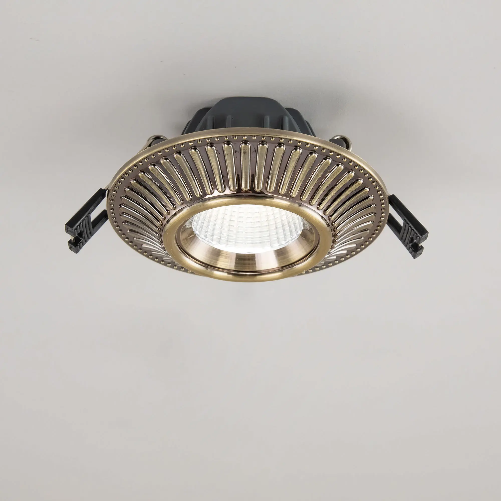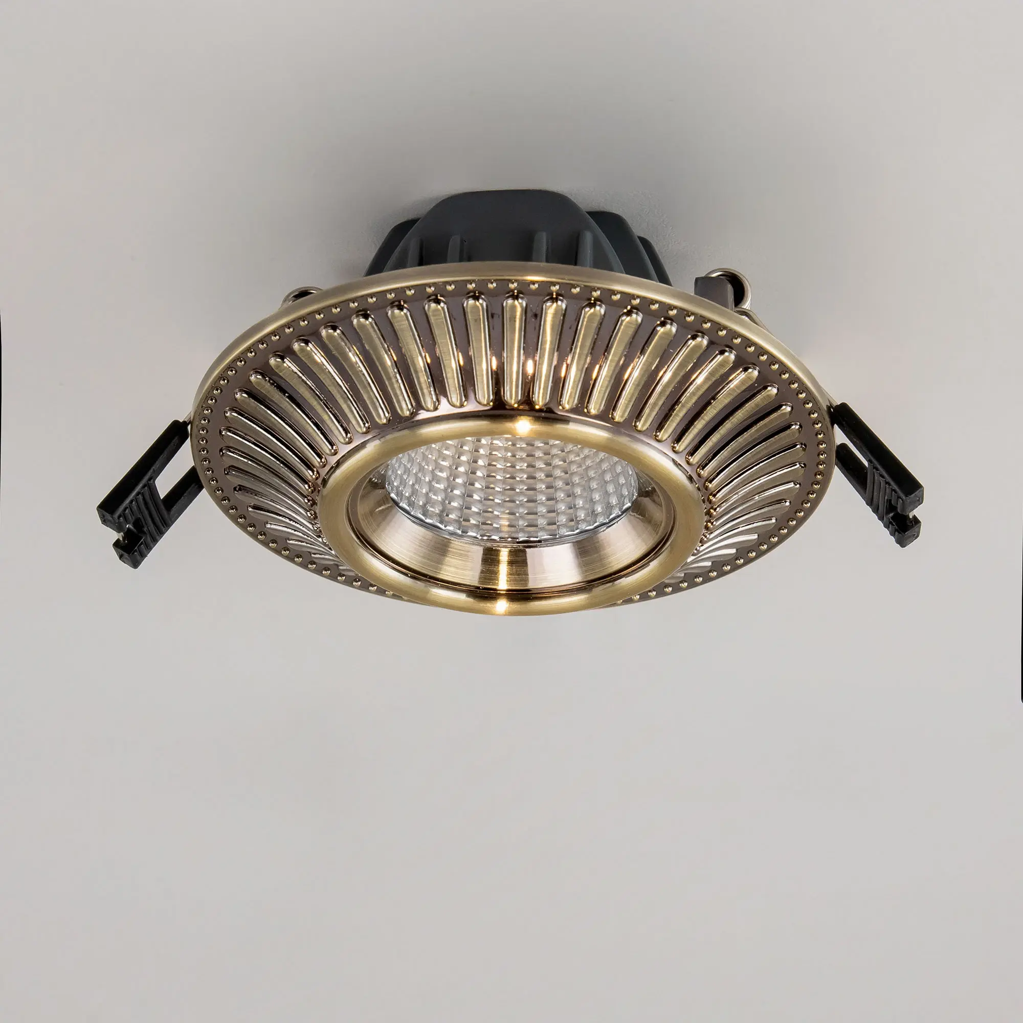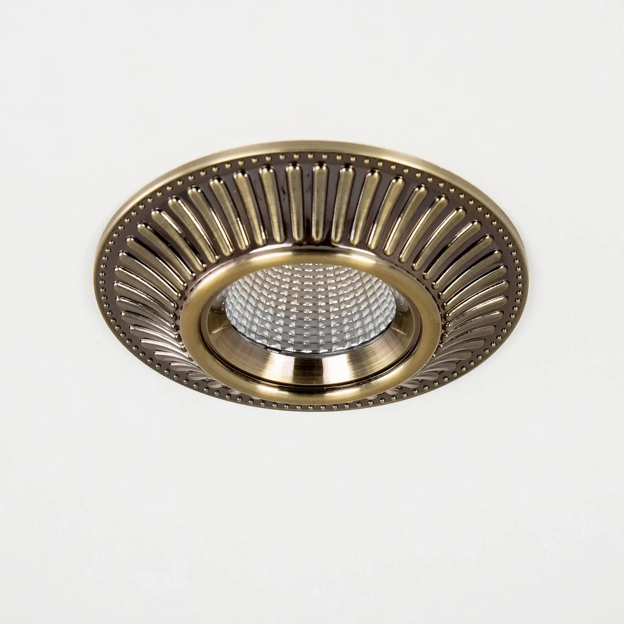 Встраиваемый светодиодный светильник Citilux Дзета CLD042NW3 в классическом стиле. Корпус из прочного полимера, круглой формы, с текстурным рисунком, цвет бронза. Изделие оснащено ярким светодиодом с мощным радиатором охлаждения. Мощность 7Вт, цветовая температура 3500К – нейтральный свет. Встроенный ступенчатый диммер 100-40-15% управляется обычным настенным выключателем. Свет безопасный для глаз, без мерцаний и пульсаций во всех режимах работы. Модель подходит для всех типов навесных и натяжных потолков,