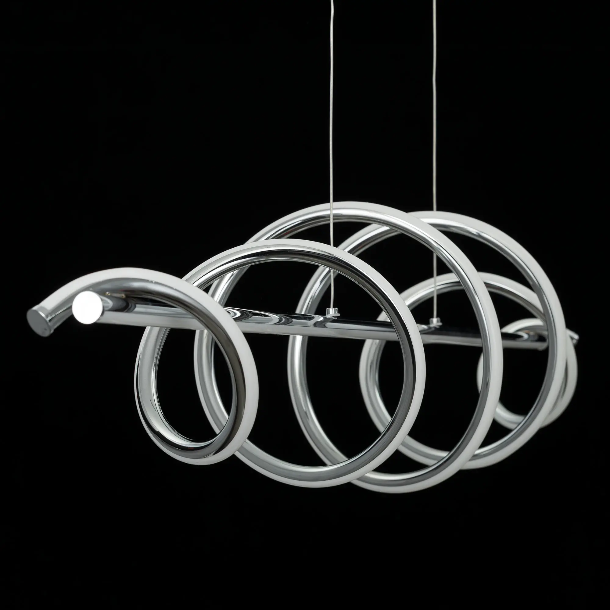 Каркас люстры — металлический, модного хромированного оттенка. На горизонтальной штанге расположен спиралевидный led-модуль с рассеивателем из оптического полимера. Длина светильника составляет 120см, мощность — 60Вт.