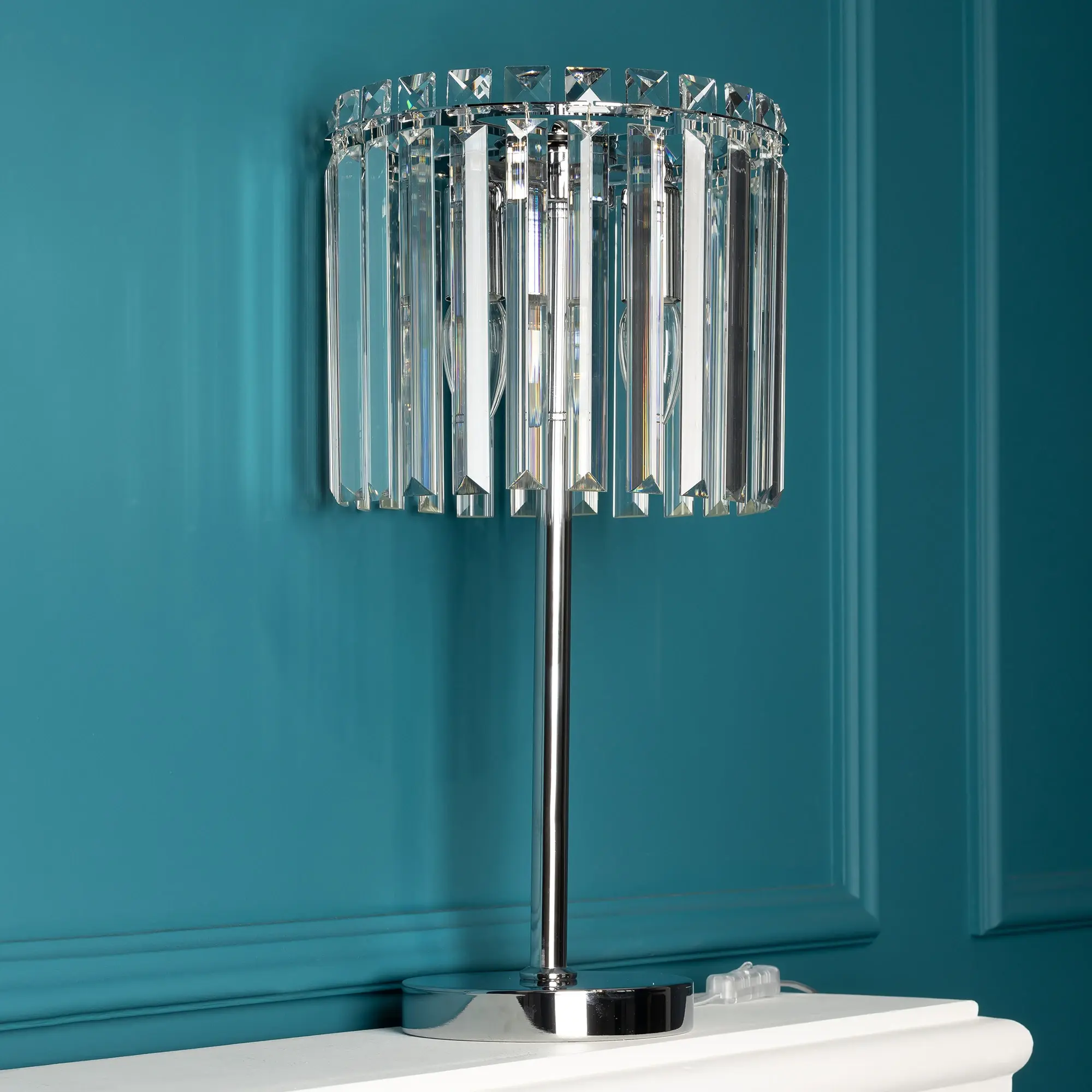 Корпус светильника металлический с глянцевым хромированным покрытием и неповторимый блеском. Хрустальные подвески с модной огранкой создают ощущение роскоши и гармонично формируют общий дизайн лампы.