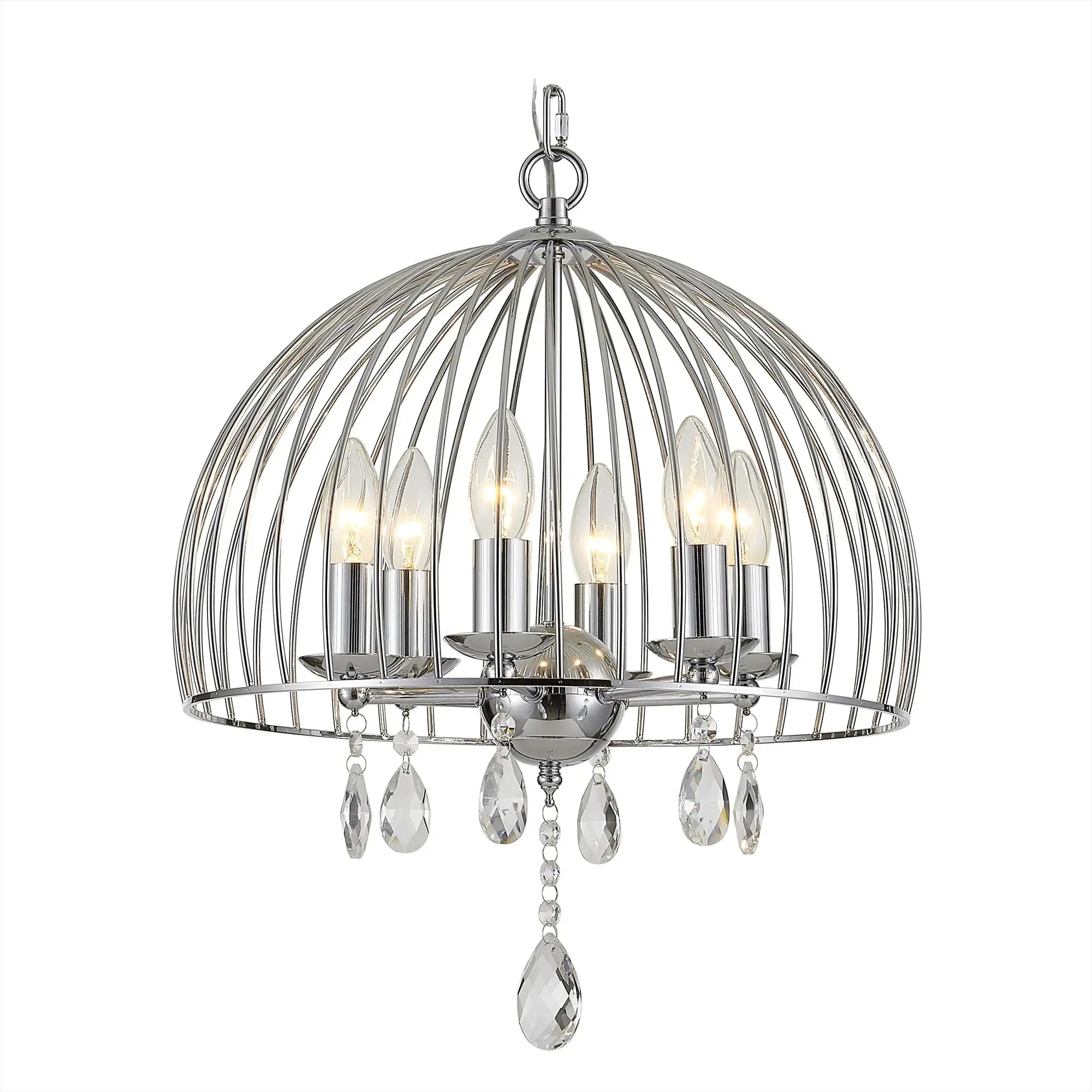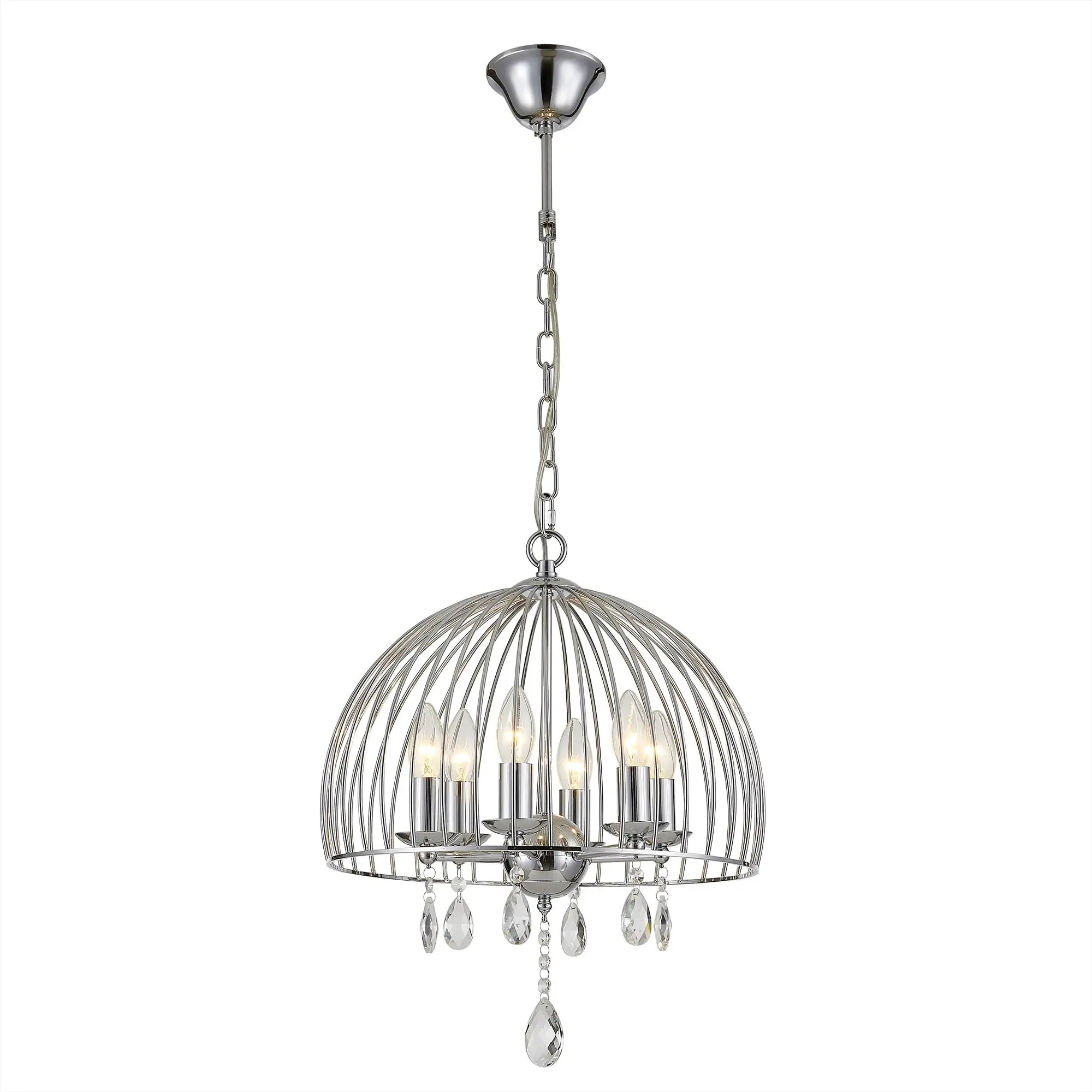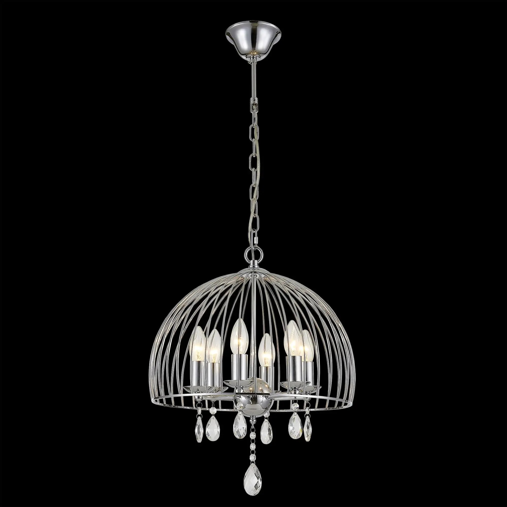 Диаметр светильника 40см, высота легко регулируется при установке в диапазоне от 70см до 1,2м. В изделии 6 ламп с цоколем Е14 максимальной мощностью для ламп накаливания 60Вт. Подходит для всех типов потолков, тип крепления - крючок.