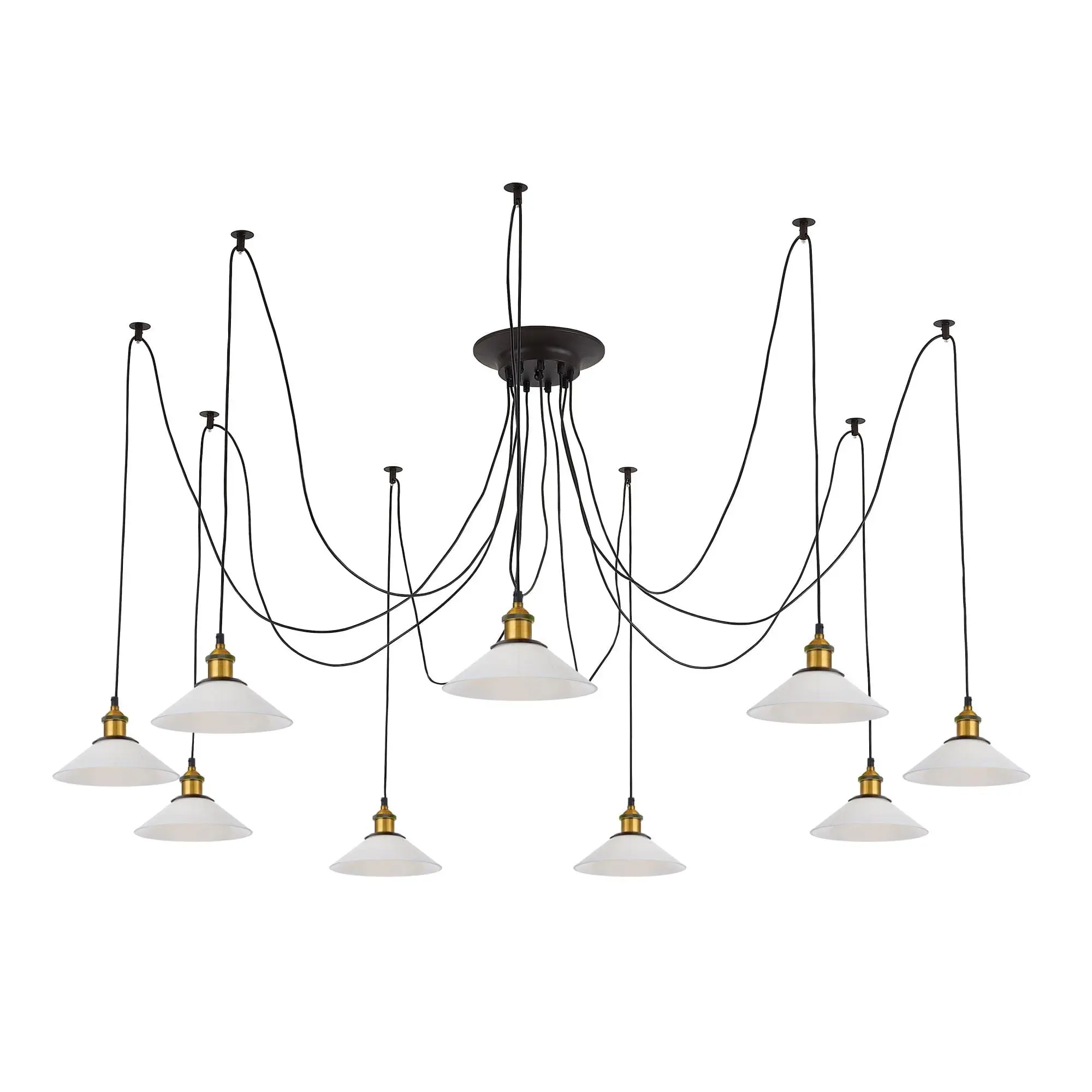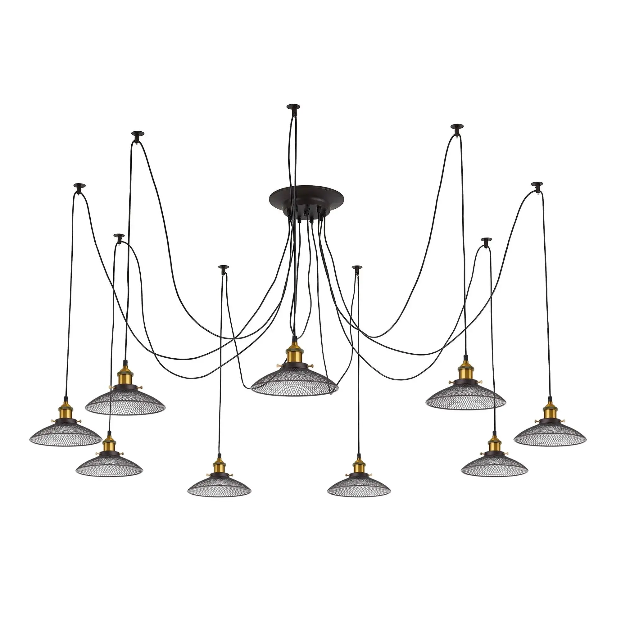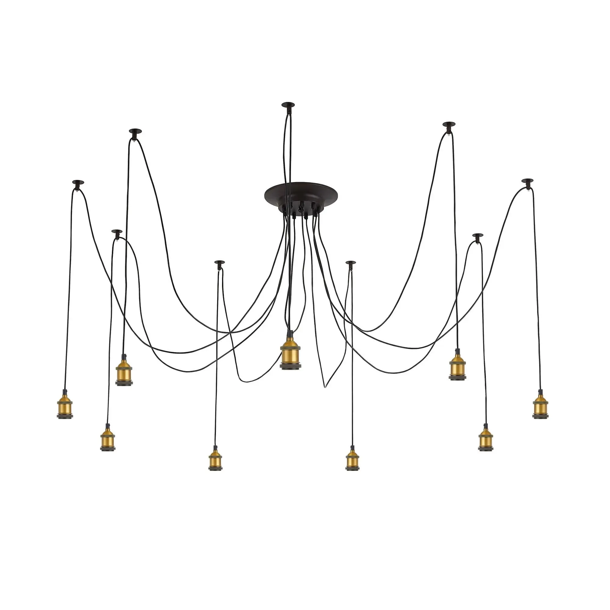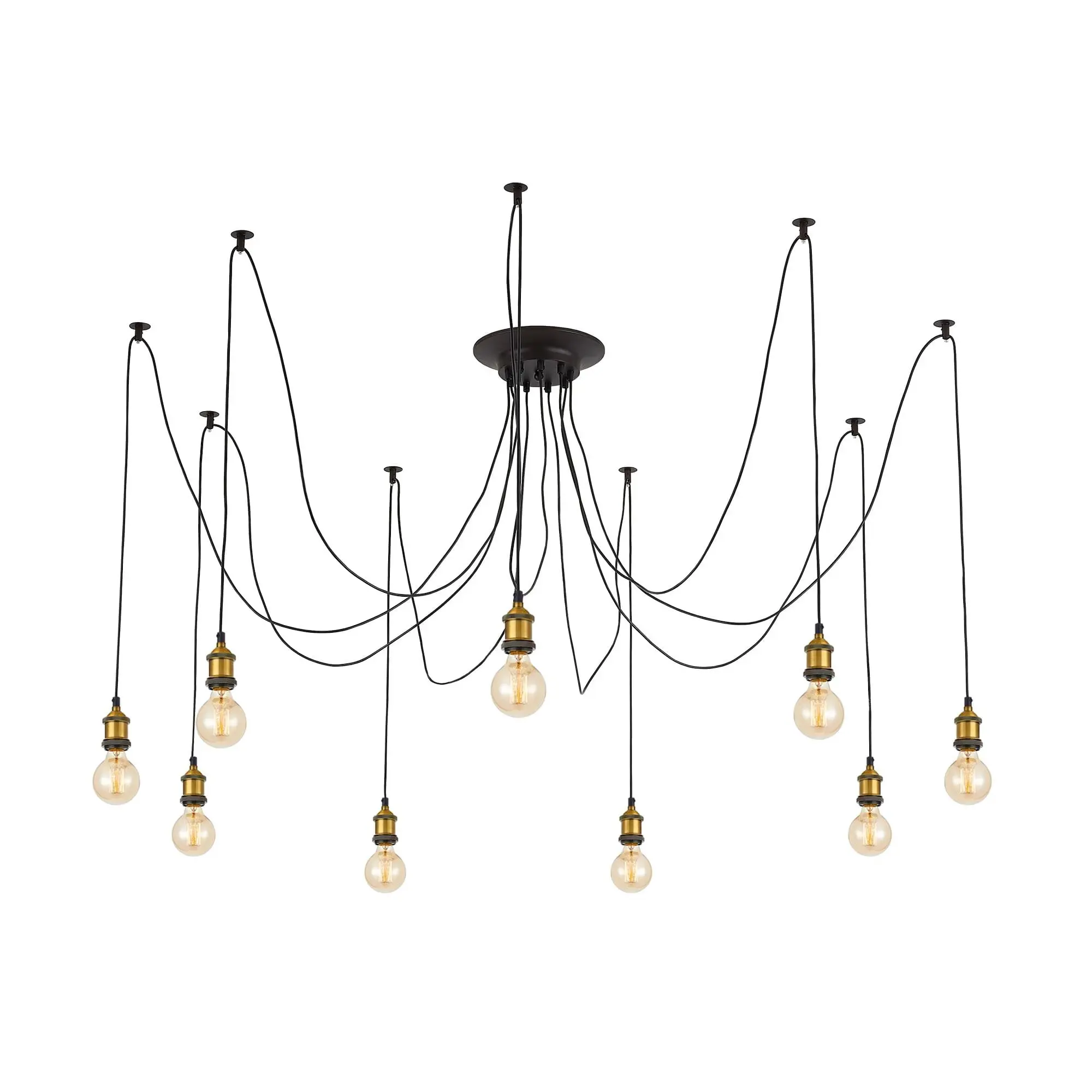В изделии 9 ламп с цоколем Е27 максимальной мощностью для ламп накаливания 75Вт (в комплект не входят, приобретаются отдельно). Длинные провода (по 2,15м), в сочетании с дополнительным индивидуальным крепежом к потолку, позволяют при установке придать светильнику свою уникальную форму и легко адаптировать модель для высоких, стандартных и низких потолков. Тип крепления – планка.