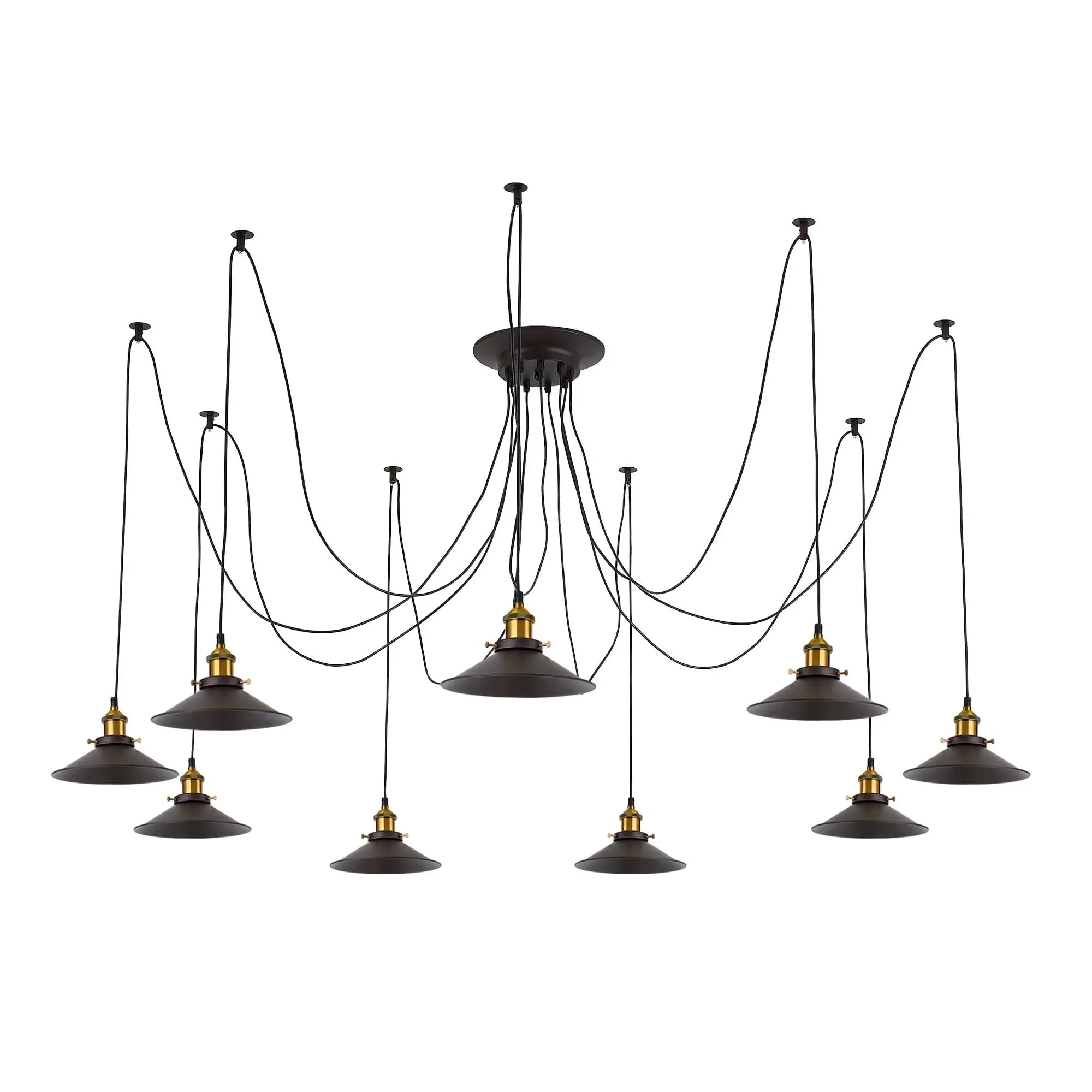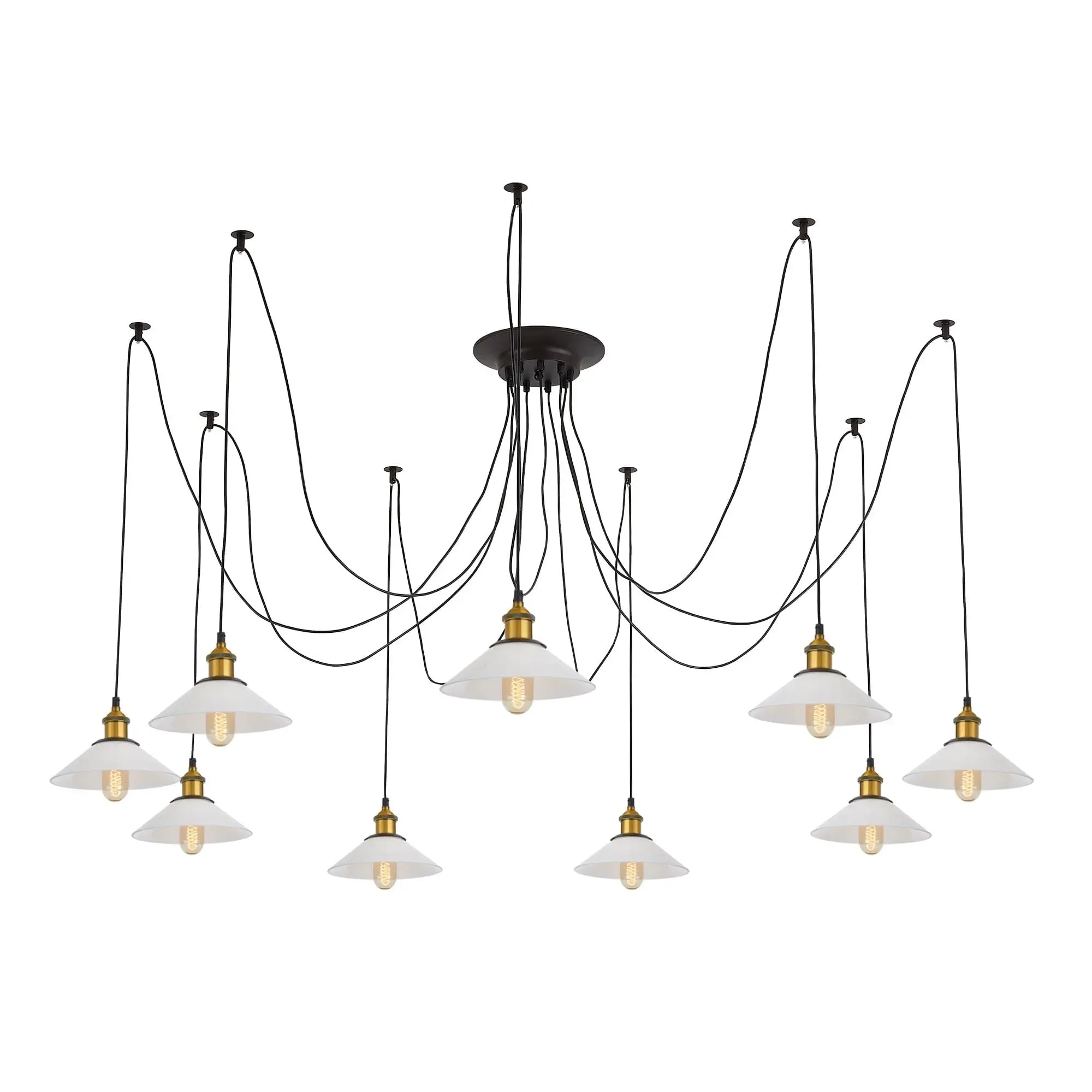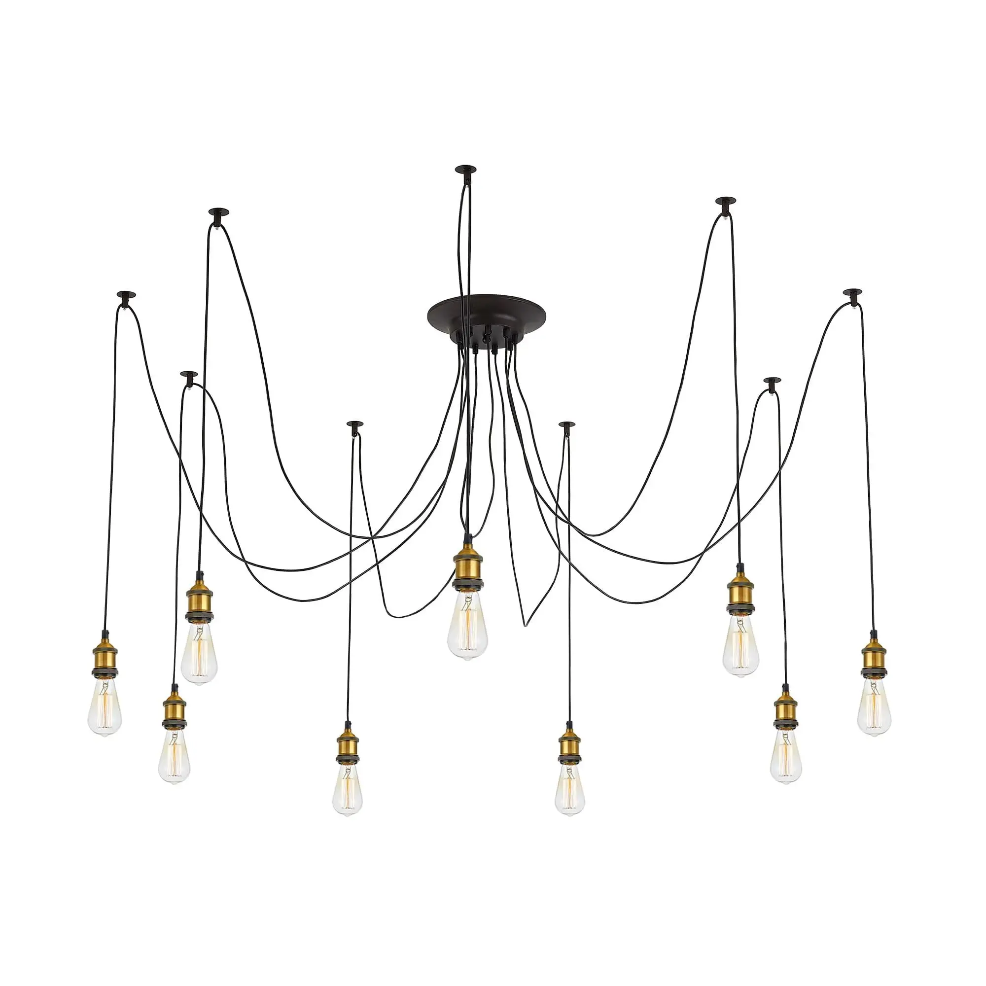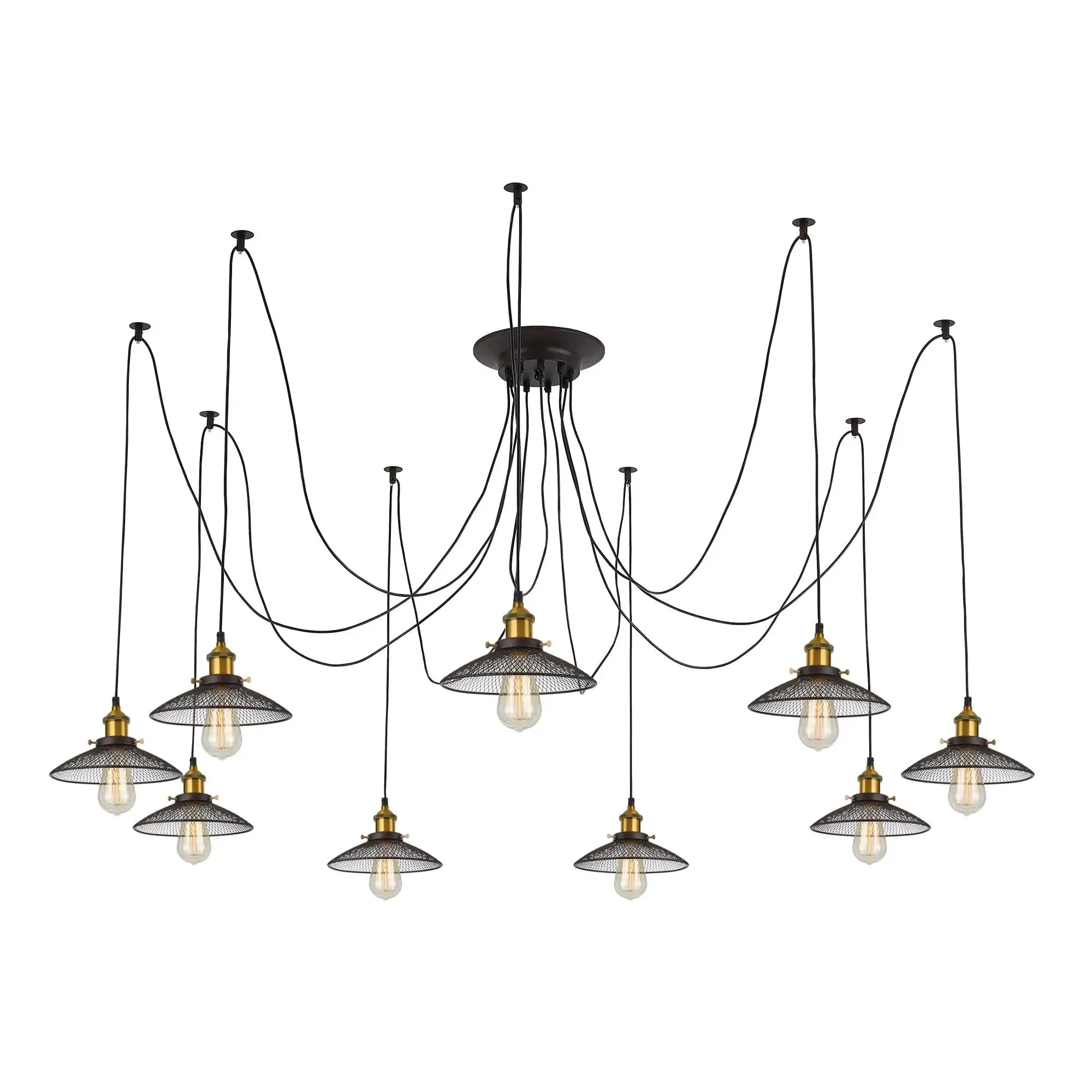 В изделии 9 ламп с цоколем Е27 максимальной мощностью для ламп накаливания 75Вт (в комплект не входят, приобретаются отдельно). Длинные провода (по 2,15м), в сочетании с дополнительным индивидуальным крепежом к потолку, позволяют при установке придать светильнику свою уникальную форму и легко адаптировать модель для высоких, стандартных и низких потолков. Тип крепления – планка.
