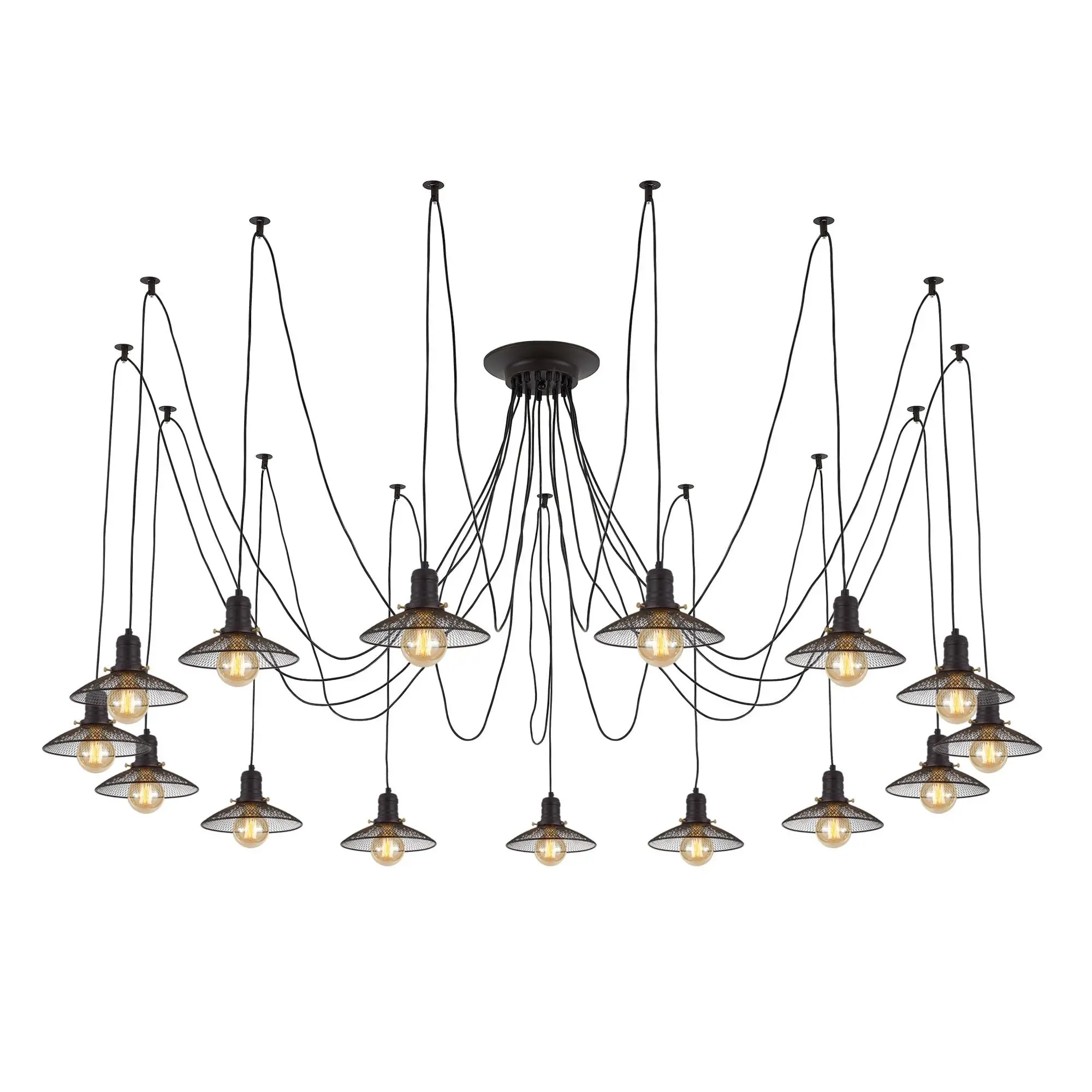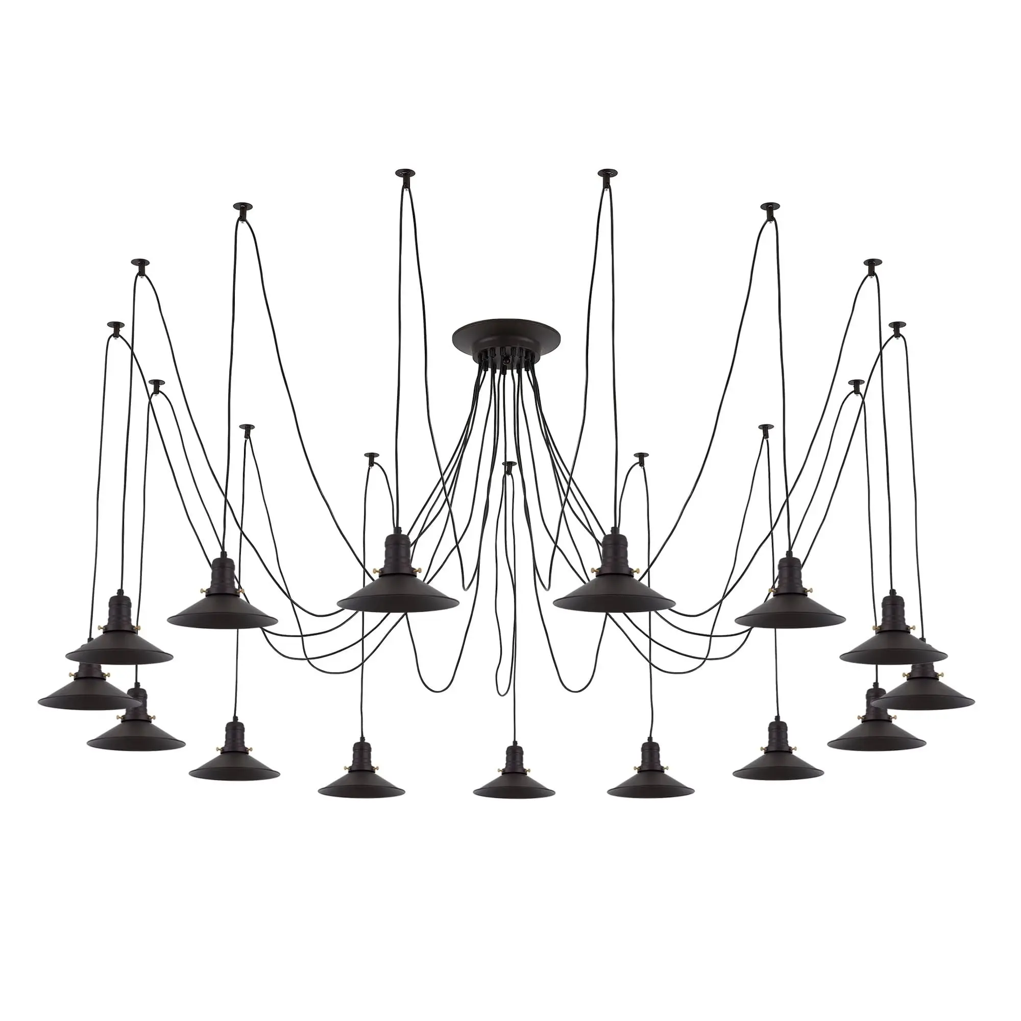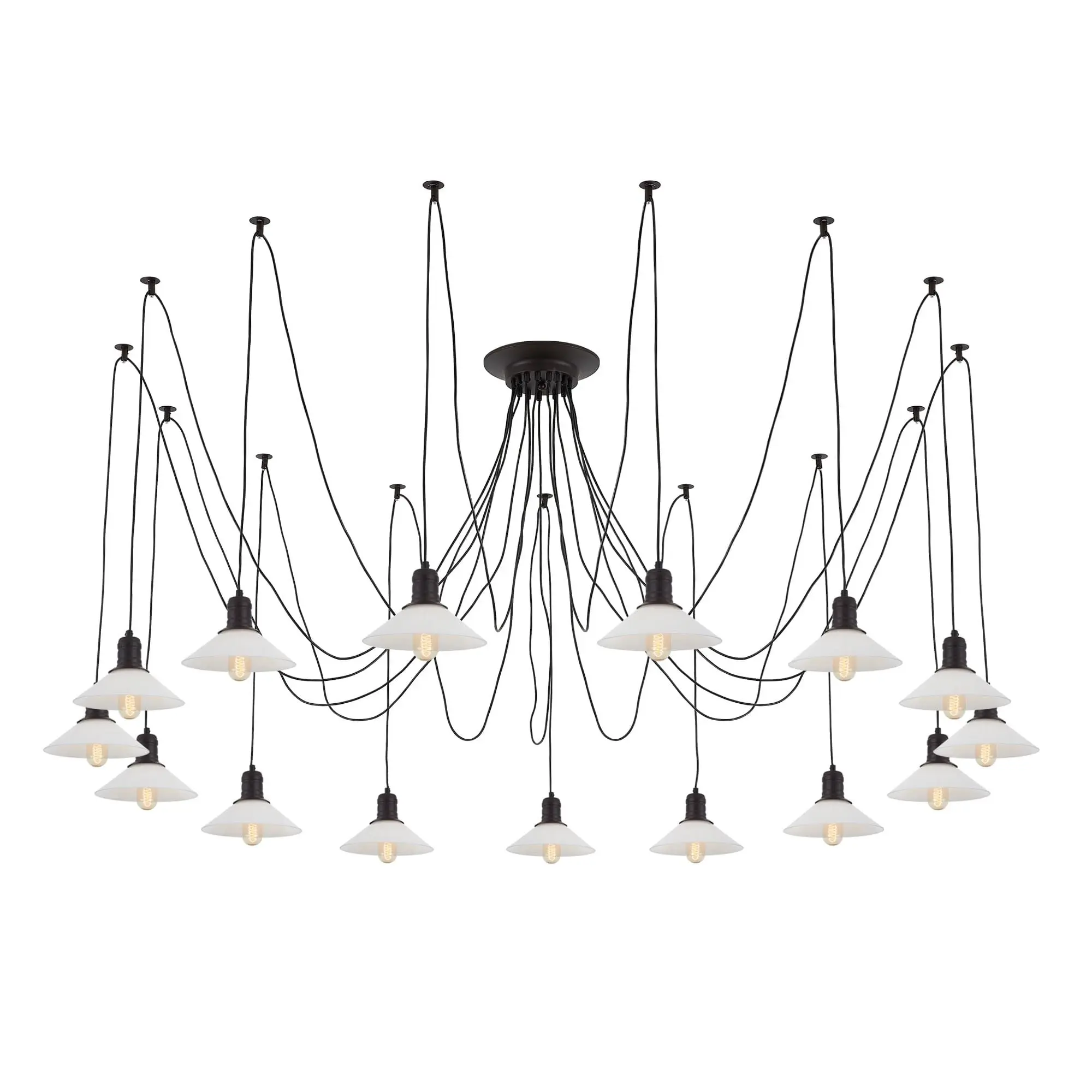 В изделии 15 ламп с цоколем Е27 максимальной мощностью для ламп накаливания 75Вт (в комплект не входят, приобретаются отдельно). Длинные провода (по 2,5м), в сочетании с дополнительным индивидуальным крепежом к потолку, позволяют при установке придать светильнику свою уникальную форму и легко адаптировать модель для высоких, стандартных и низких потолков. Тип крепления – планка.