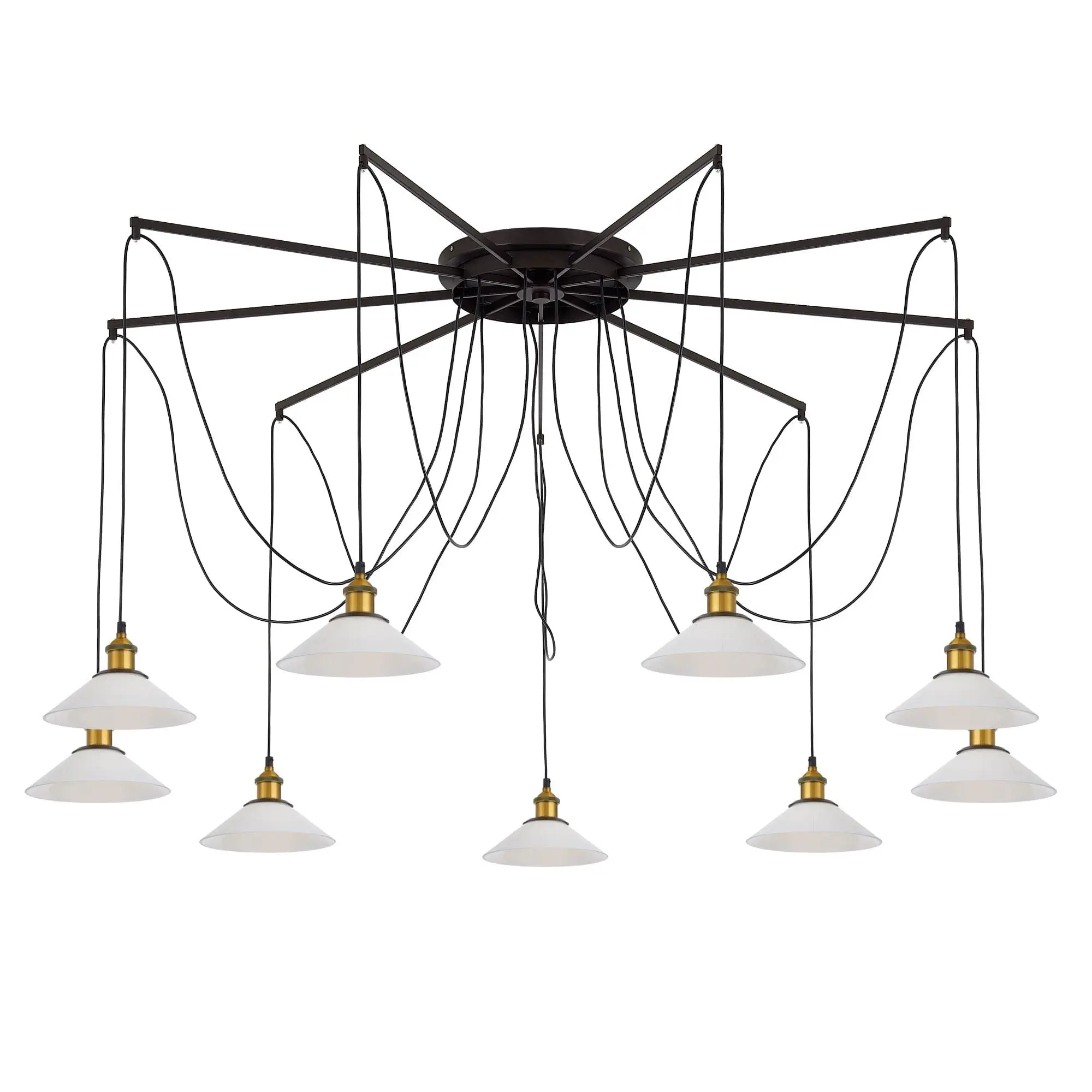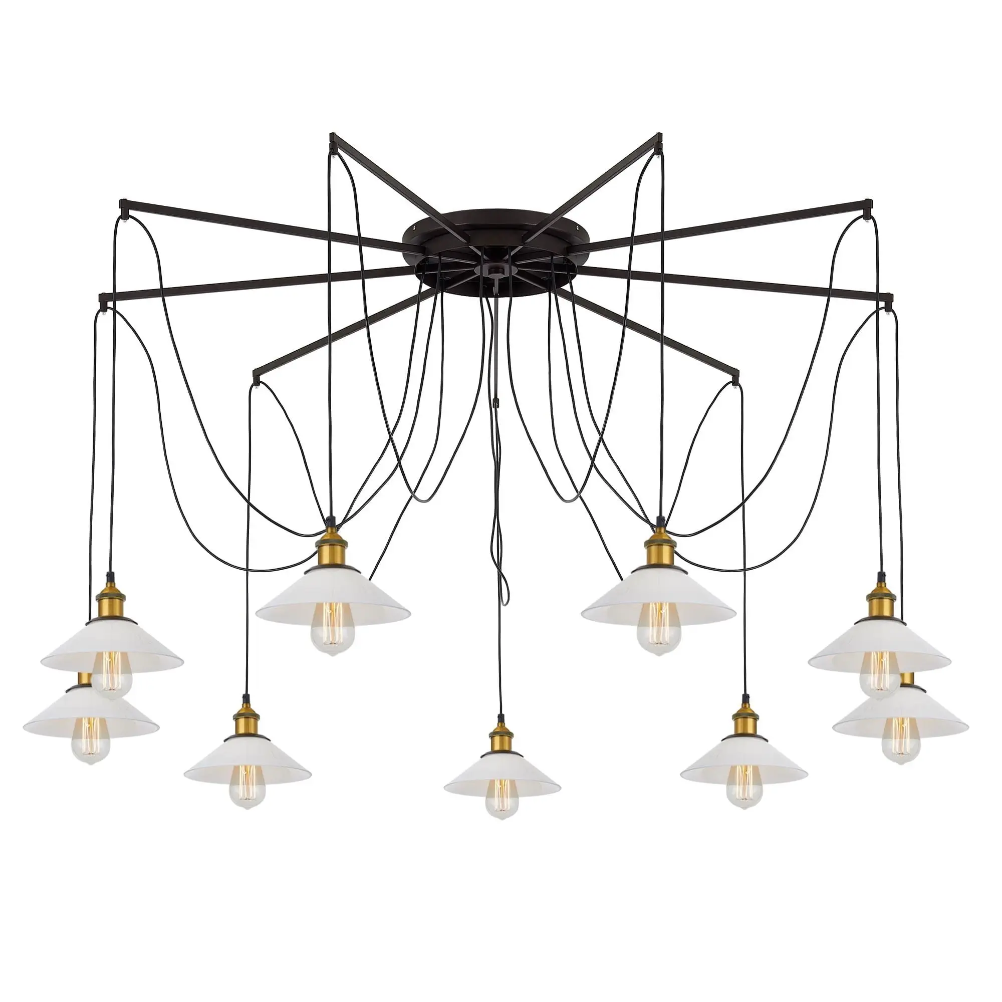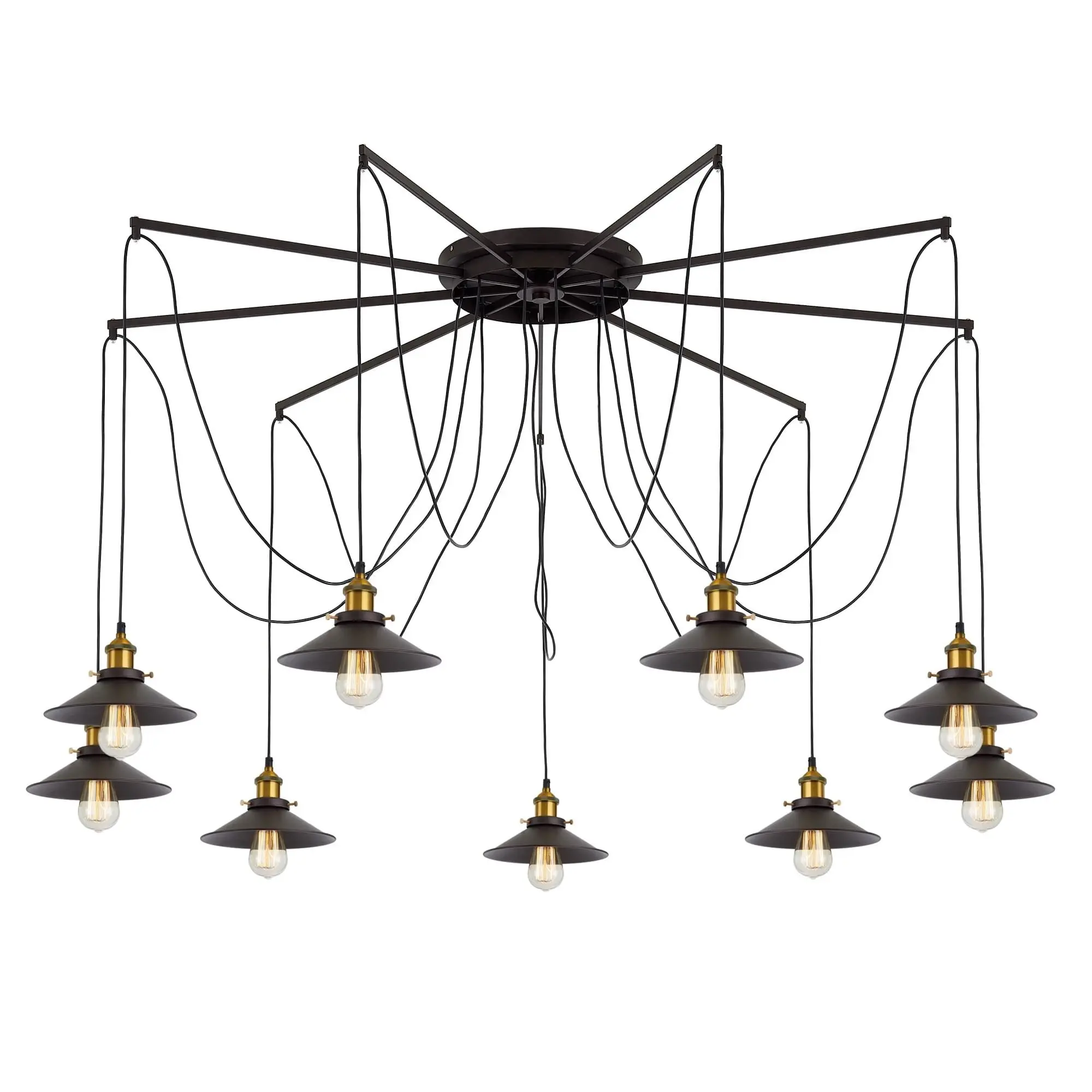 В изделии 9 ламп с цоколем Е27 максимальной мощностью для ламп накаливания 75Вт (в комплект не входят, приобретаются отдельно). Диаметр светильника 1,5м, длина каждого провода 2,15м, что позволит легко адаптировать модель для высоких, стандартных и низких потолков. Тип крепления – планка.