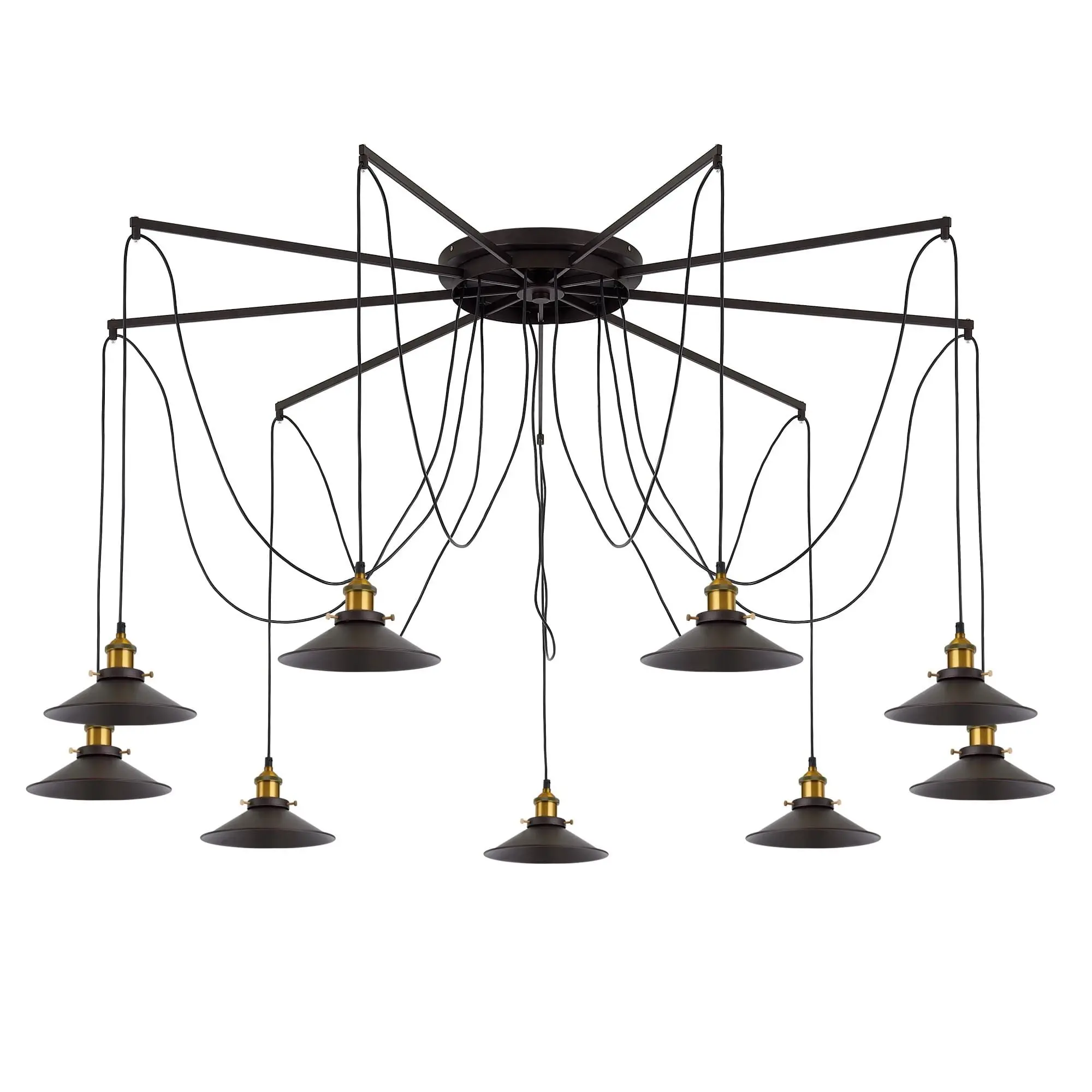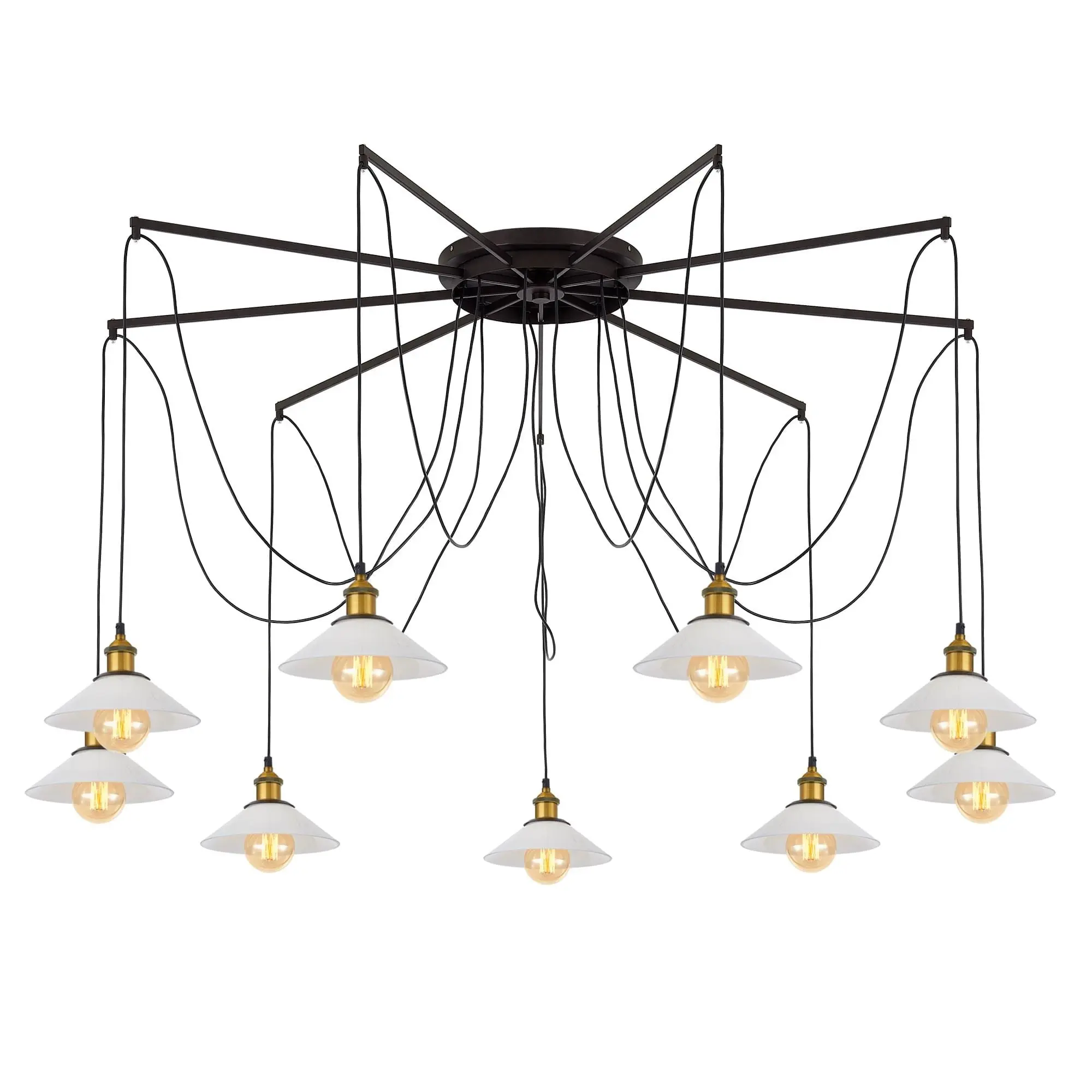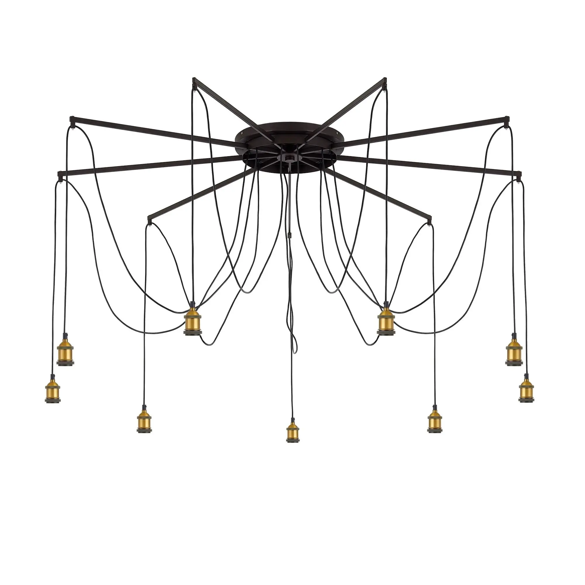В изделии 9 ламп с цоколем Е27 максимальной мощностью для ламп накаливания 75Вт (в комплект не входят, приобретаются отдельно). Диаметр светильника 1,5м, длина каждого провода 2,15м, что позволит легко адаптировать модель для высоких, стандартных и низких потолков. Тип крепления – планка.