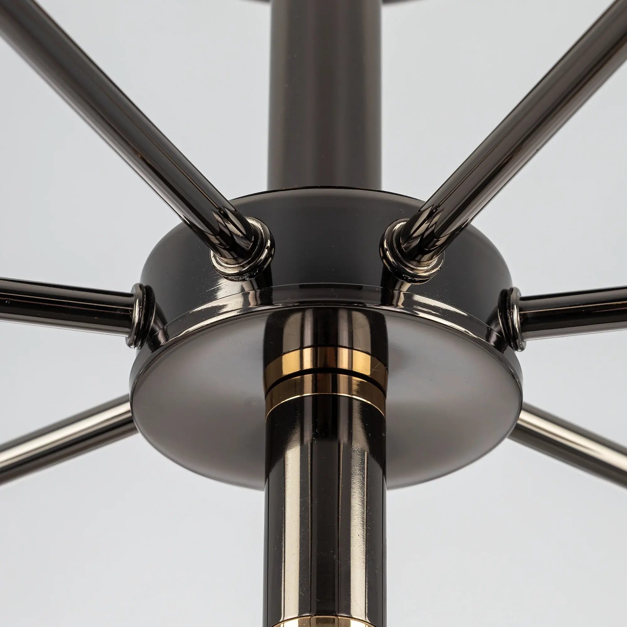 В изделии 7 ламп с цоколем G9 (подходят LED-лампы до 10Вт, диаметр не более 18мм). Диаметр светильника 72см. Высоту можно выбрать при сборке: плафоны вверх – 23, 38, 53 и 68см; плафоны вниз – 27, 42, 54 и 72см. Модель подходит для комнат с высокими и низкими потолками, в том числе натяжными, тип крепления – планка. Работает с одноклавишным и двухклавишным выключателем.