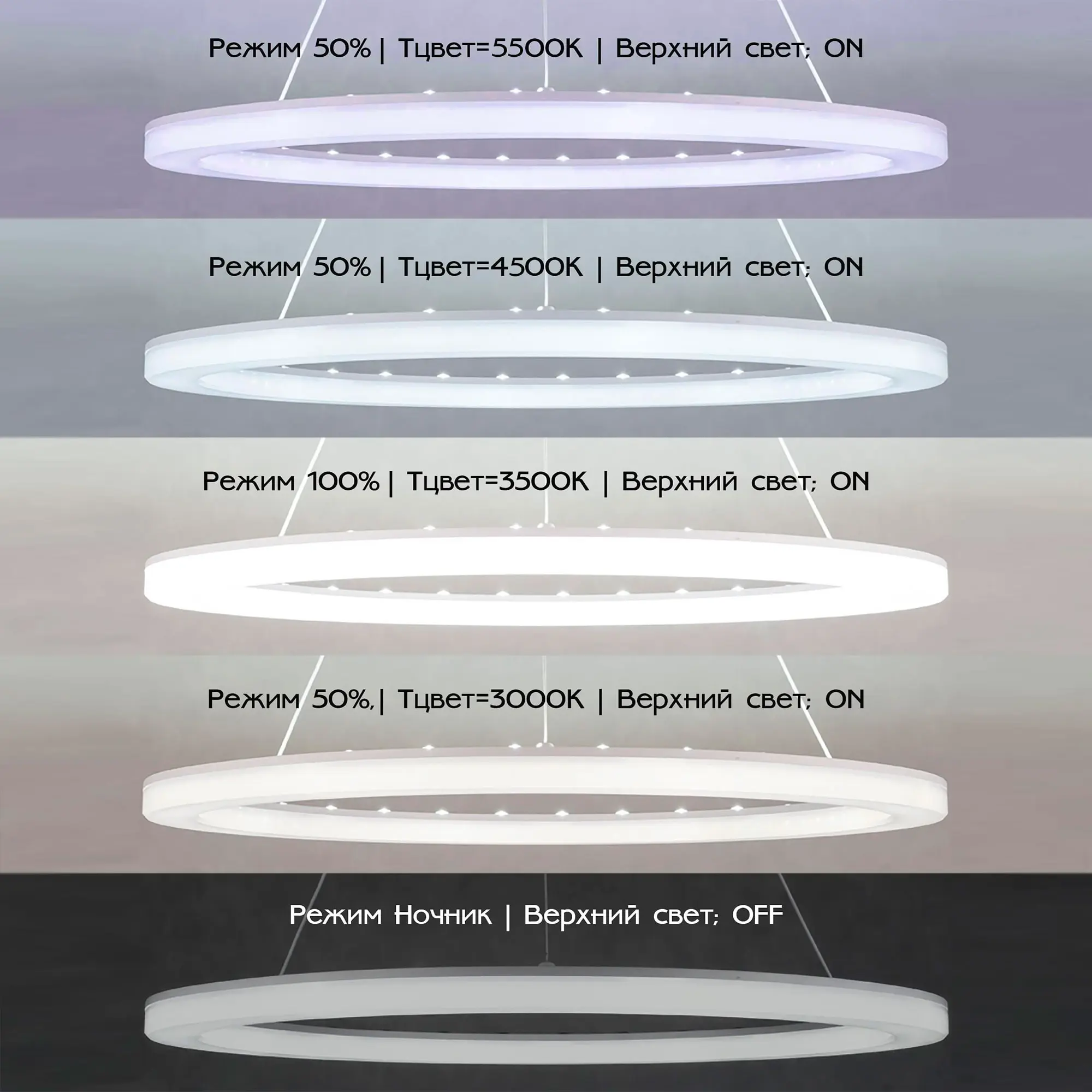 Пульт ДУ обладает широким набором функций: регулировка яркости от 100% до 10%; управление цветовой температурой в диапазоне 3000-5500К, позволяет настроить любые оттенки теплого, нейтрального или холодного света; 2 режима цветной RGB подсветки основания; отсроченное выключения и режим ночника; 4 кнопки памяти, на которых можно сохранить любые выбранные настройки и включать их в одно касание; 4 выделенных канала, к которым можно привязать неограниченное количество светильников.
