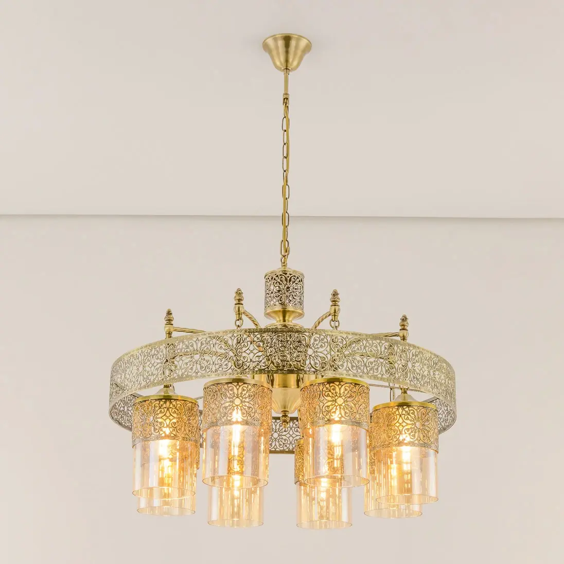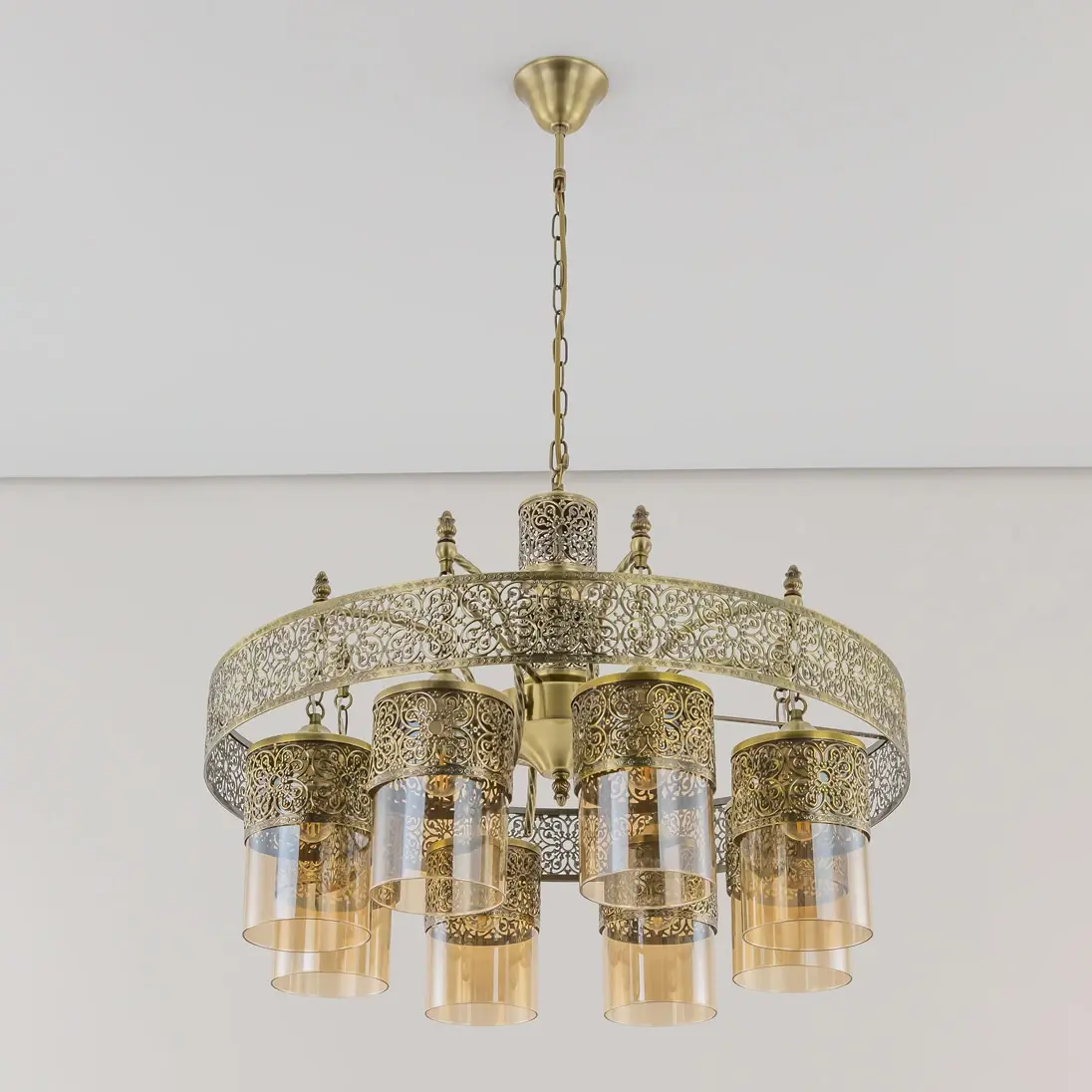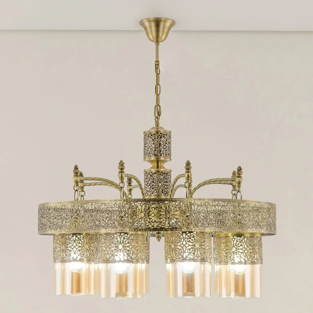 Люстра с подвесными плафонами Citilux Эмир CL467183 выполнена в восточном стиле. Корпус металлический, благородного бронзового цвета. Плафоны цилиндрической формы изготовлены из прозрачного стекла светло-янтарного оттенка. Светильник искусно украшен ажурной чеканкой.