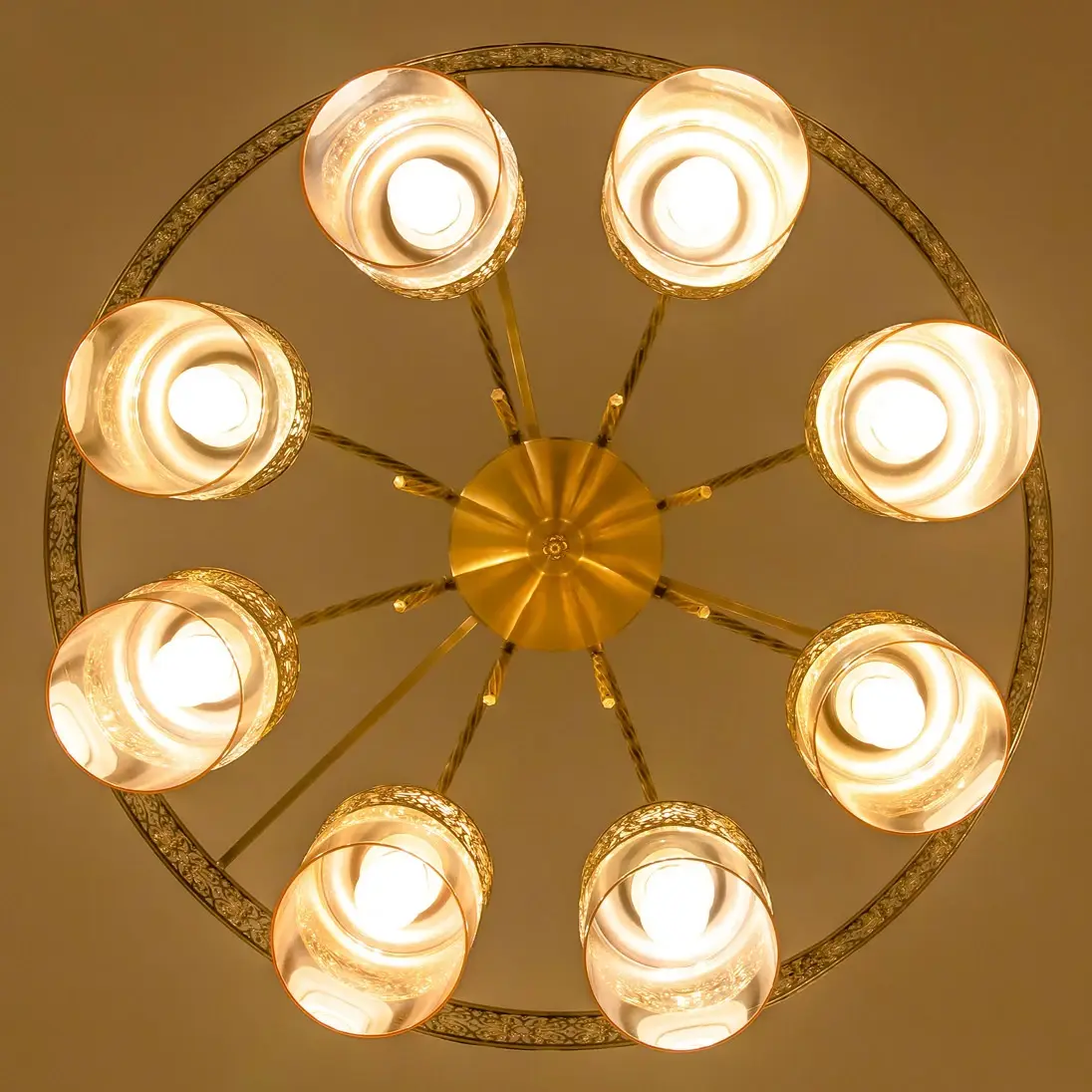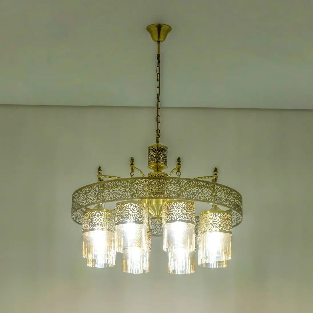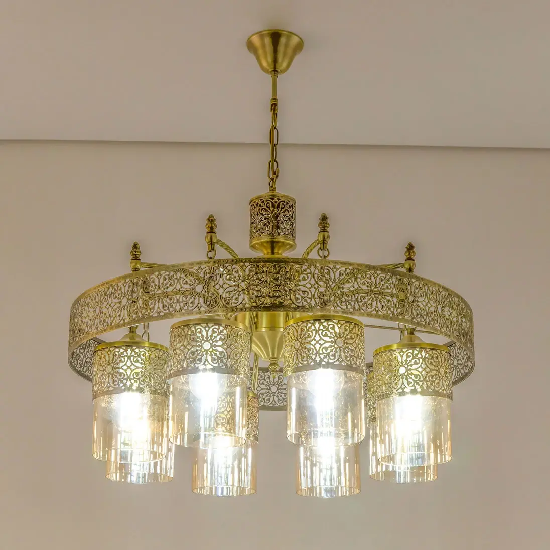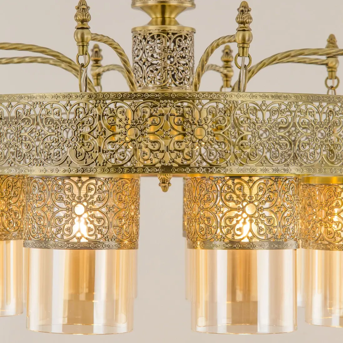 Люстра с подвесными плафонами Citilux Эмир CL467183 выполнена в восточном стиле. Корпус металлический, благородного бронзового цвета. Плафоны цилиндрической формы изготовлены из прозрачного стекла светло-янтарного оттенка. Светильник искусно украшен ажурной чеканкой.