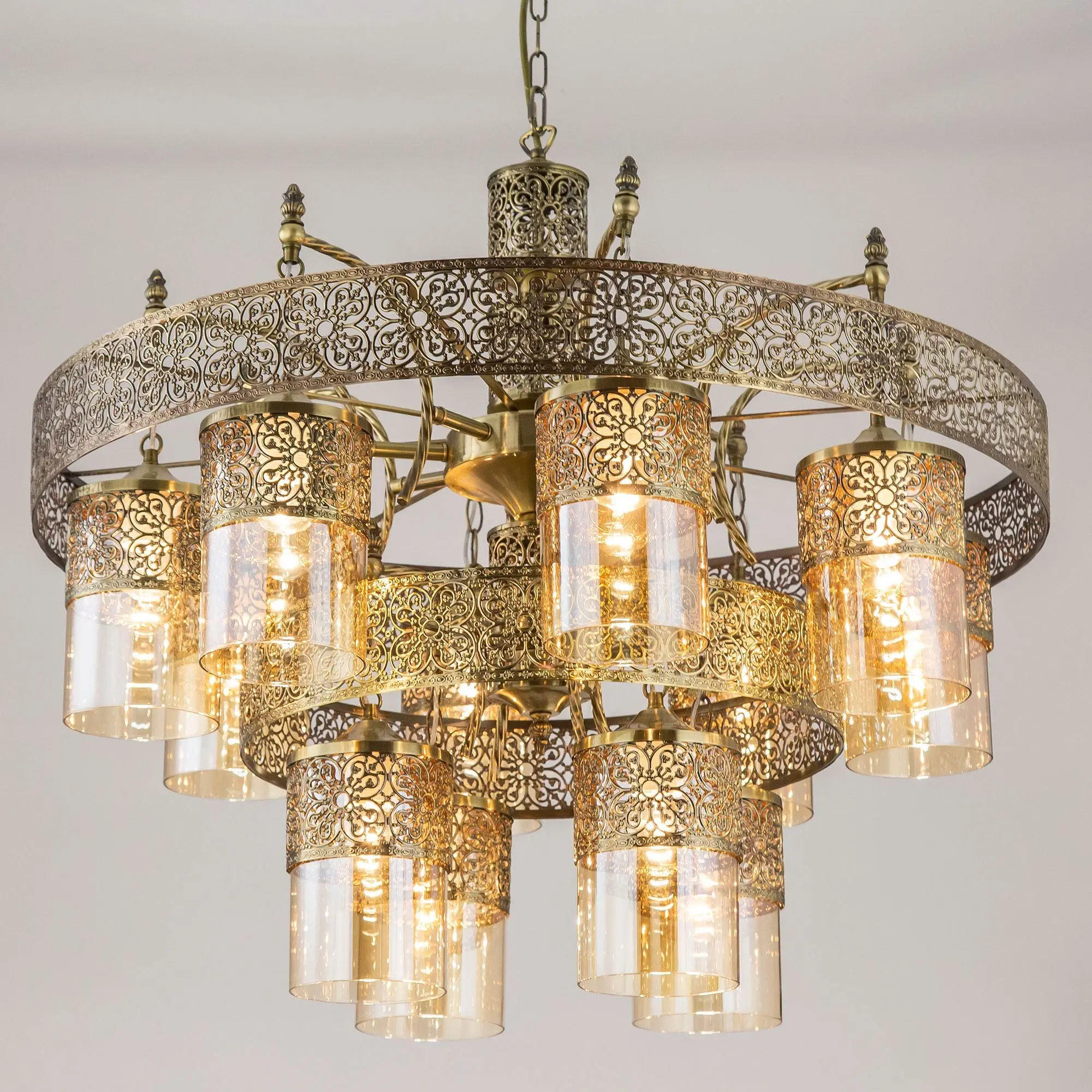 Потрясающая двухъярусная люстра с подвесными плафонами Citilux Эмир CL467193 выполнена в восточном стиле. Корпус металлический, благородного бронзового цвета. Плафоны цилиндрической формы изготовлены из прозрачного стекла светло-янтарного оттенка. Светильник искусно украшен ажурной чеканкой.