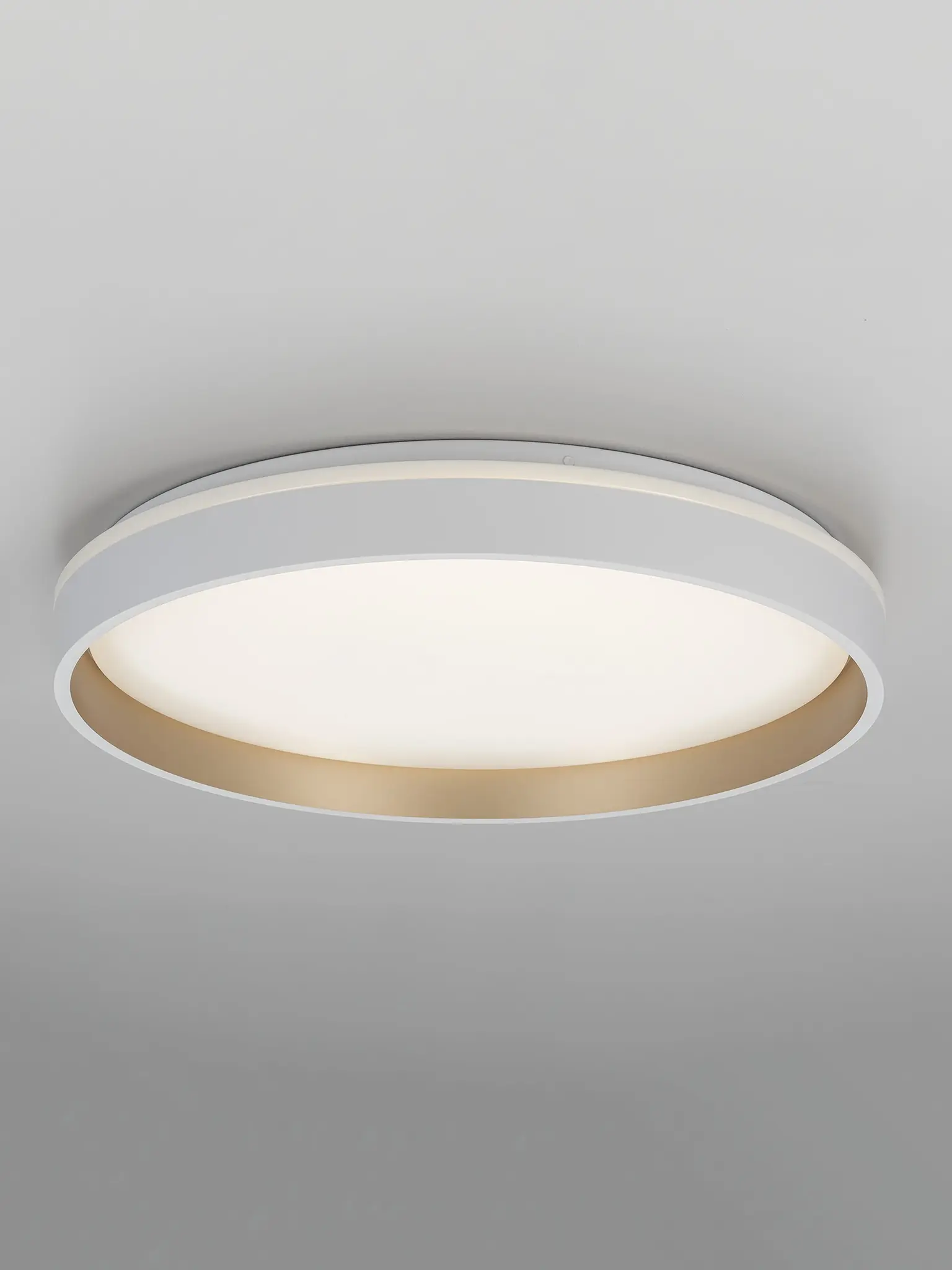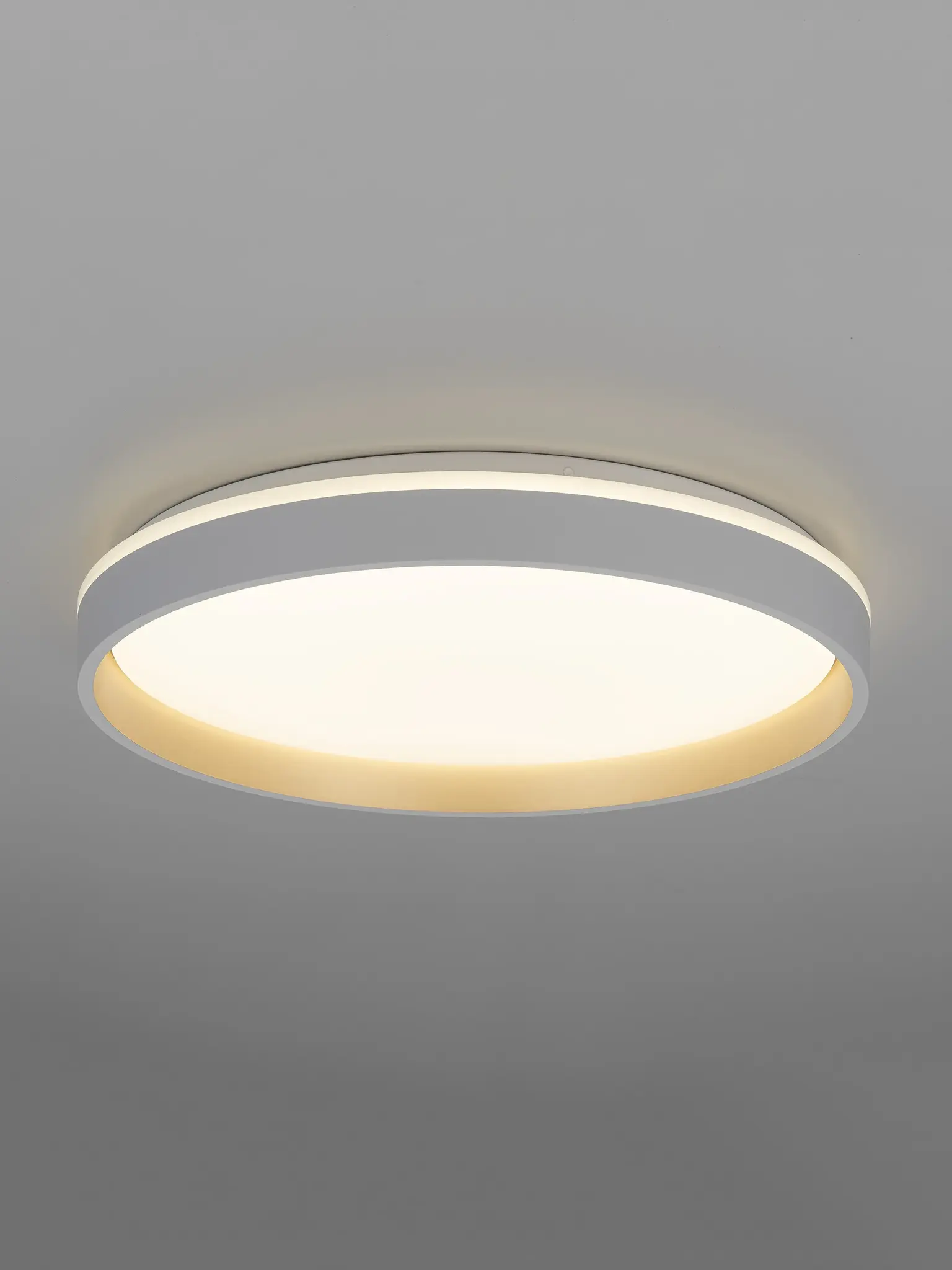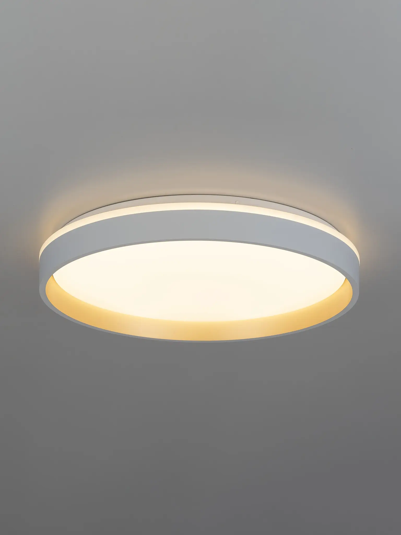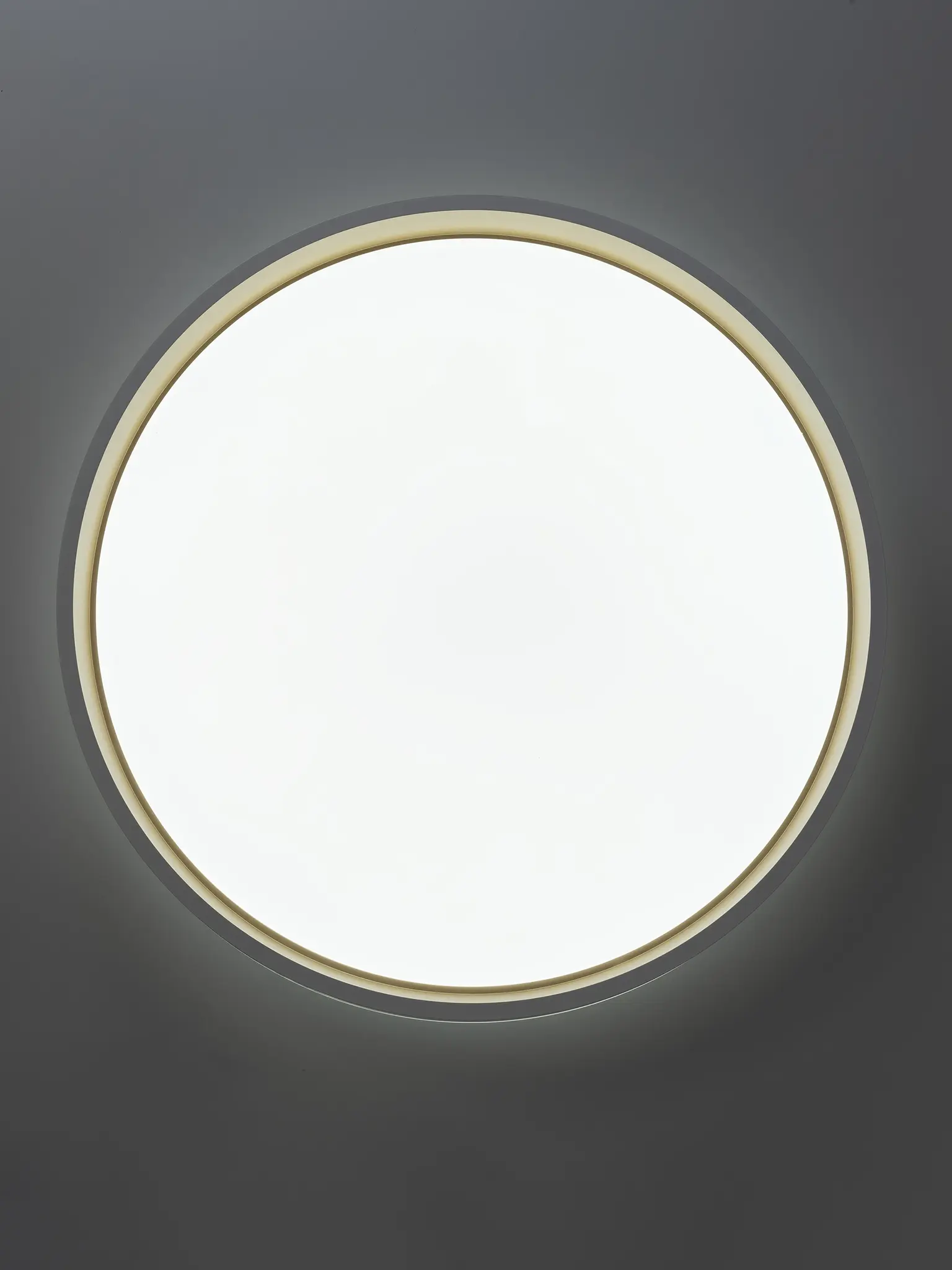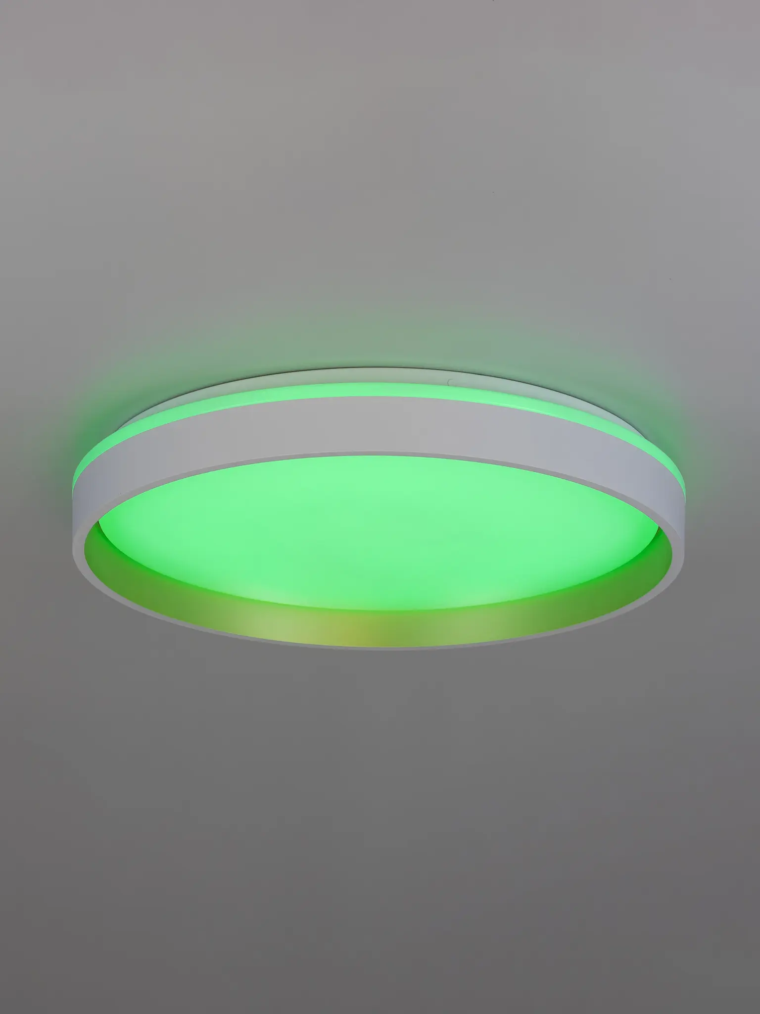 Светодиодный потолочный светильник Citilux ENZO CL753450G с яркой цветной RGB подсветкой выполнен в современно стиле. Основание металлическое. Плафон круглой формы из прочного полимера белого цвета с золотой декоративной окантовкой и рассеивателем из оптического полимера. Благодаря оригинальной конструкции, светильник равномерно освещает помещение и дополнительно подсвечивает потолок, что придаёт пространству дополнительный объём.