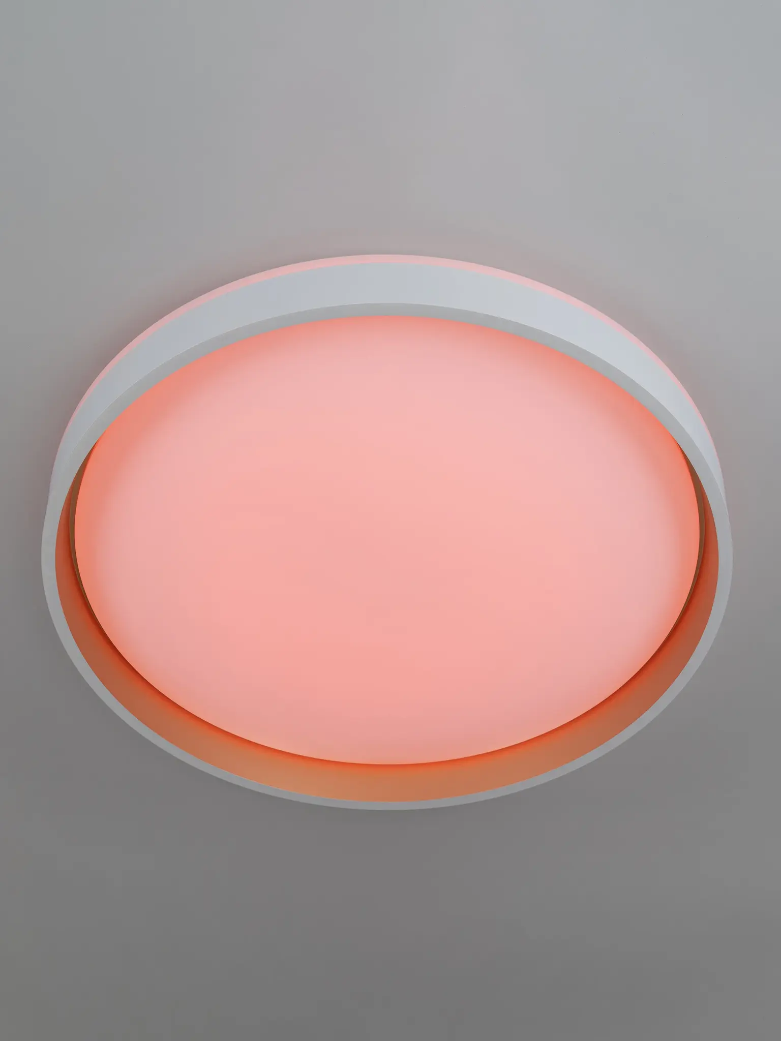 Мощность изделия 68Вт, световой поток 5800Лм. С помощью пульта дистанционного управления пользователь может плавно регулировать яркость 10% - 100%, менять цветовую температуру в диапазоне 3000K - 5500K, что позволяет настроить любые оттенки теплого, нейтрального или холодного света. Цветная многорежимная RGB подсветка может наполнить пространство яркими и насыщенными цветами. Функция таймера и 4 настраиваемых режима памяти позволяют управлять светильником максимально комфортно.