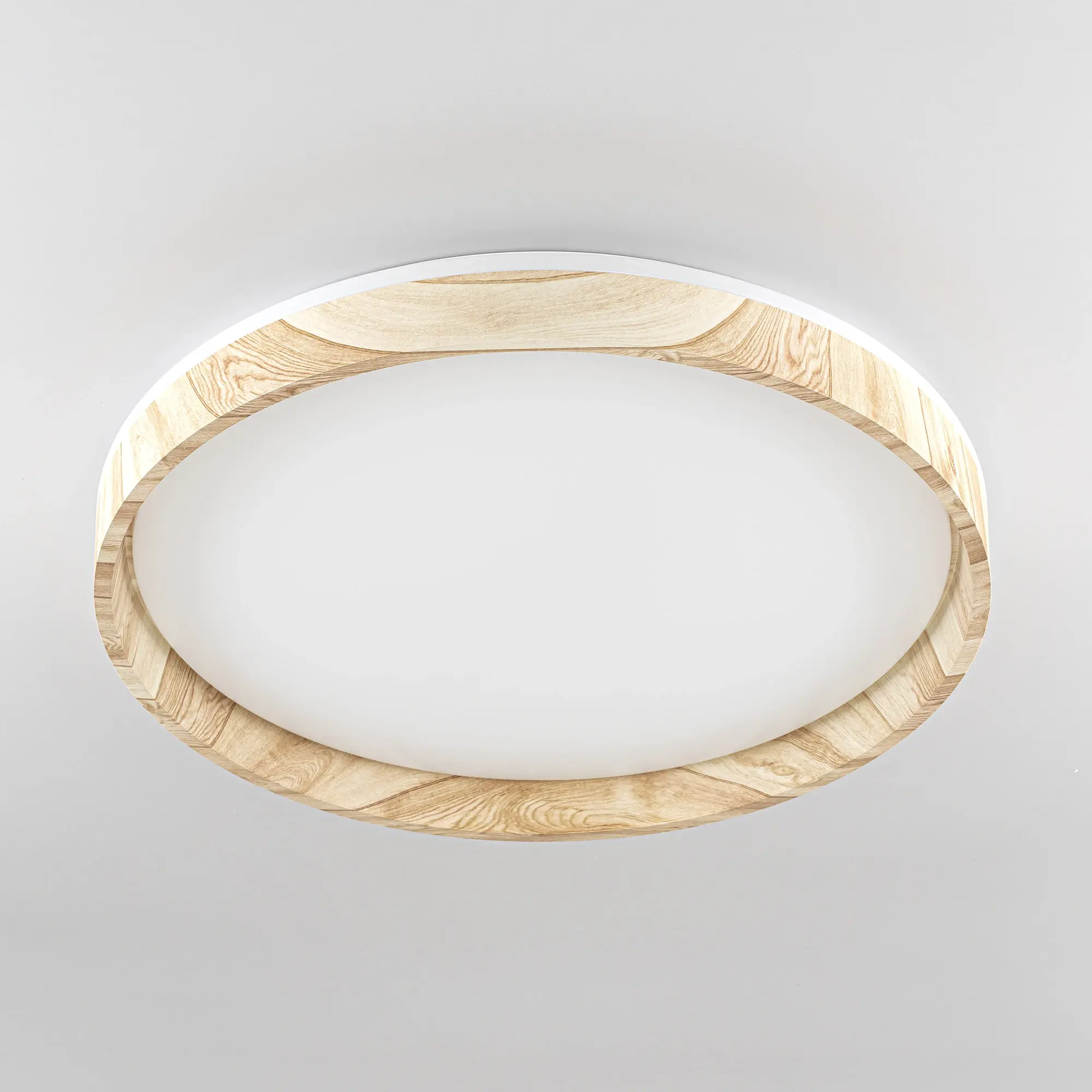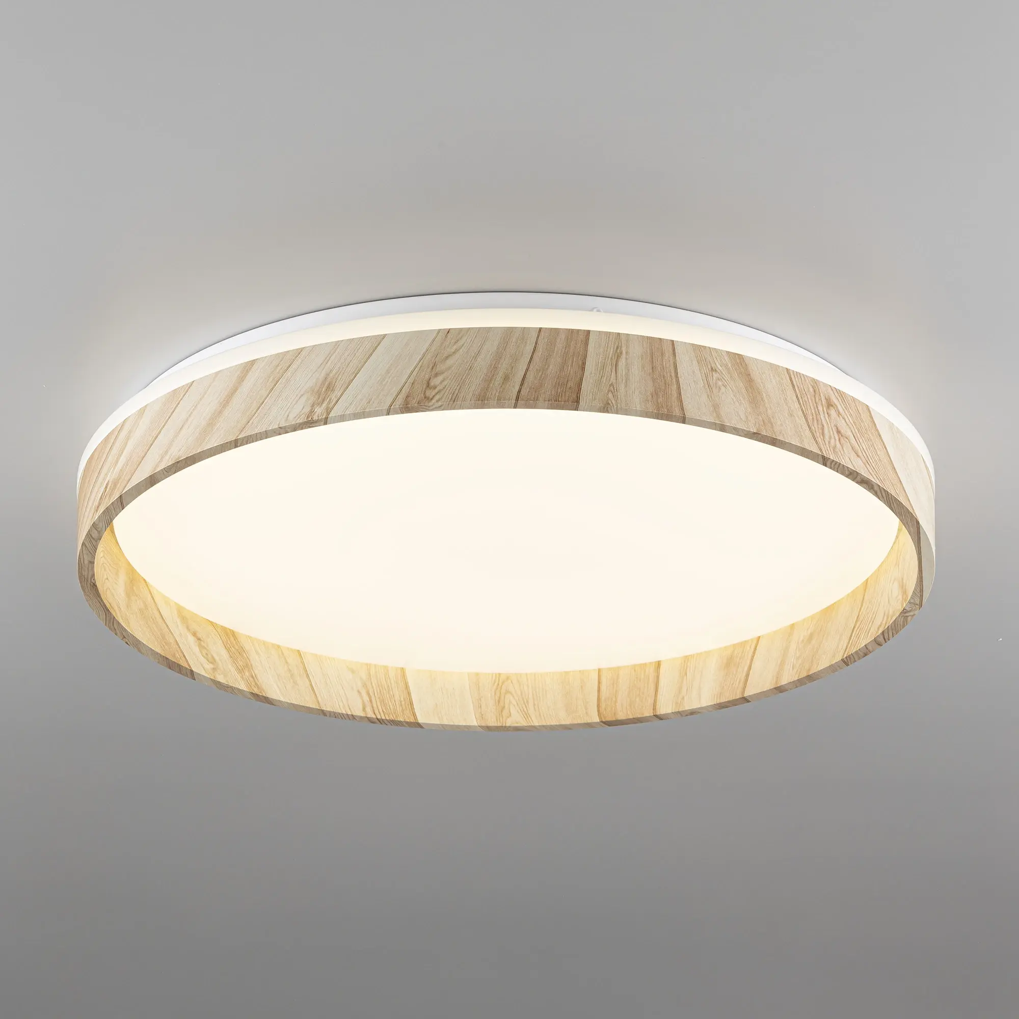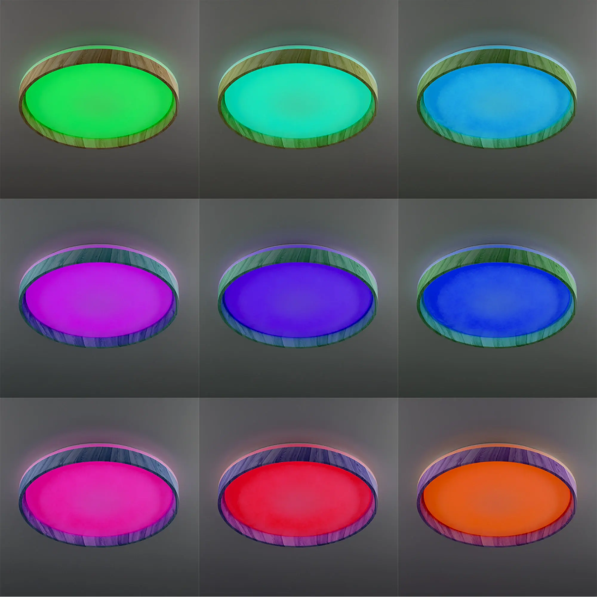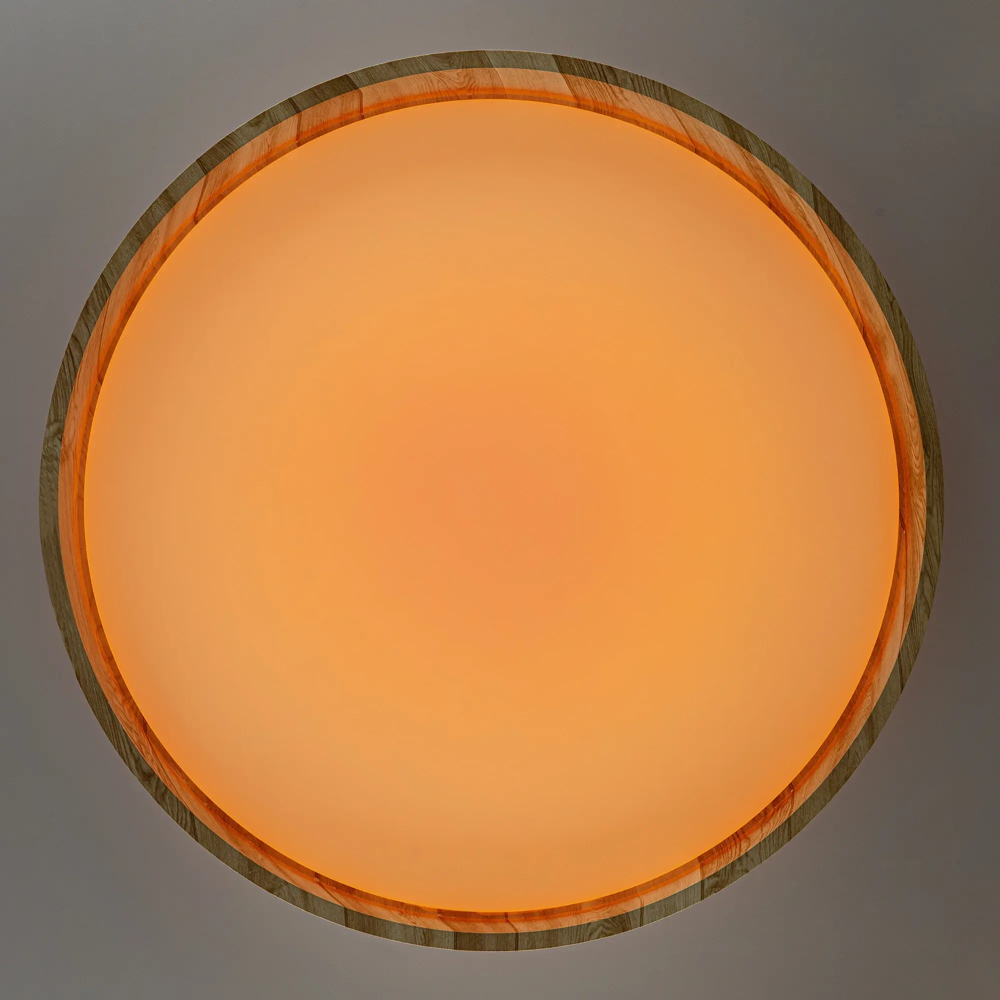 Светодиодный потолочный светильник Citilux ENZO CL753452G с яркой цветной RGB подсветкой выполнен в современно стиле. Основание металлическое. Плафон круглой формы с отделкой под дерево и матовым рассеивателем изготовлен из оптического полимера. Благодаря оригинальной конструкции, светильник равномерно освещает помещение и дополнительно подсвечивает потолок, что придаёт пространству дополнительный объём.