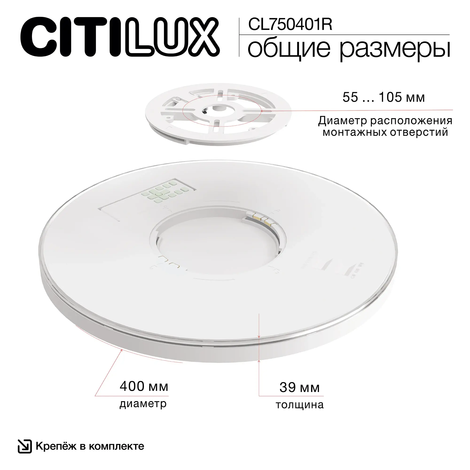 Изделие обладает высокой энергоэффективностью основного света – 120Лм/Вт, осветит до 17м². Мощность: основной свет - 32Вт, потолочная подсветка – 8Вт. Диаметр 40см, высота 3,9см. Тип крепления – удобная монтажная платформа. Исключительно лёгкий монтаж!