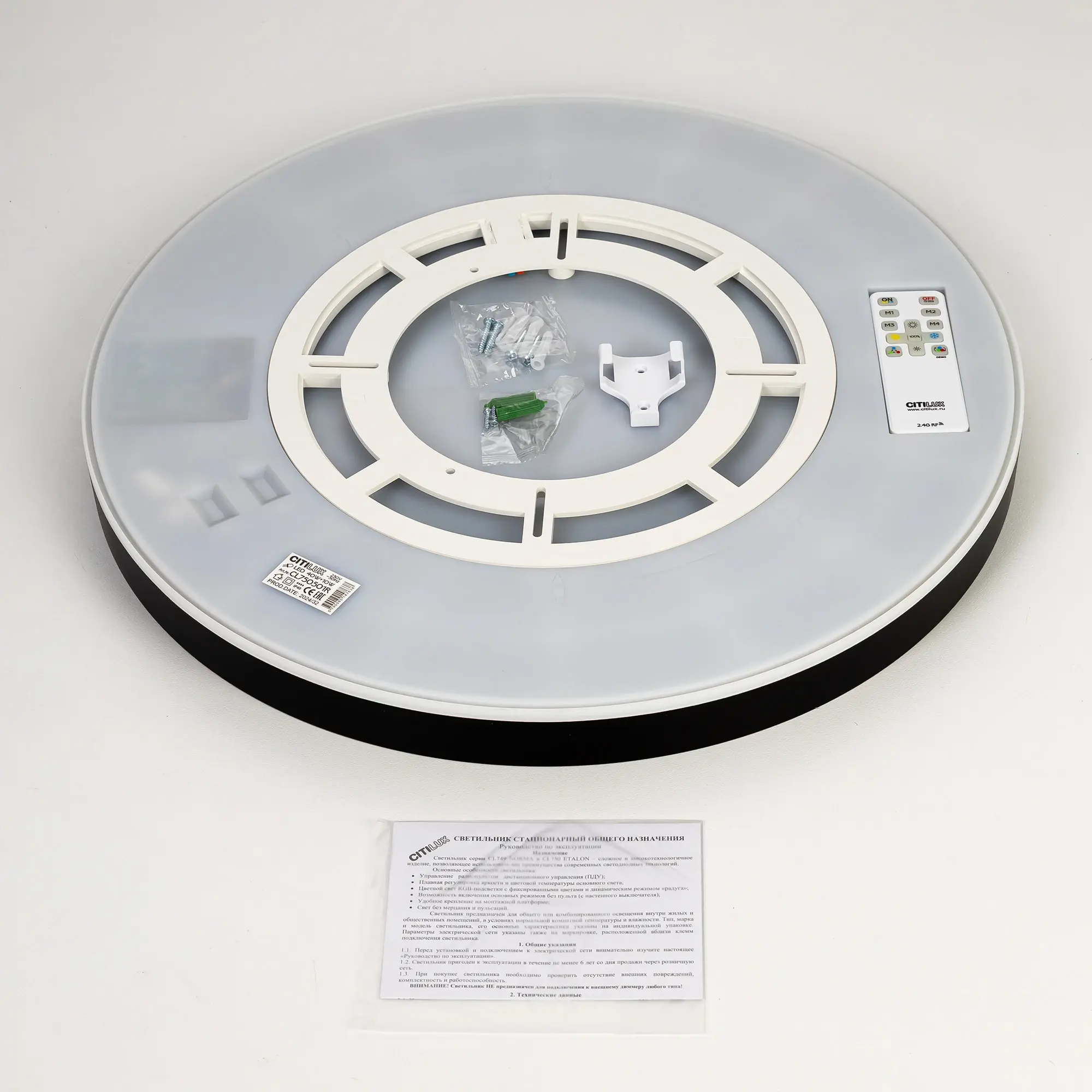 Изделие обладает высокой энергоэффективностью основного света – 120Лм/Вт, осветит до 21м². Мощность: основной свет - 40Вт, потолочная подсветка – 10Вт. Диаметр 50см, высота 3,9см. Тип крепления – удобная монтажная платформа. Исключительно лёгкий монтаж!