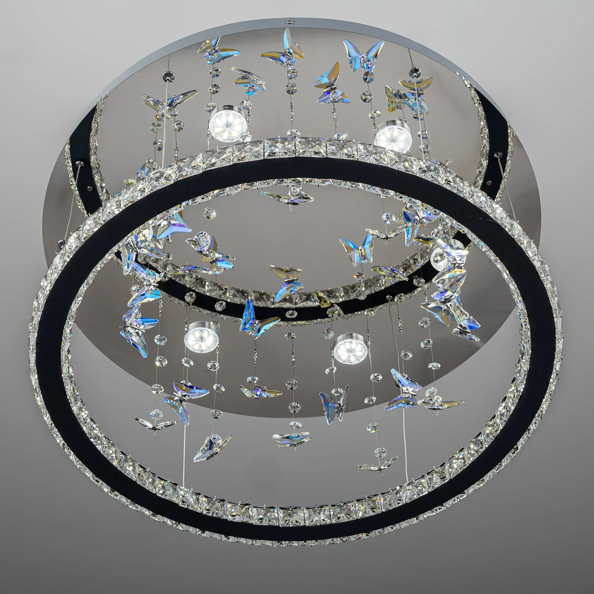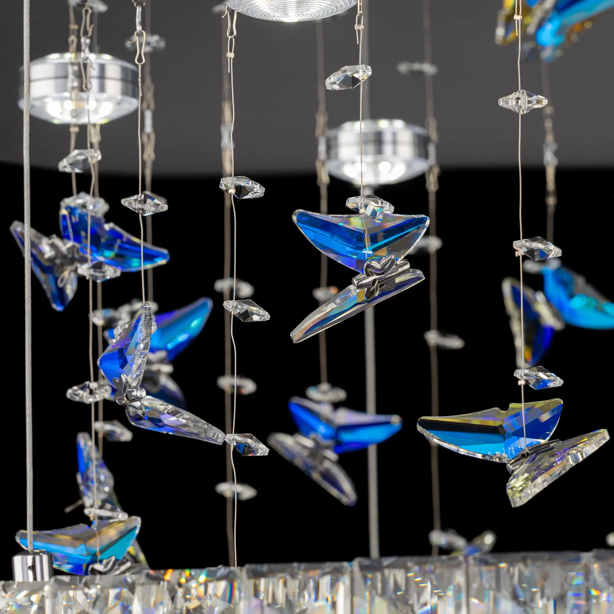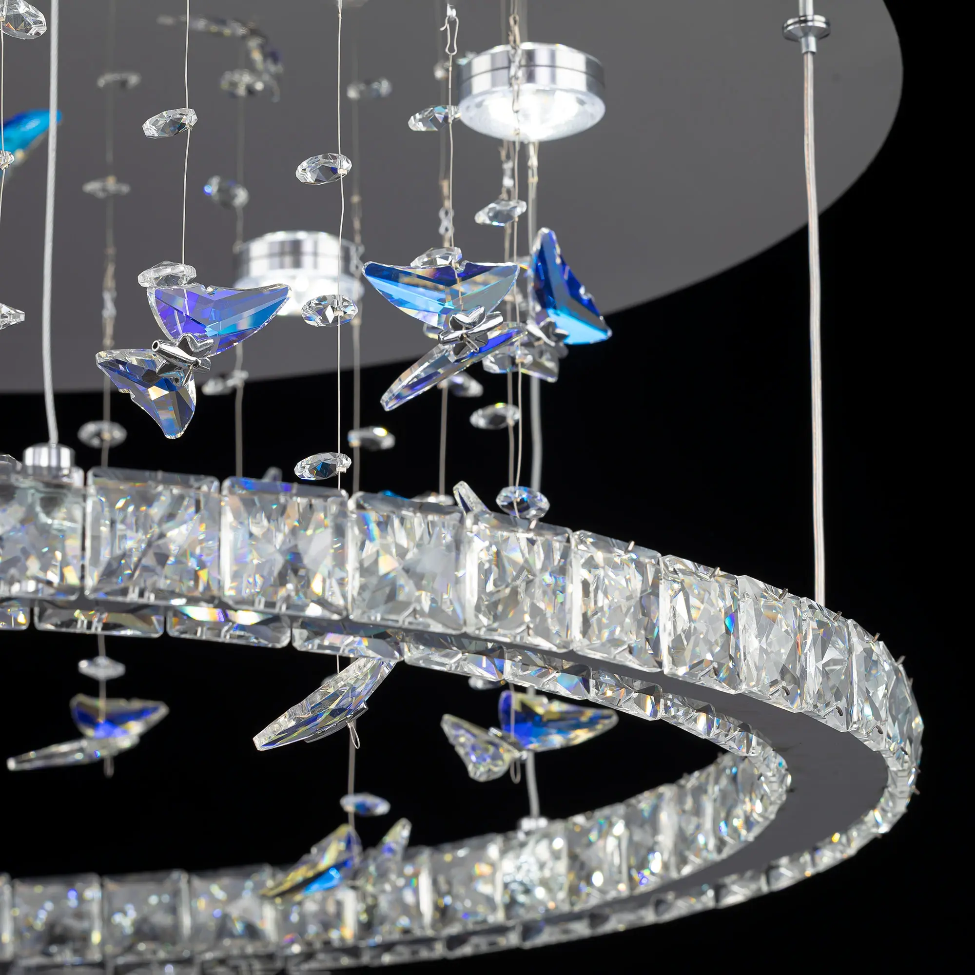 Светодиодная потолочная люстра Citilux ETERA CL322050 словно соткано из света и хрусталя. Основание, круглое и безупречно гладкое, отливает зеркальным блеском хрома, добавляя интерьеру современную лаконичность. Подвесное кольцо из огранённого хрусталя рассыпает по стенам искристые блики, а изящные подвески в форме бабочек, отливают глубокой синевой.