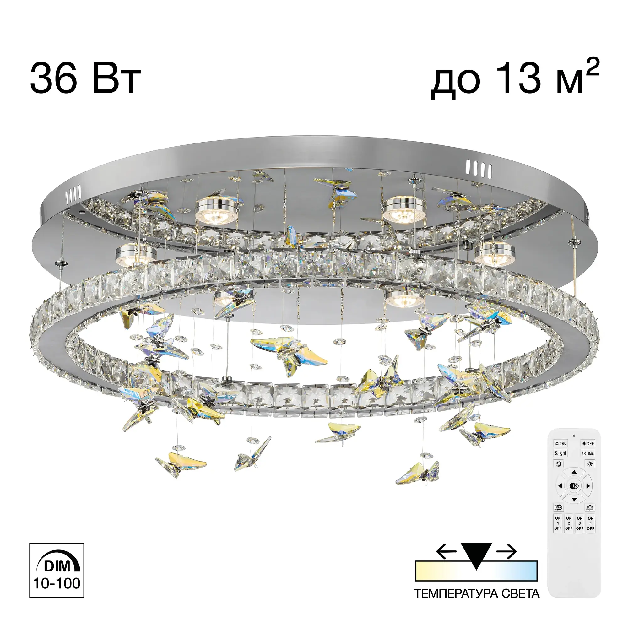 С помощью пульта вы легко настроите нужную атмосферу в комнате: плавно измените яркость от мягкого свечения (10%) до яркого дневного света (100%), выберите оттенок — от тёплого золотистого (3000K) до холодного кристально-белого (5500K). А если вечером вам нужно лишь лёгкое сияние, включите режим ночника или установите таймер отключения, чтобы свет мягко погас. Четыре независимых канала управления, позволяют синхронизировать люстру с другими светильниками коллекции, создавая гармоничную световую композицию.