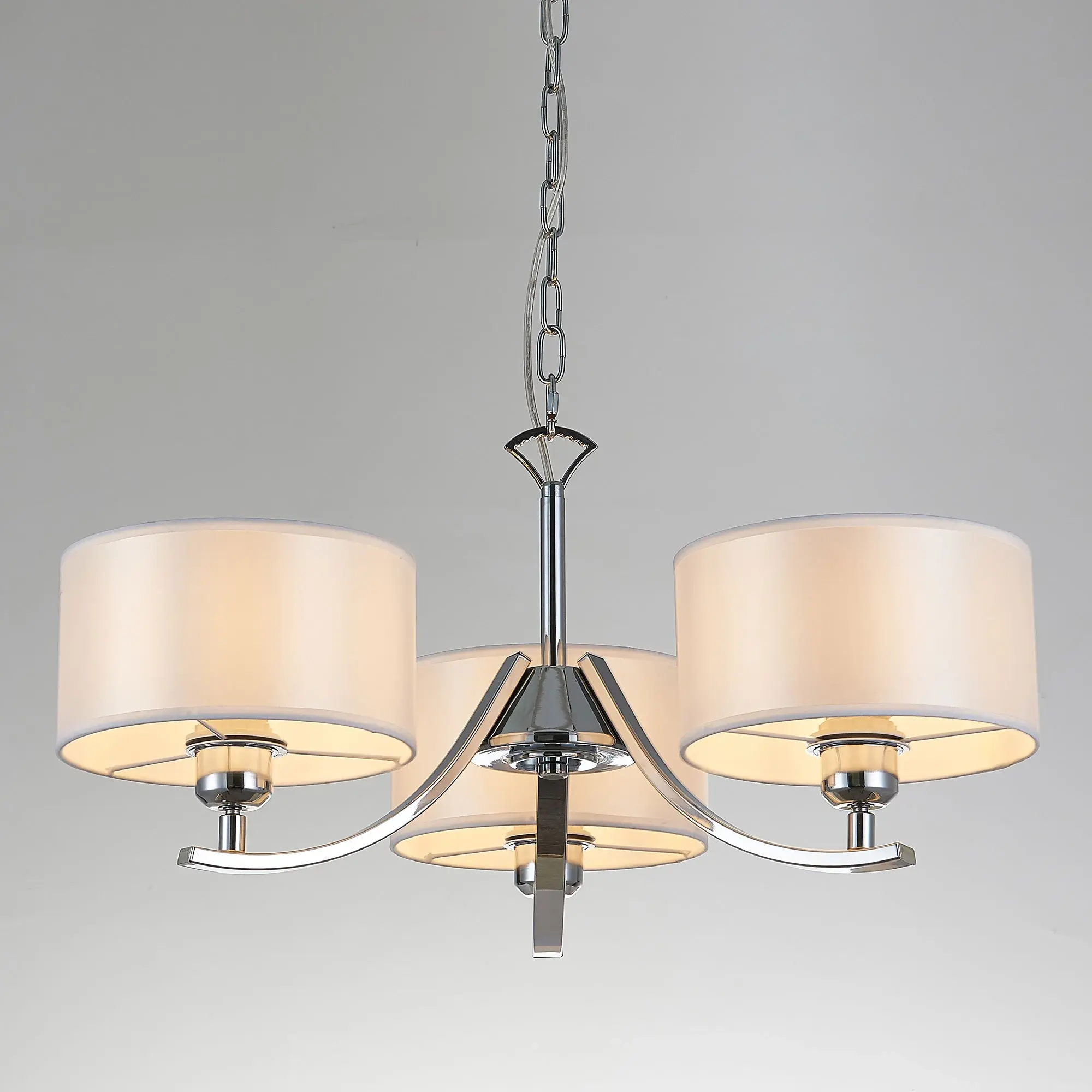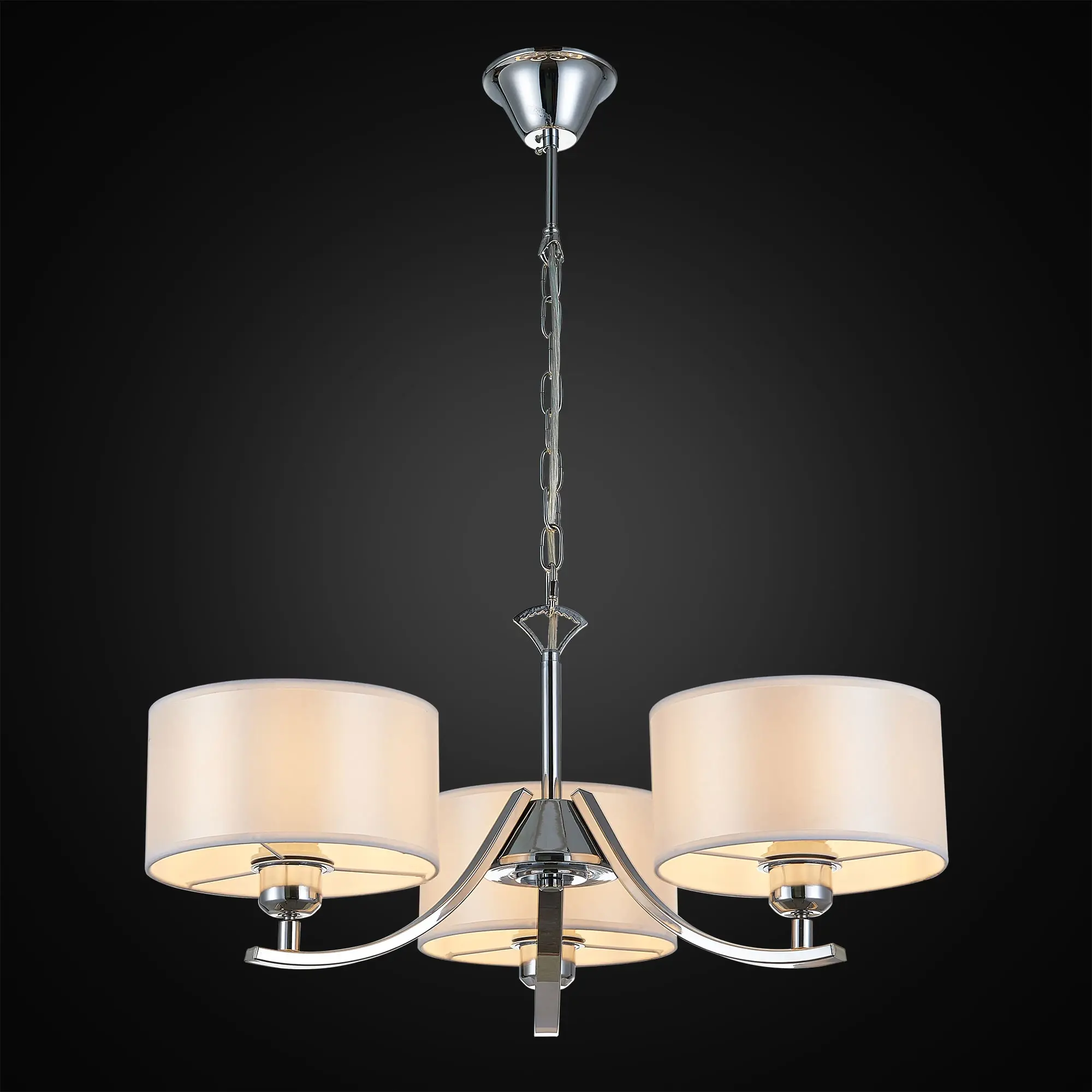 Люстры подвесные серии «Эвита» стильные и элегантные представители неоклассики. Очень необычное сочетание форм заложено в рожках – плавные классические дуги прямоугольной формы. Дополняют великолепную арматуру не стандартные по диаметру абажуры. Наши дизайнеры специально разработали абажуры немного большего диаметра, чем обычно это принято применять в подобных моделях. Идея оправдалась сполна – абажуры органично заполняют центр люстры, за счёт данного нюанса светильник привносит в интерьер дополнительный уют и комфорт. Помимо дизайнерских изюминок, постарались и наши инженера – они оснастили рожки светильника шарнирными механизмами. За счёт шарниров абажуры можно направлять в различные стороны, что сразу кардинально меняет дизайн люстры. Так же данный конструктивный момент позволяет направить рассеяние света так, как это будет оптимально в помещении. Абажуры приятного, молочного оттенка, позволяют организовать мягкое, рассеянное освещение. Люстра крепится на крючок и имеет длинную цепь с карабином, который позволяет легко отрегулировать ее по высоте. Минимальная высота всего 40 сантиметров, что позволяет применять светильники коллекции даже на самых низких потолках. Трёх рожковый светильник полноценно может осветить площадь до 12 квадратных метров.