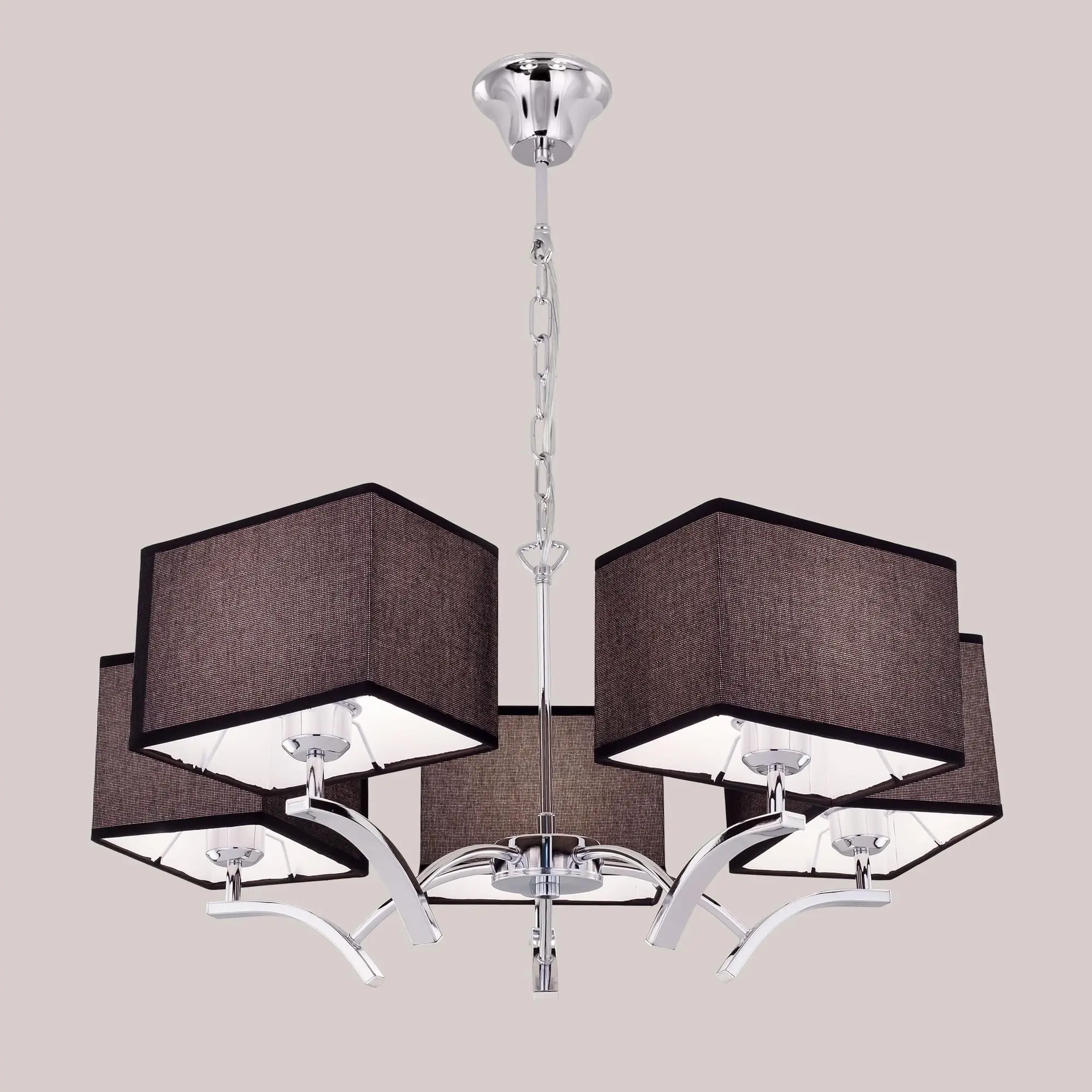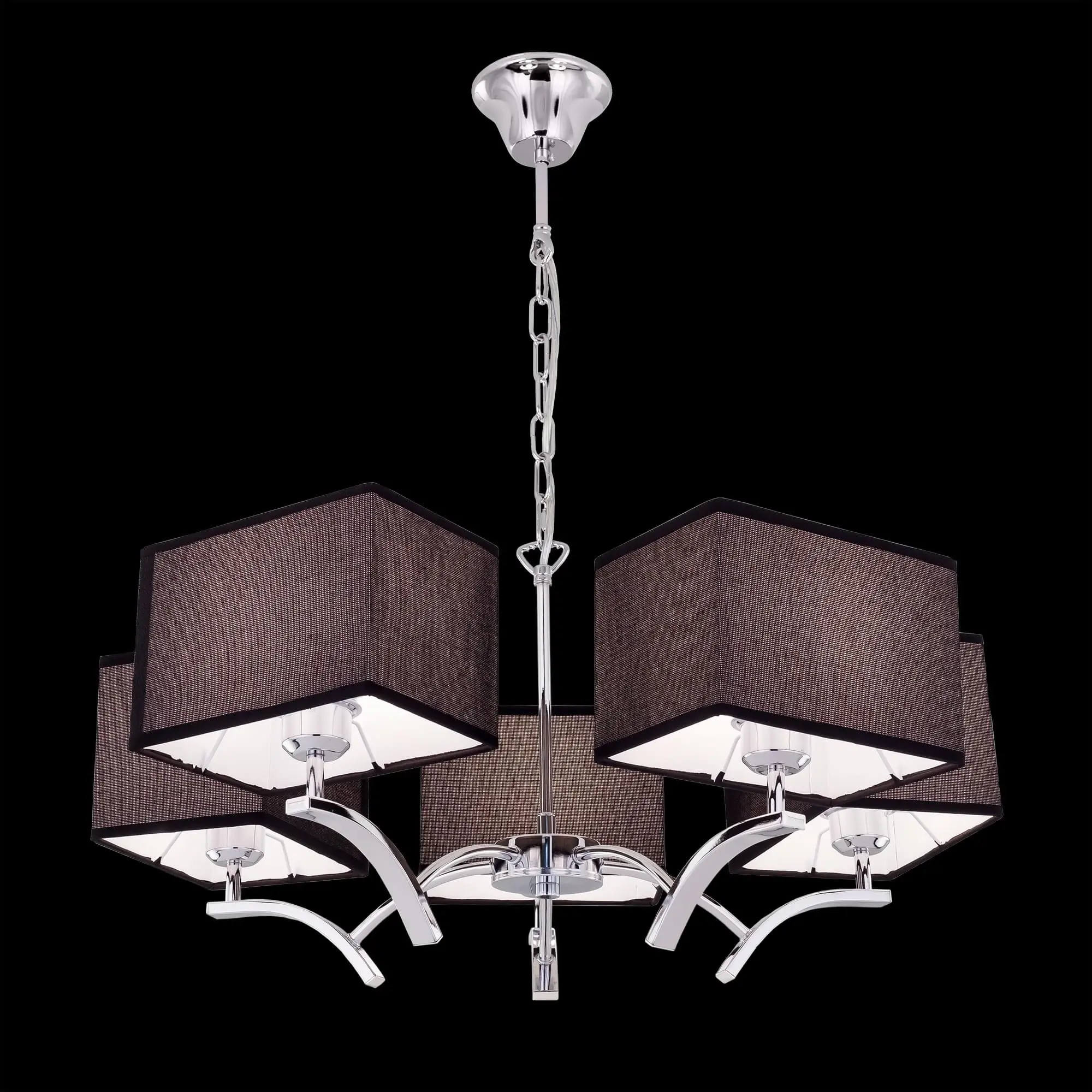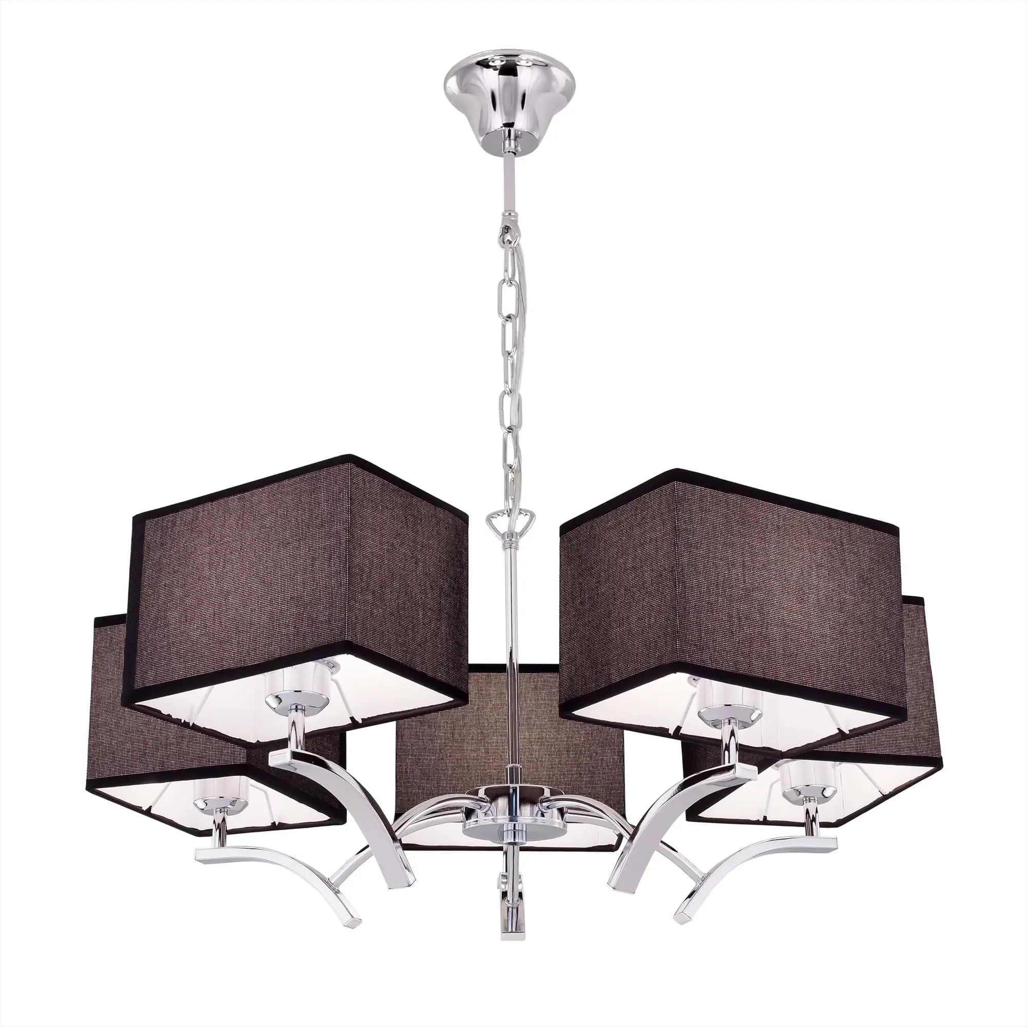 В изделии 5 ламп с цоколем Е27 максимальной мощностью для ламп накаливания 75Вт (в комплект не входят, приобретаются отдельно). Диаметр светильника 64см, высота легко регулируется в диапазоне от 45см до 1,1м. Модель подходит для всех типов потолков, в том числе натяжных, тип крепления – крючок.
