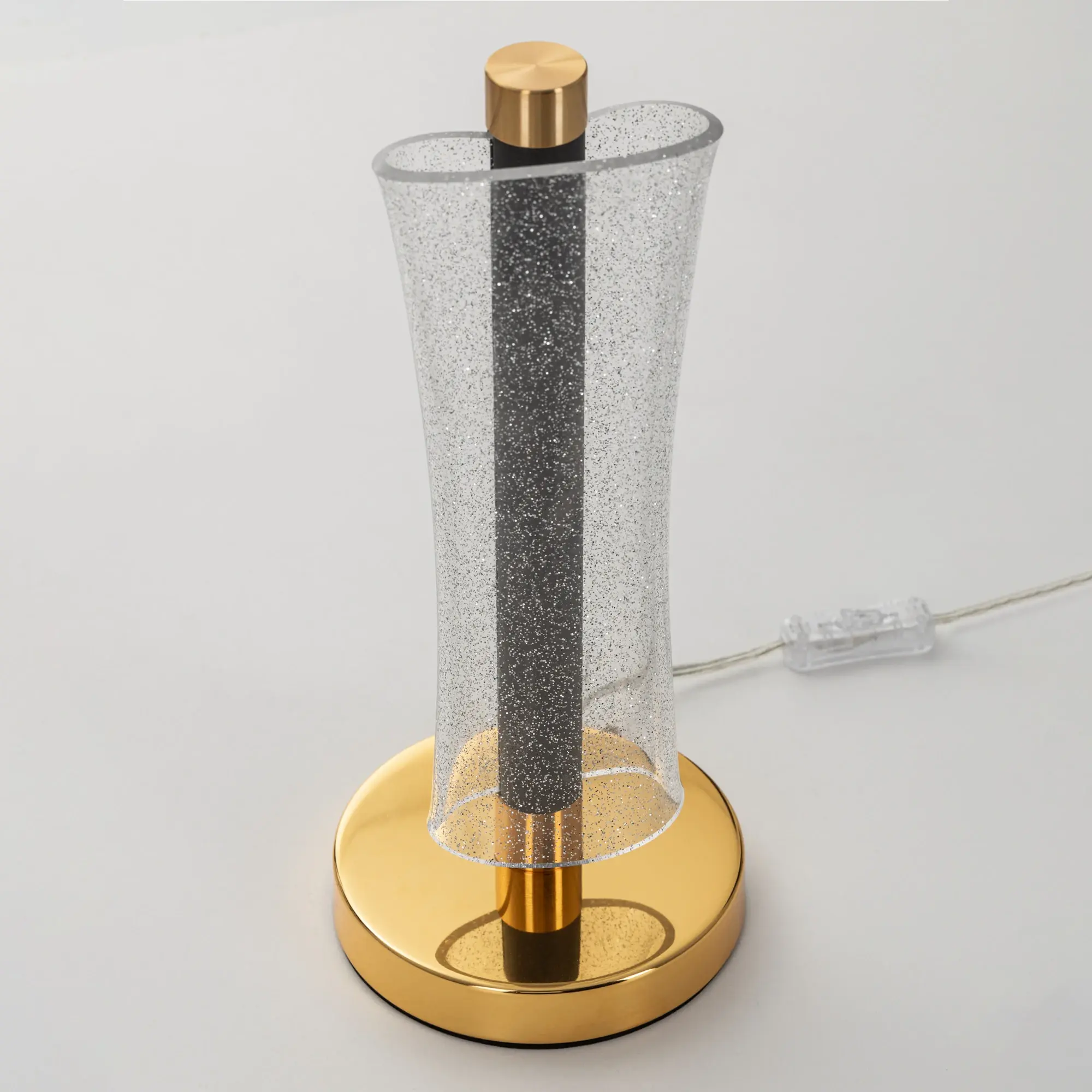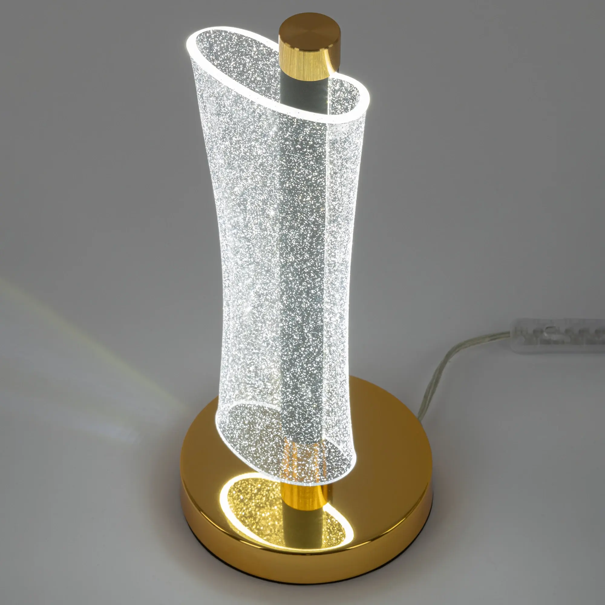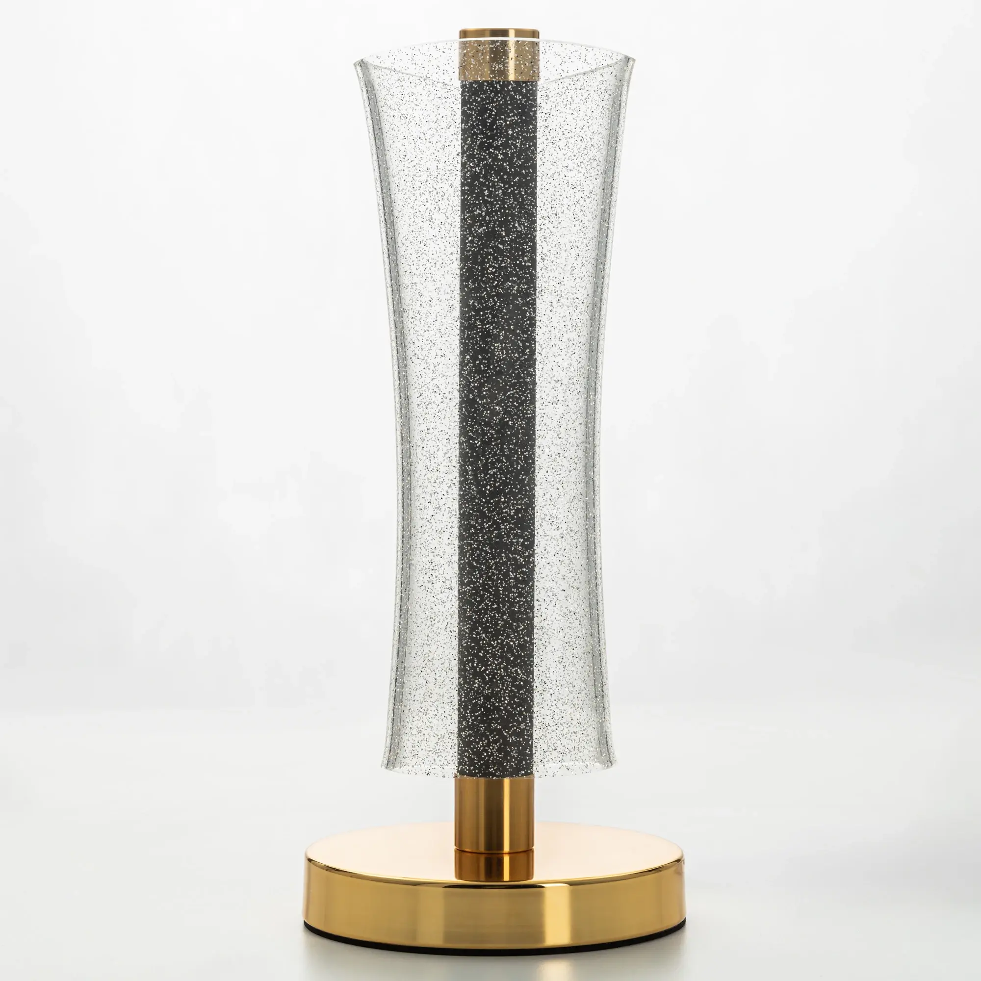 Корпус светильника металлический цвета графит, круглое основание и декоративные элементы золотого цвета. Плафон-рассеиватель выполнен из прозрачного оптического полимера с глянцевой поверхностью и вкраплениями мельчайших блесток, которые отражают свет и переливается мириадами искр, создавая эффект звёздного неба в миниатюре.