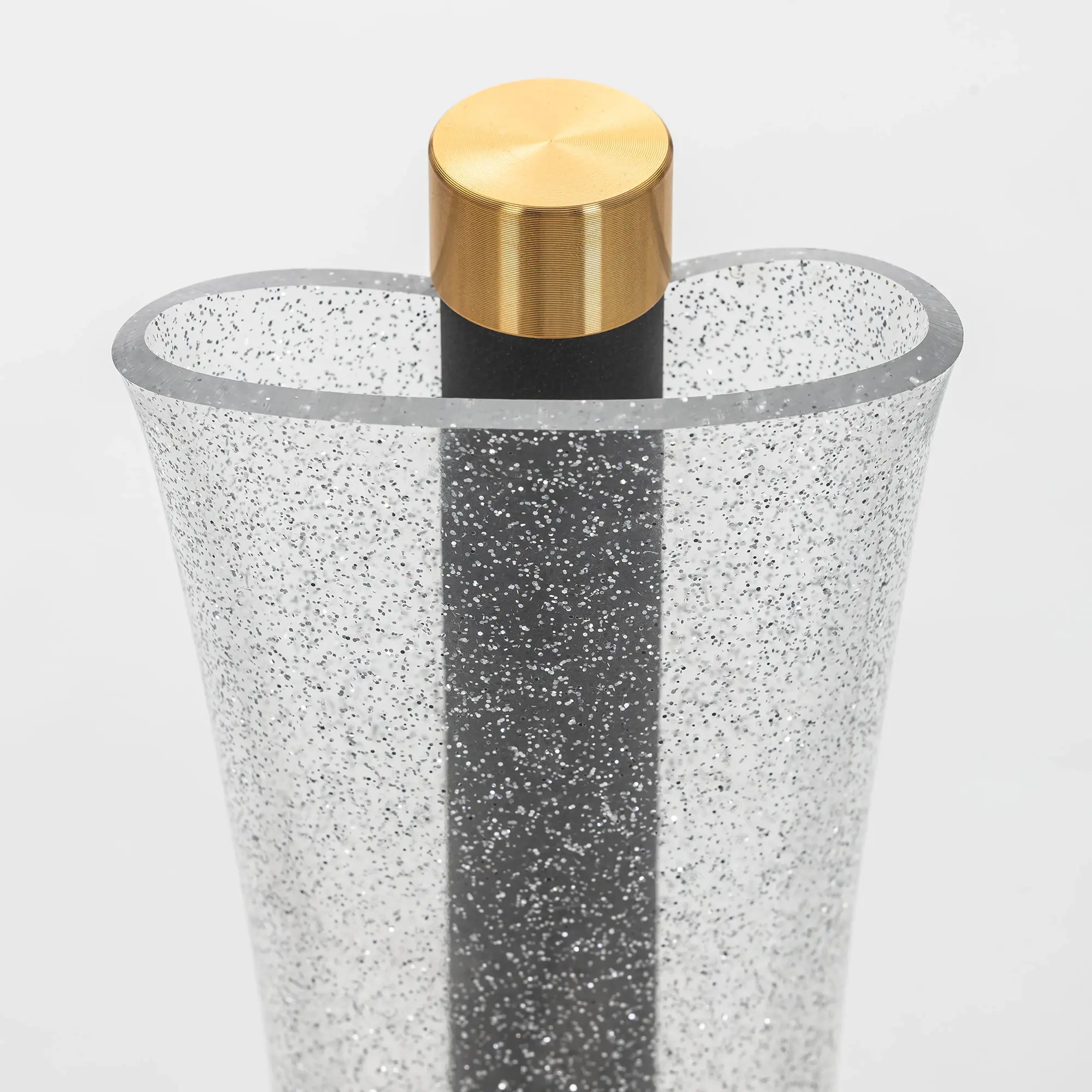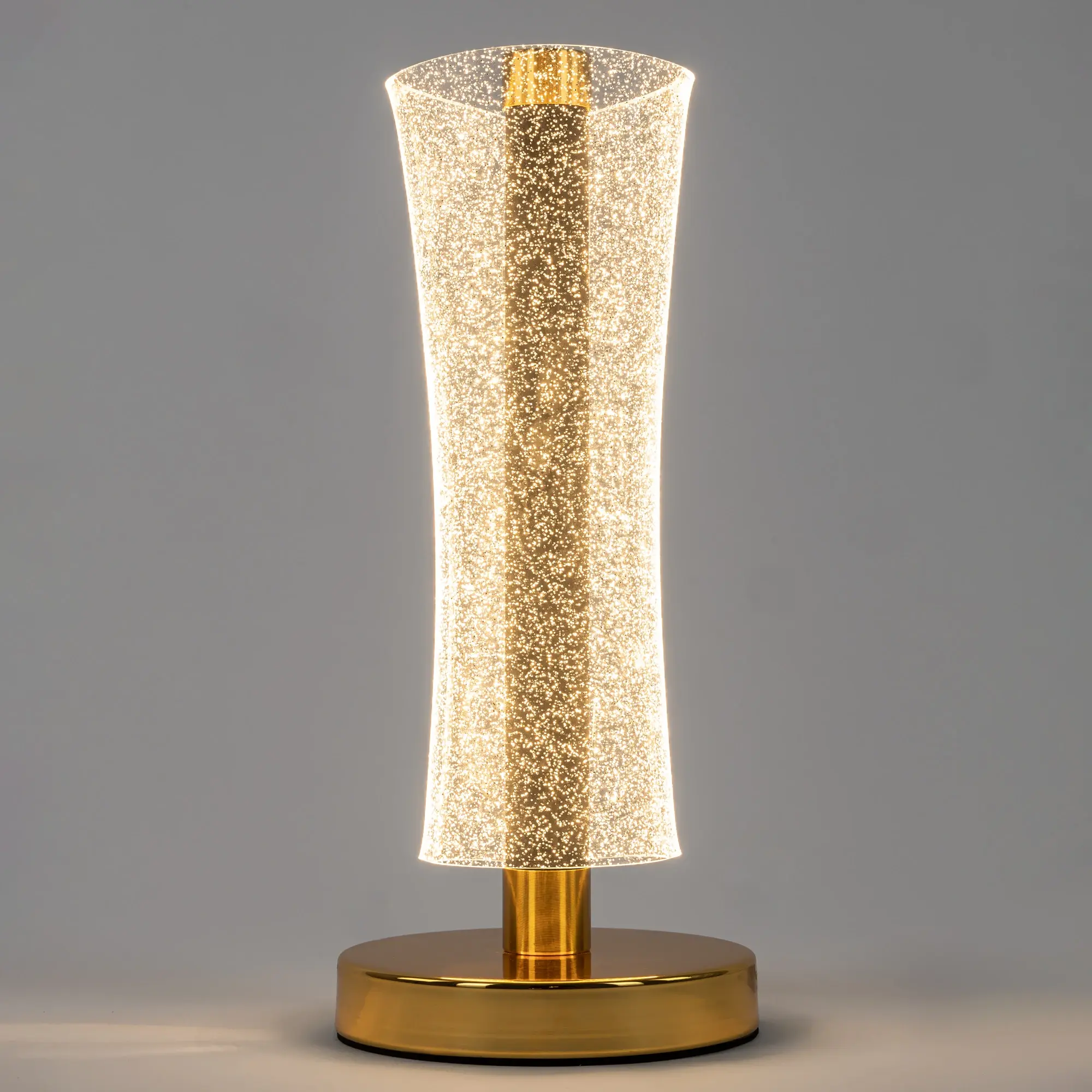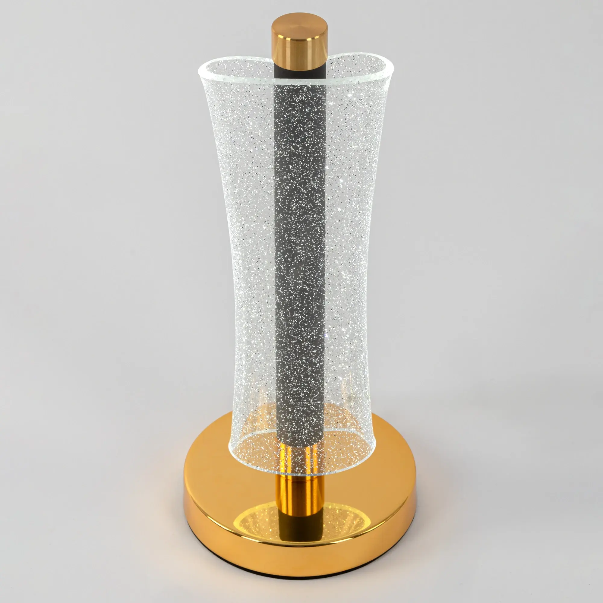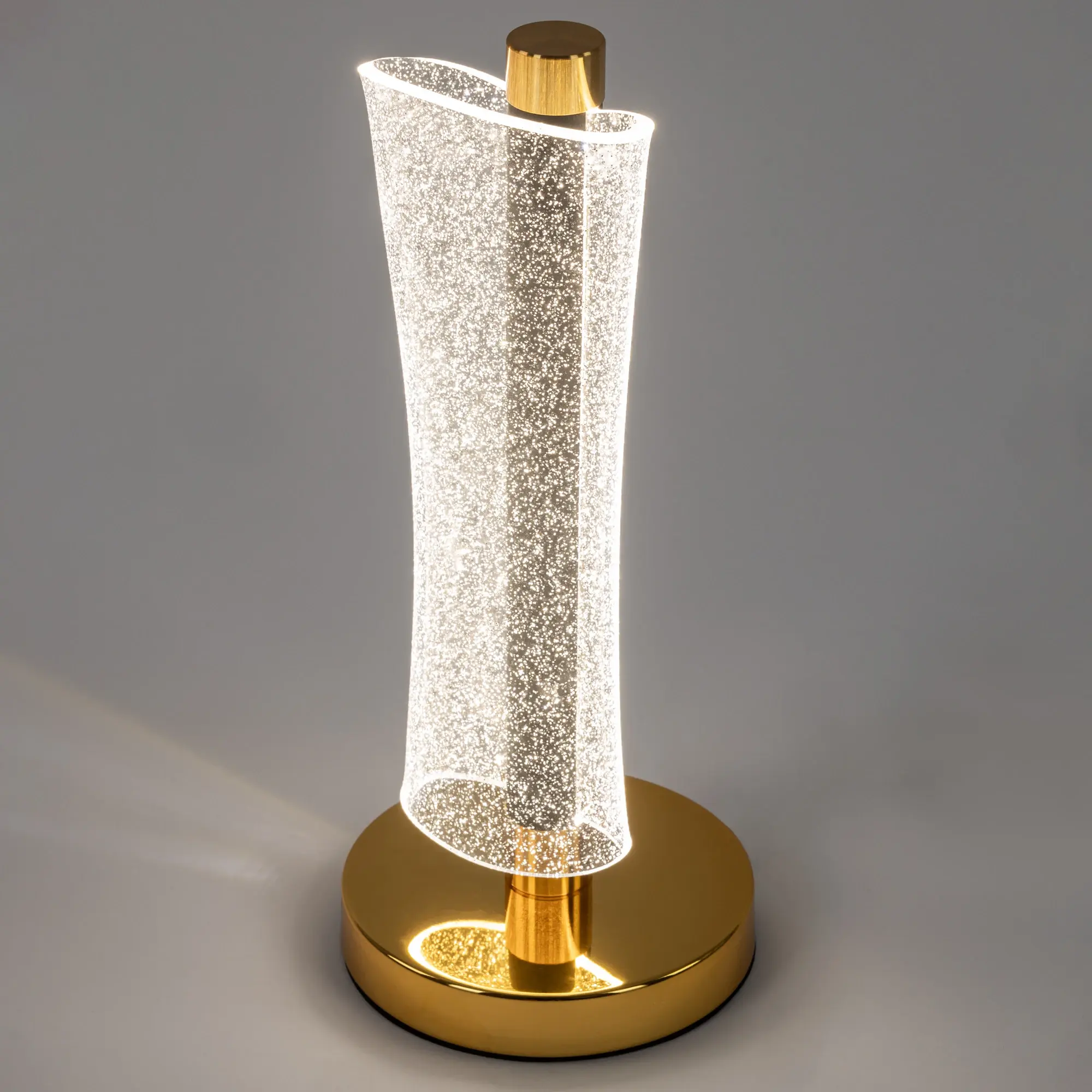 Корпус светильника металлический цвета графит, круглое основание и декоративные элементы золотого цвета. Плафон-рассеиватель выполнен из прозрачного оптического полимера с глянцевой поверхностью и вкраплениями мельчайших блесток, которые отражают свет и переливается мириадами искр, создавая эффект звёздного неба в миниатюре.