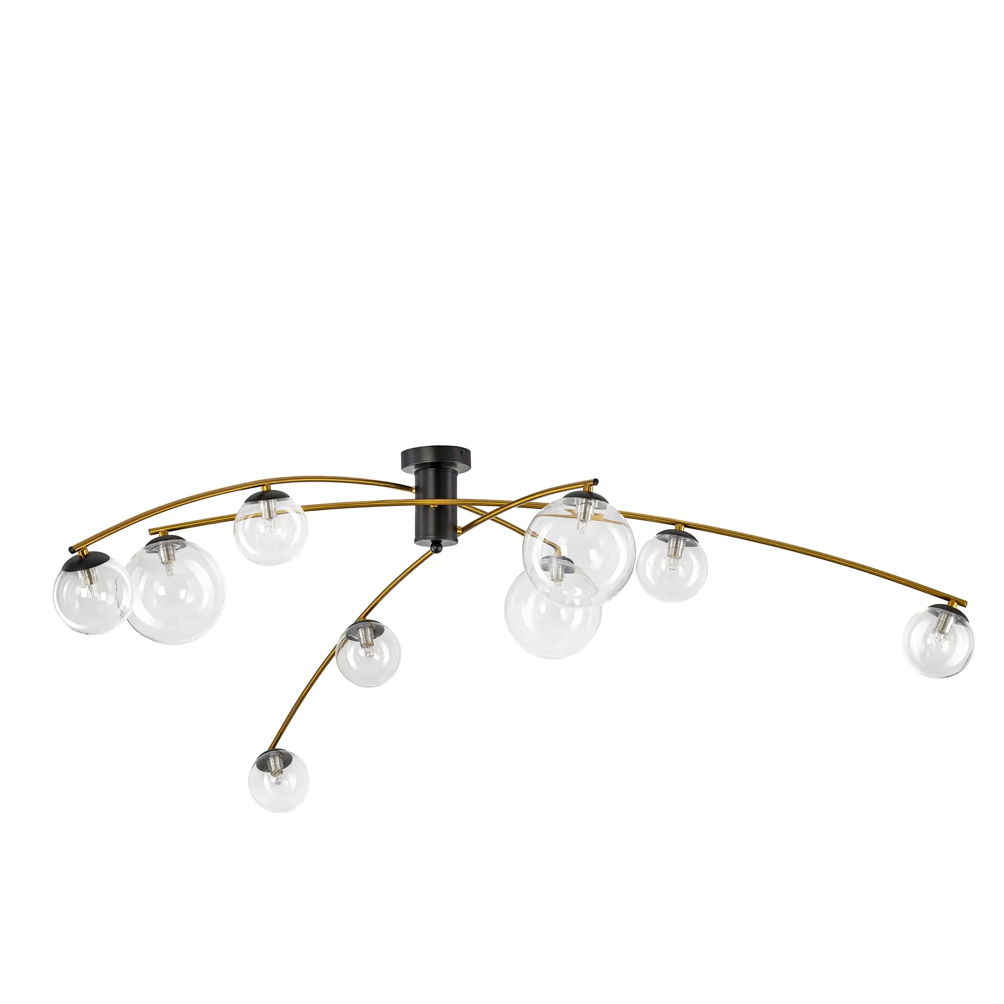 Длинные, раскидистые рожки-штанги с плафонами диаметром 10 и 15см обеспечивают равномерное освещение. Диаметр светильника 1,5м. Центральная штанга состоит из двух секций (12 и 24см), что позволяет собрать люстру в четырёх вариантах: высотой 35см, 47см, 59см и 71см. Модель подходит для установки в помещениях с низкими и высокими потолками. Тип крепления – планка.