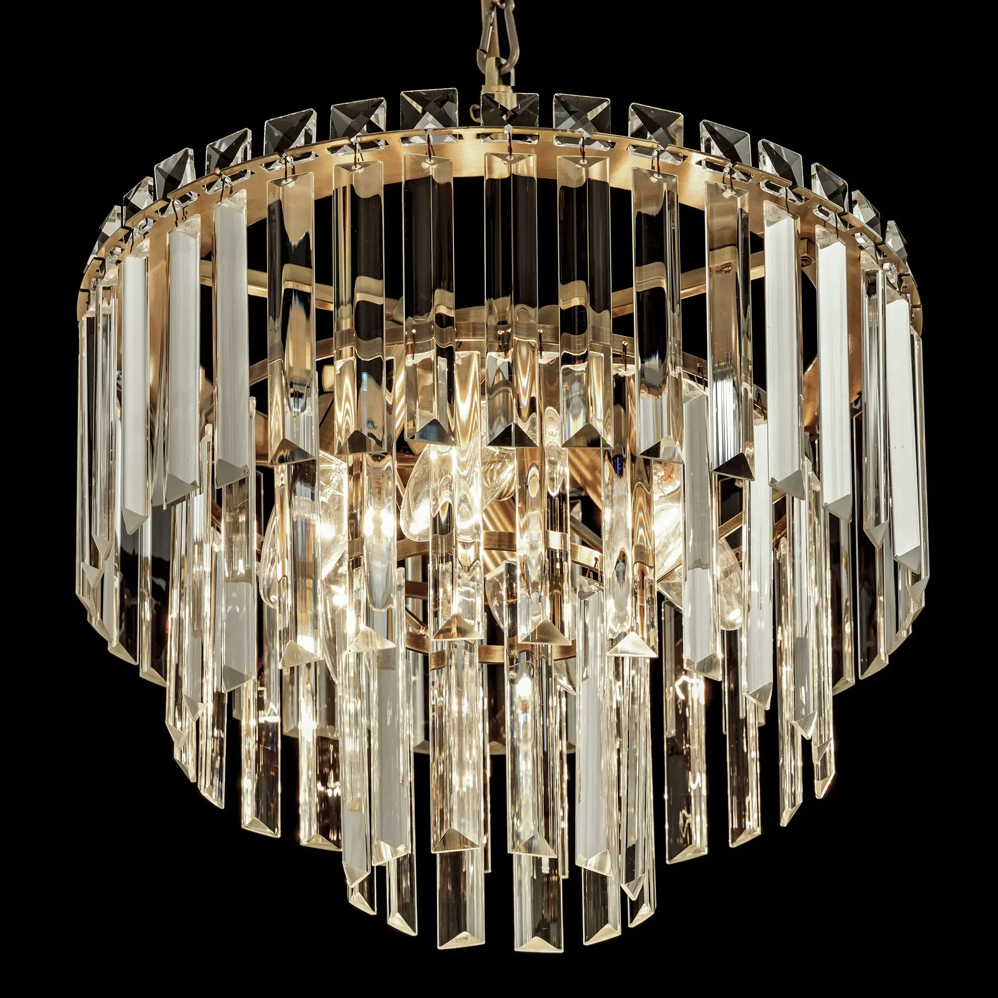Хрустальная люстра Citilux Фонда CL303163 на цепи. Корпус светильника металлический, цвет бронза. Хрустальные элементы, прозрачные, с модной огранкой «призма». В светильнике используются 6 ламп с цоколем Е14, максимальной мощностью для ламп накаливания 60Вт, светодиодные лампы можно использовать более яркие. Изделие подходит для помещений как с высокими, так и с низкими потолками, длина цепи регулируется при установке. Светильник подходит для всех типов потолков, в том числе натяжных, тип крепления – планка. Подвесная люстра Citilux Фонда CL303163 отлично подойдет для освещения интерьеров, оформленных в современном и классическом стиле.