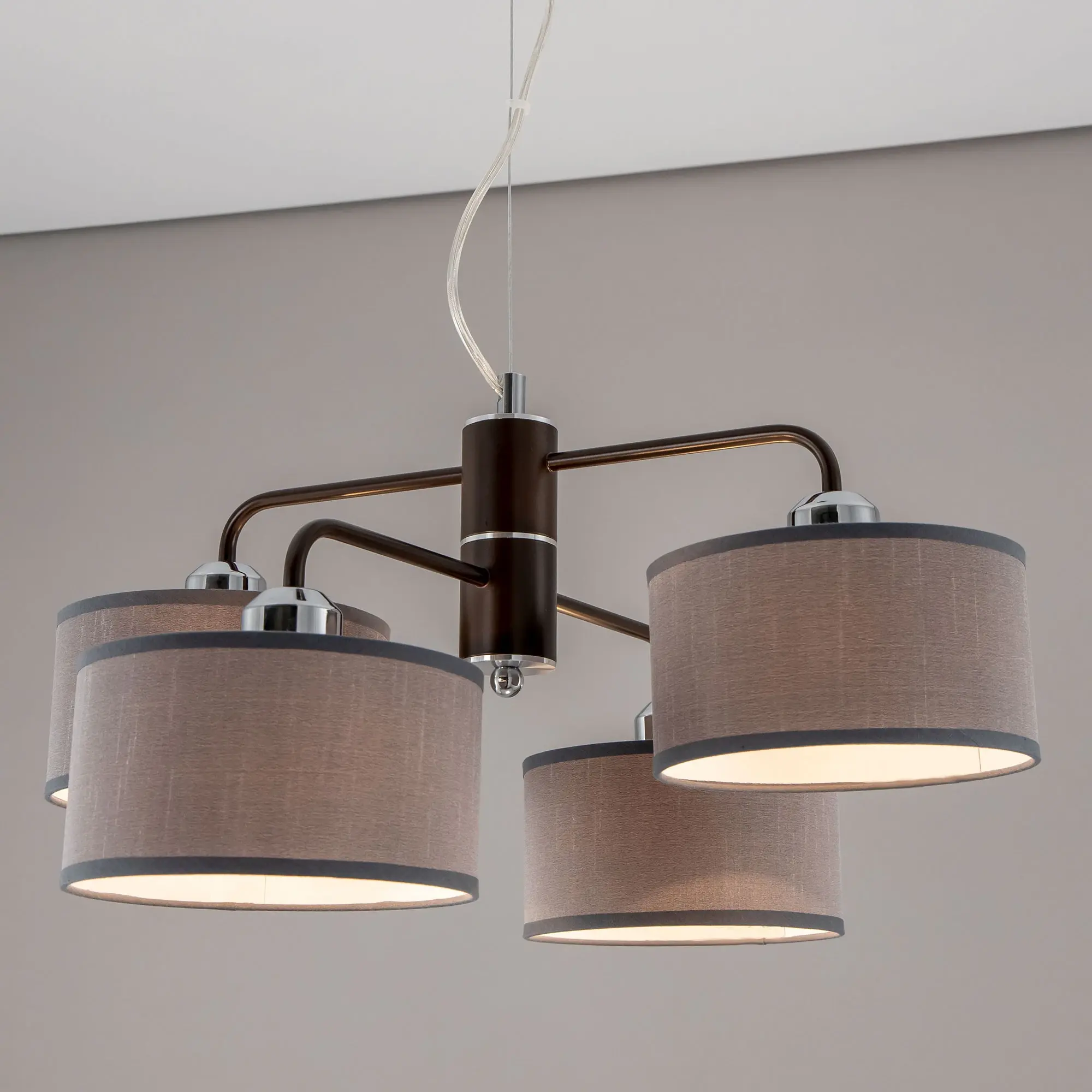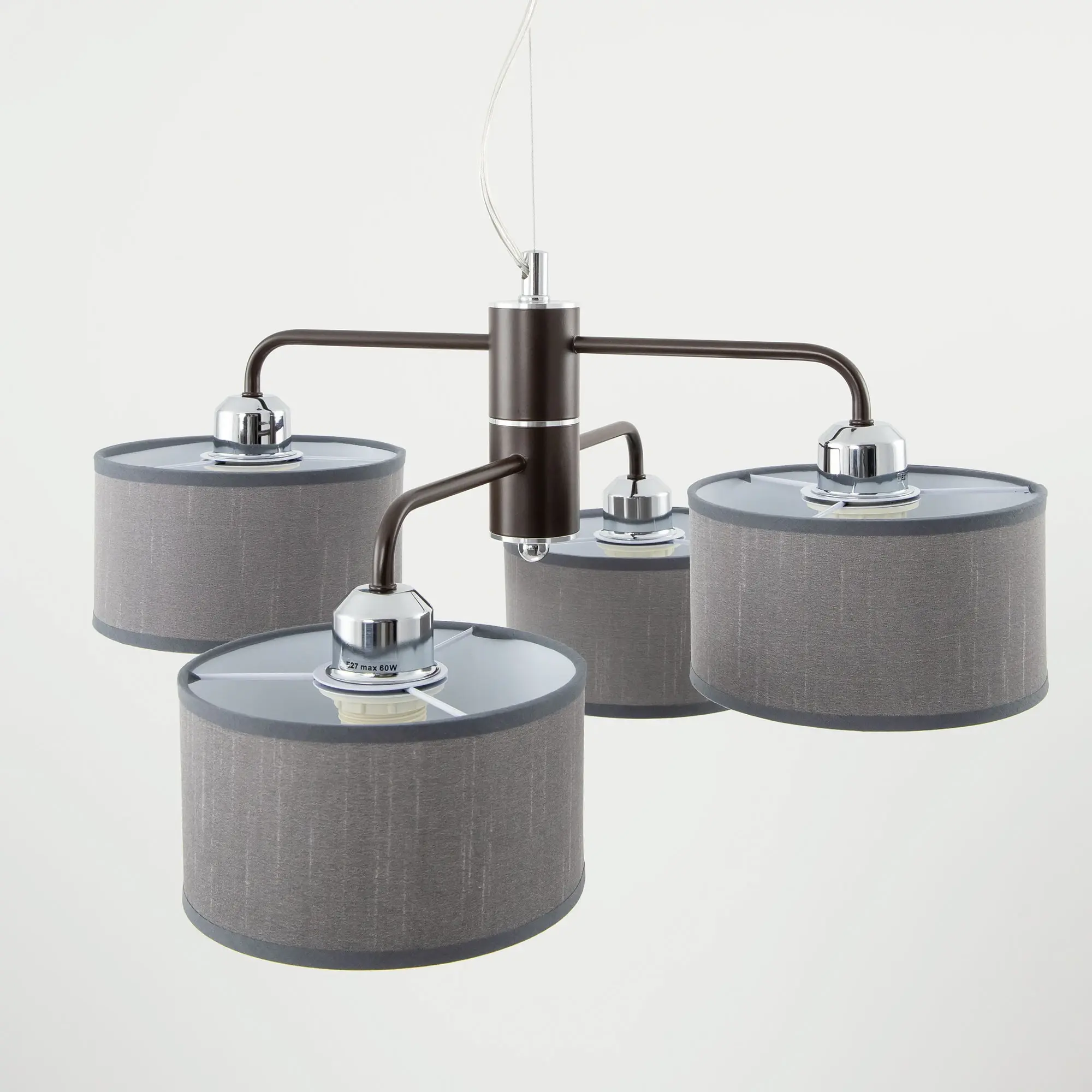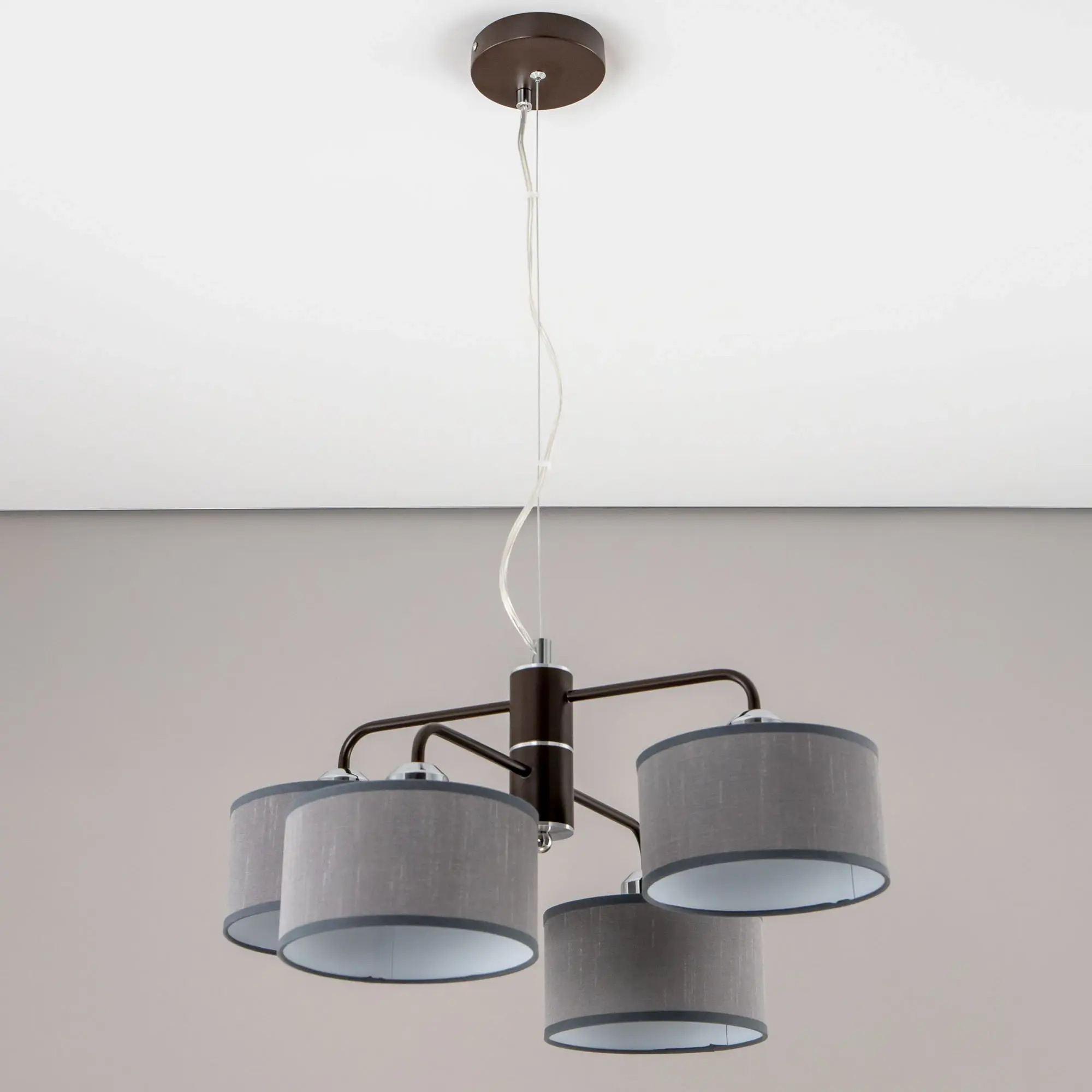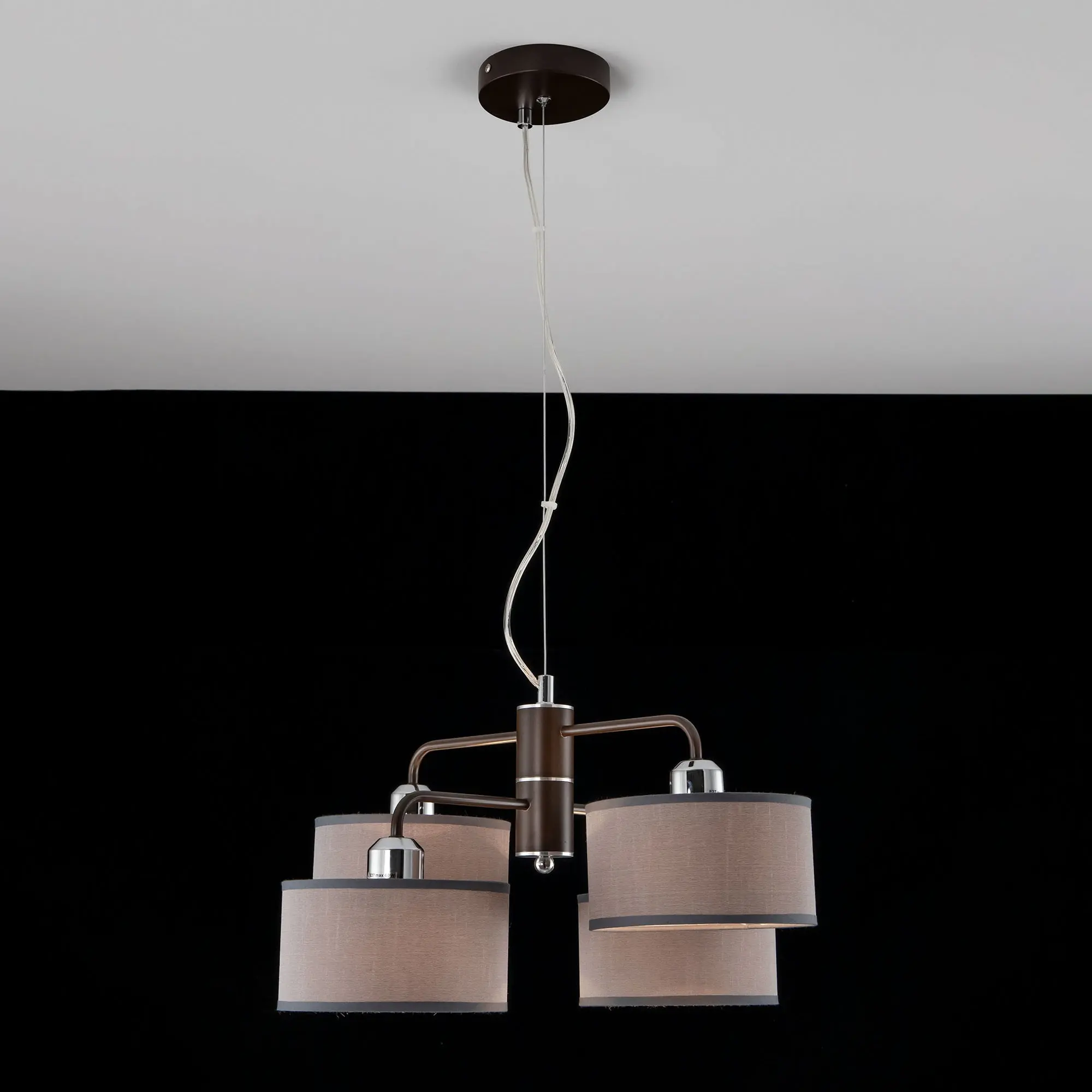 Подвесная люстра Citilux Форма CL428241 для современных интерьеров. Корпус светильника металлический, цвет венге (коричневый), с декоративными хромированными элементами. Абажуры цилиндрической формы, из текстурной ткани серого цвета, на подложке из оптического полимера. Размеры абажура: диаметр 12см, высота 10см. В изделии используются лампы с цоколем Е27, максимальной мощностью для ламп накаливания 60Вт. Светодиодные лампы можно использовать более яркие. Диаметр модели 44см, высота регулируется в диапазоне от 32см до 123см. Тип крепления к потолку – планка.,