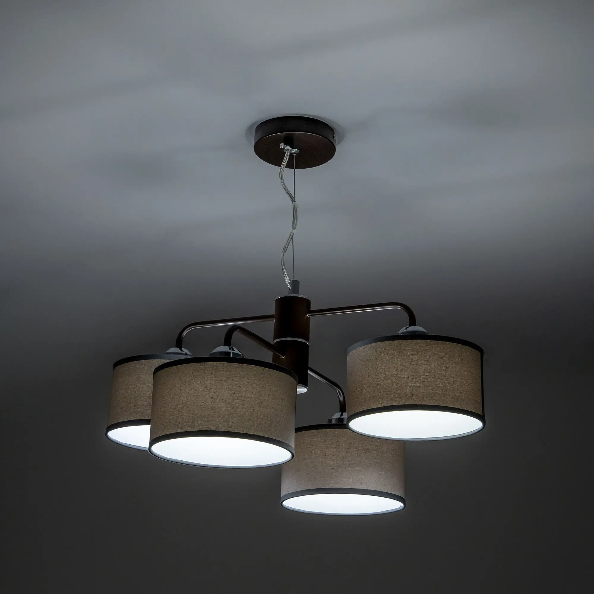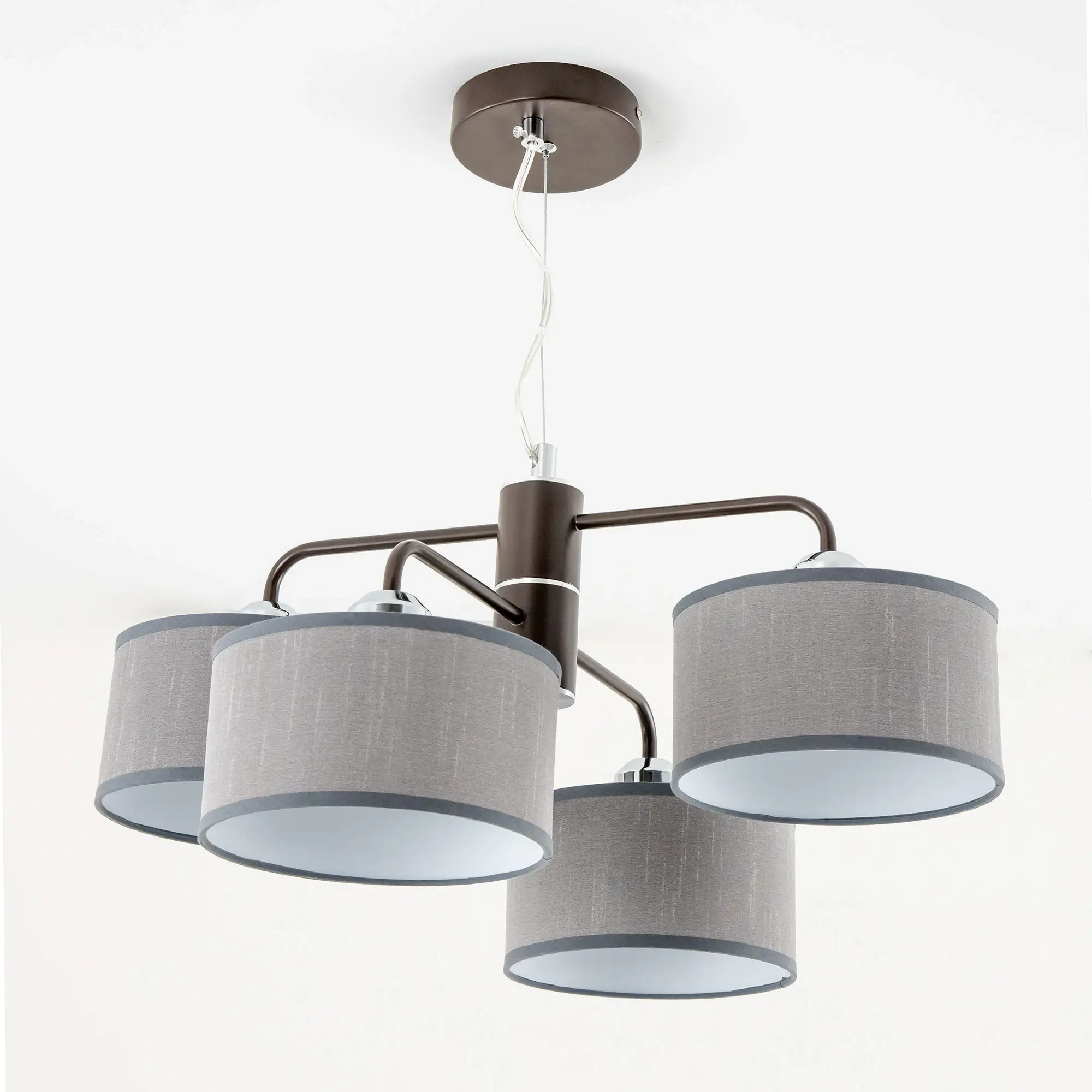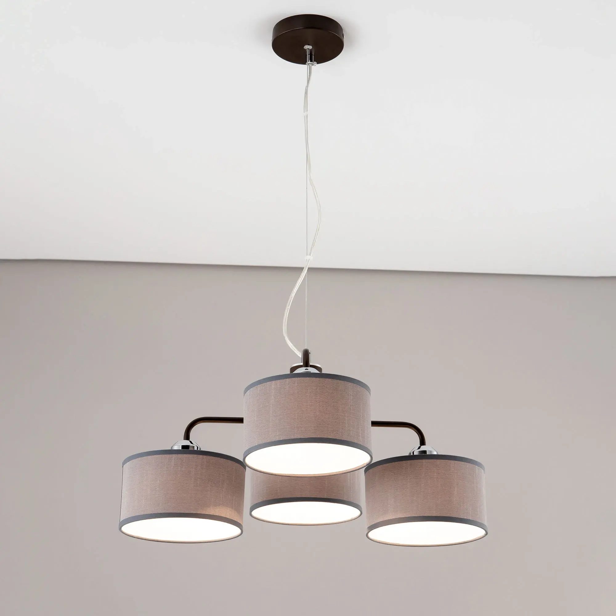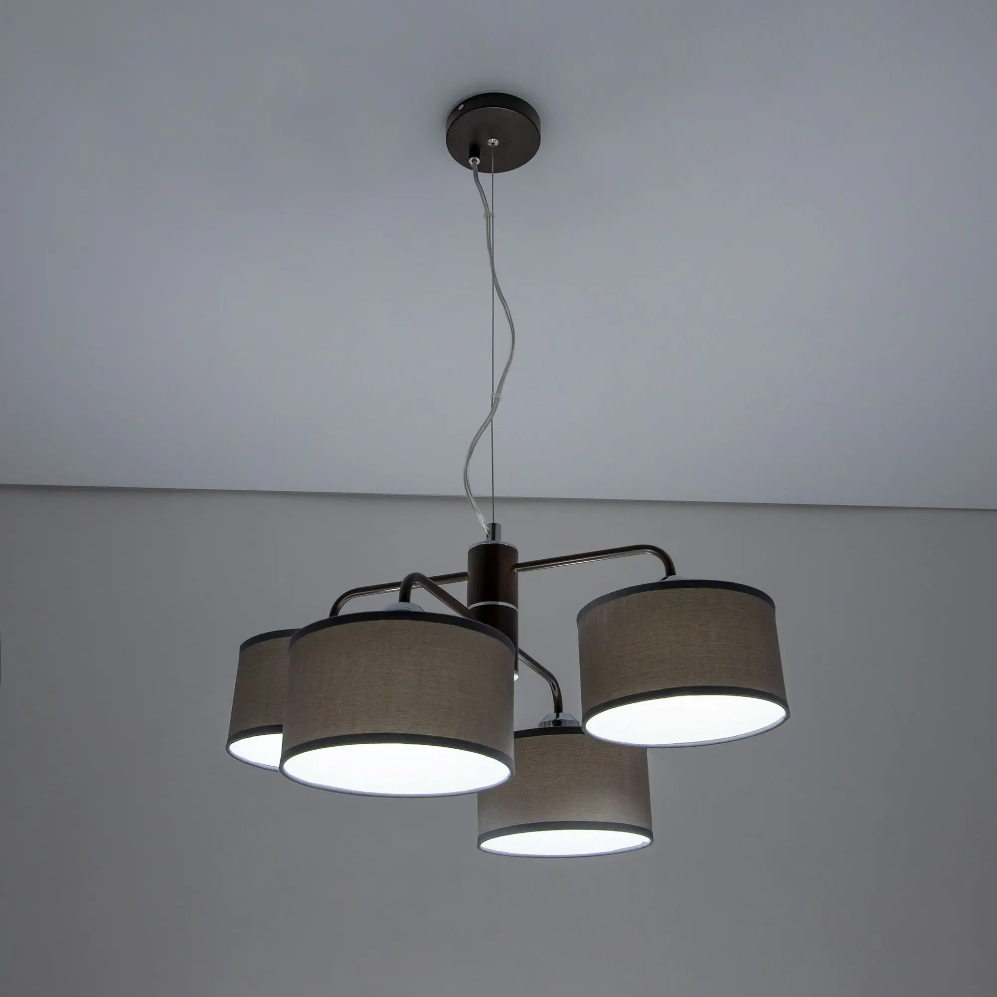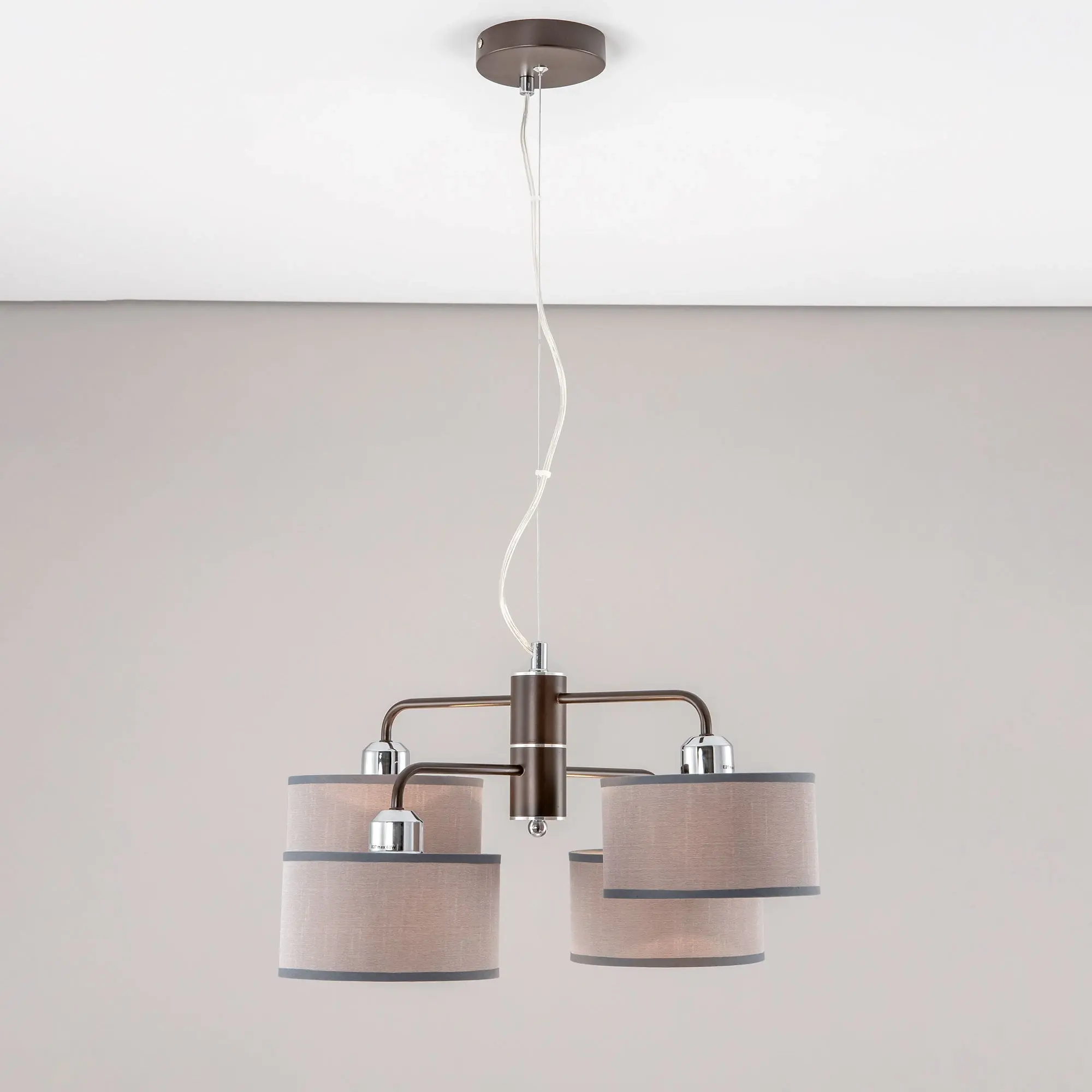 Подвесная люстра Citilux Форма CL428241 для современных интерьеров. Корпус светильника металлический, цвет венге (коричневый), с декоративными хромированными элементами. Абажуры цилиндрической формы, из текстурной ткани серого цвета, на подложке из оптического полимера. Размеры абажура: диаметр 12см, высота 10см. В изделии используются лампы с цоколем Е27, максимальной мощностью для ламп накаливания 60Вт. Светодиодные лампы можно использовать более яркие. Диаметр модели 44см, высота регулируется в диапазоне от 32см до 123см. Тип крепления к потолку – планка.,