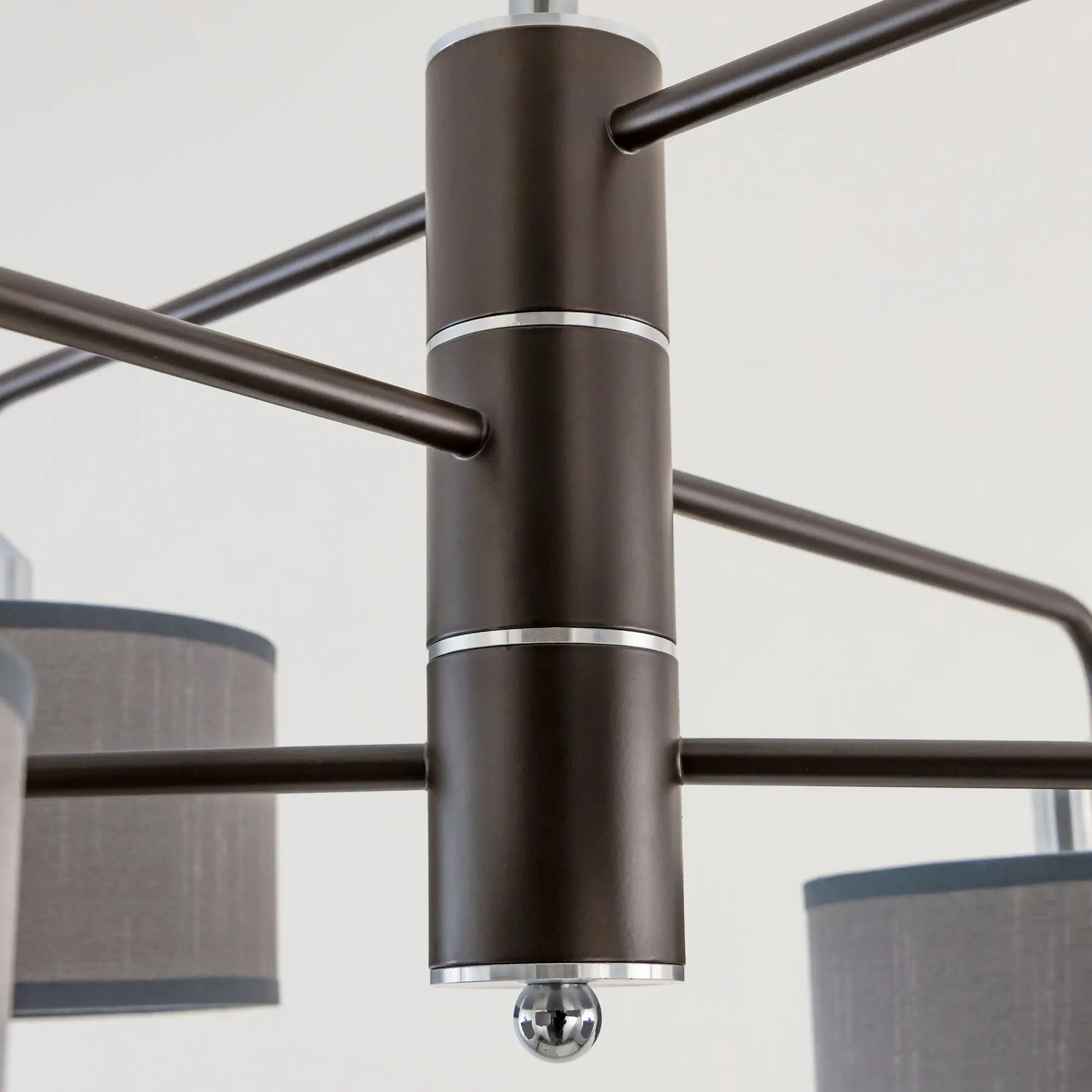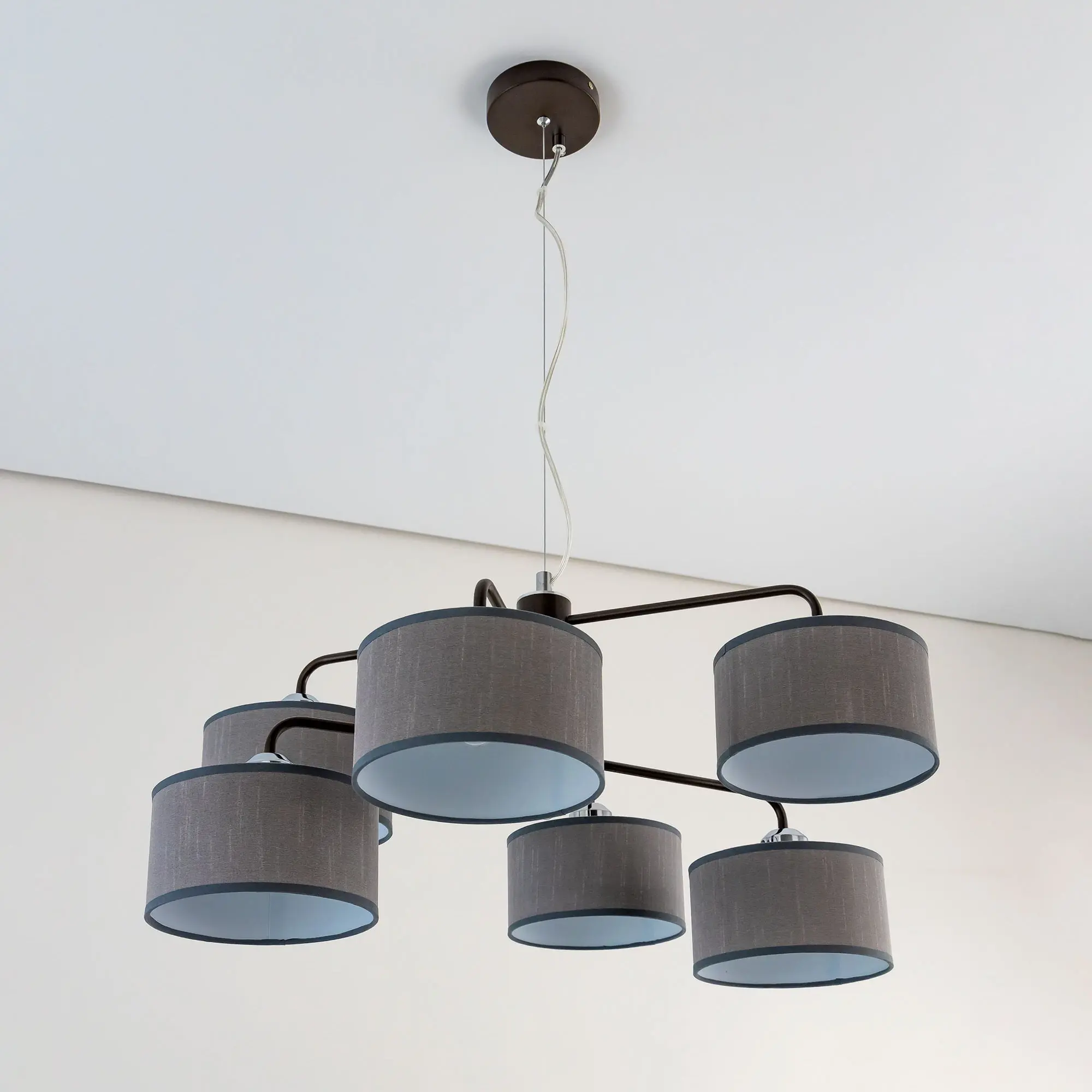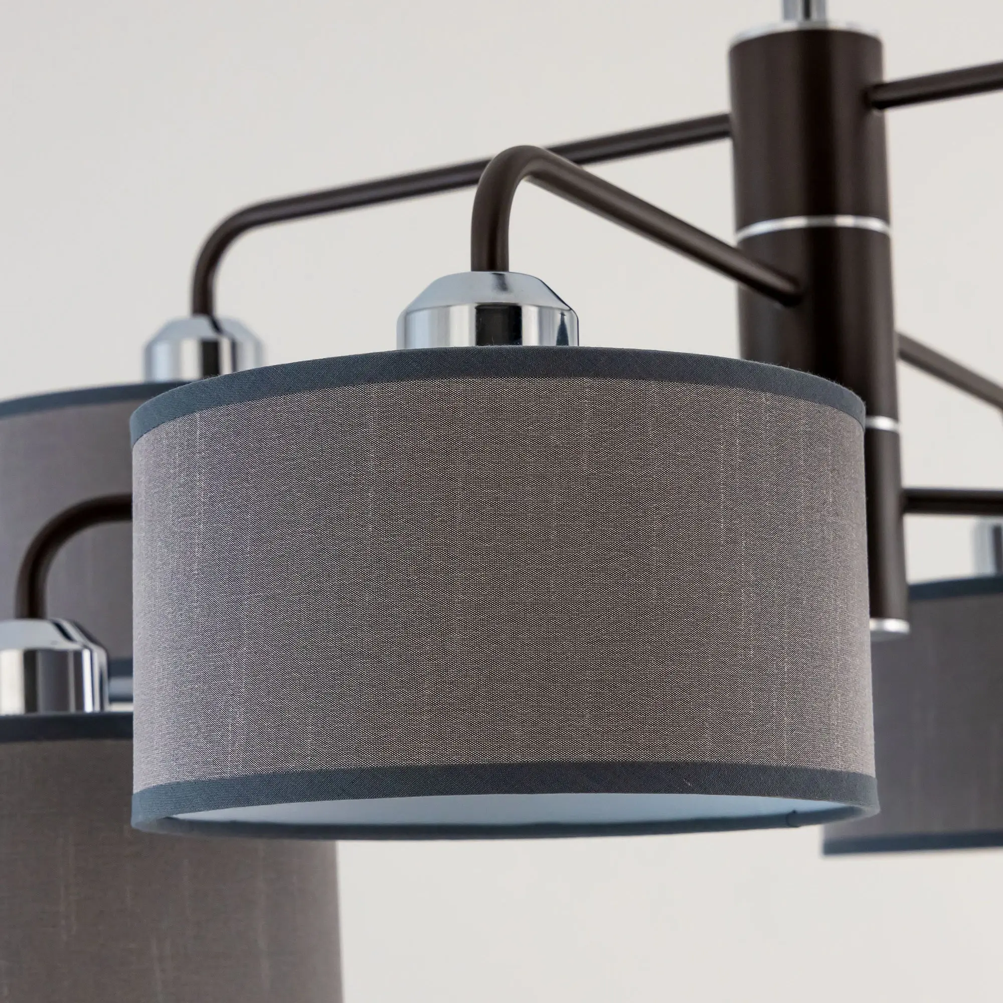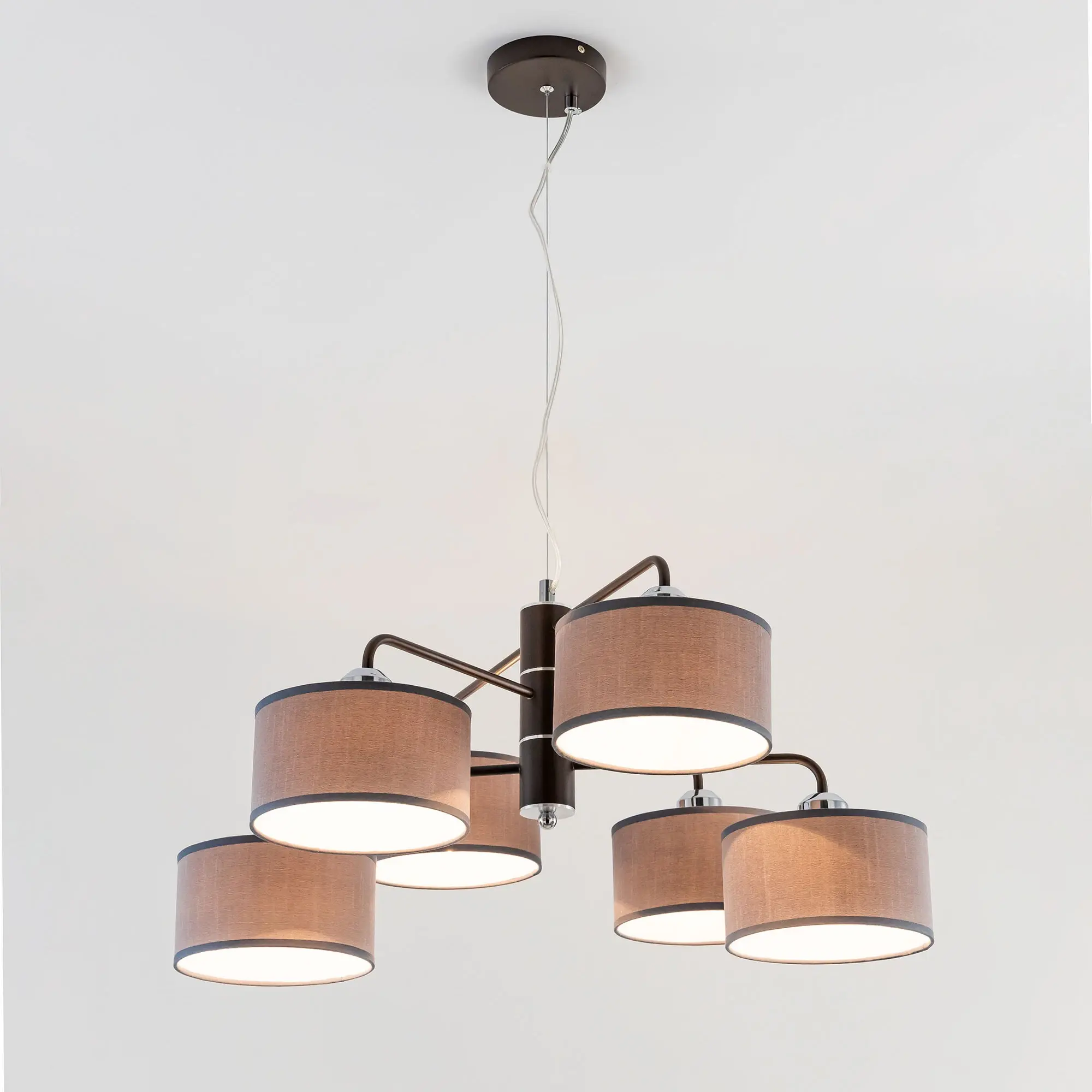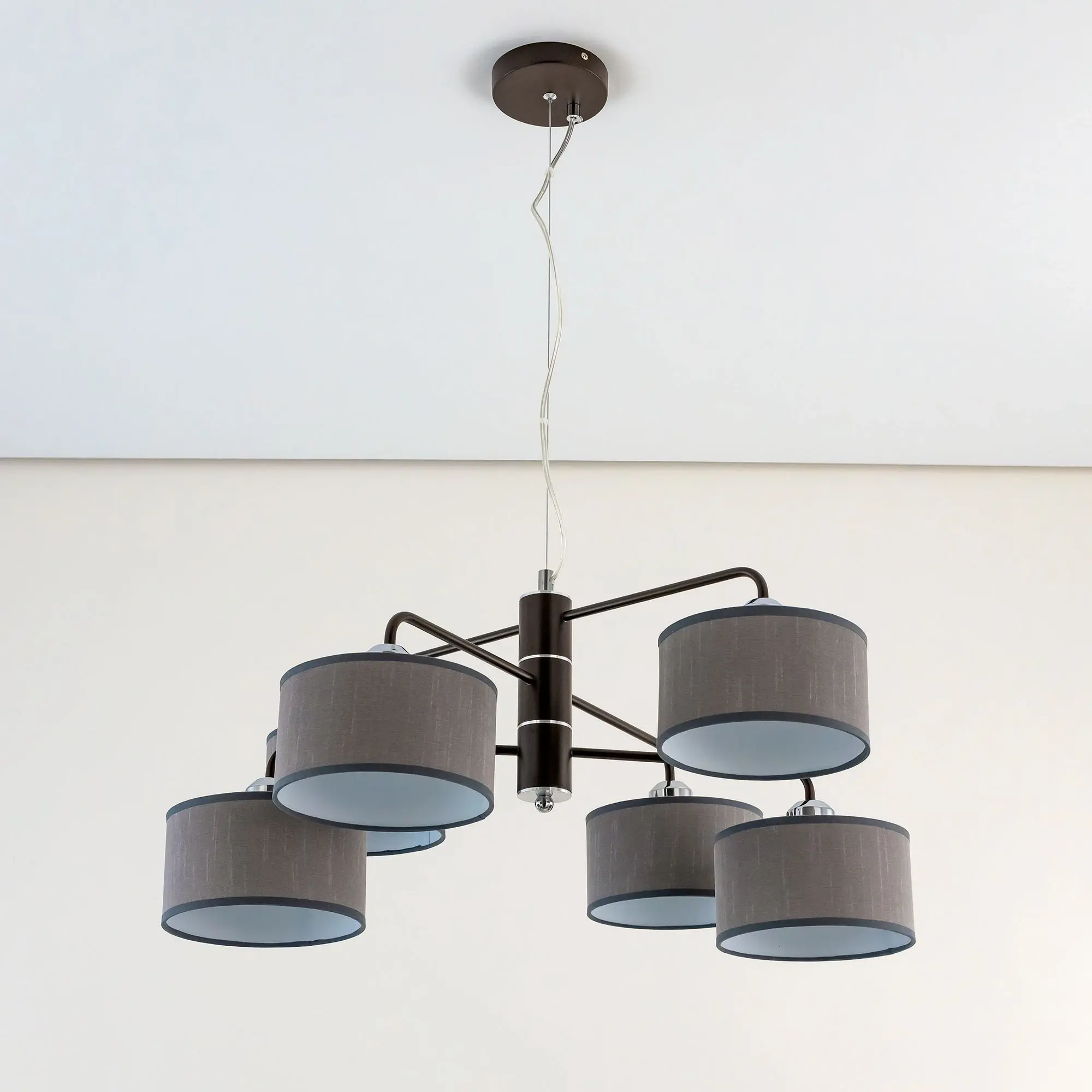 Подвесная люстра Citilux Форма CL428261 для современных интерьеров. Корпус светильника металлический, цвет венге (коричневый), с декоративными хромированными элементами. Абажуры цилиндрической формы, из текстурной ткани серого цвета, на подложке из оптического полимера. Размеры абажура: диаметр 12см, высота 10см. В изделии используются 6 ламп с цоколем Е27, максимальной мощностью для ламп накаливания 60Вт. Светодиодные лампы можно использовать более яркие. Осветит около 16м². Тип крепления к потолку – планка.,